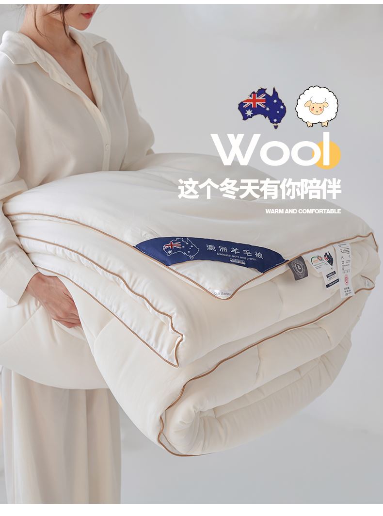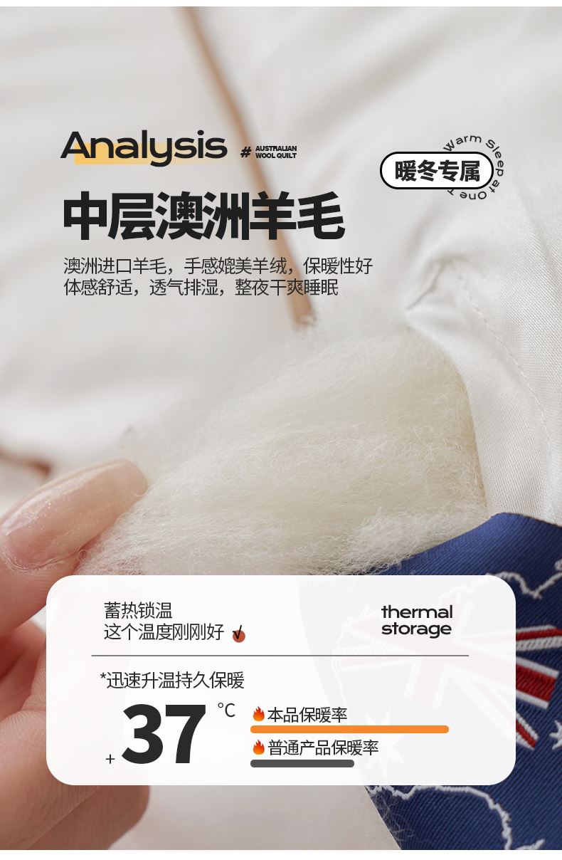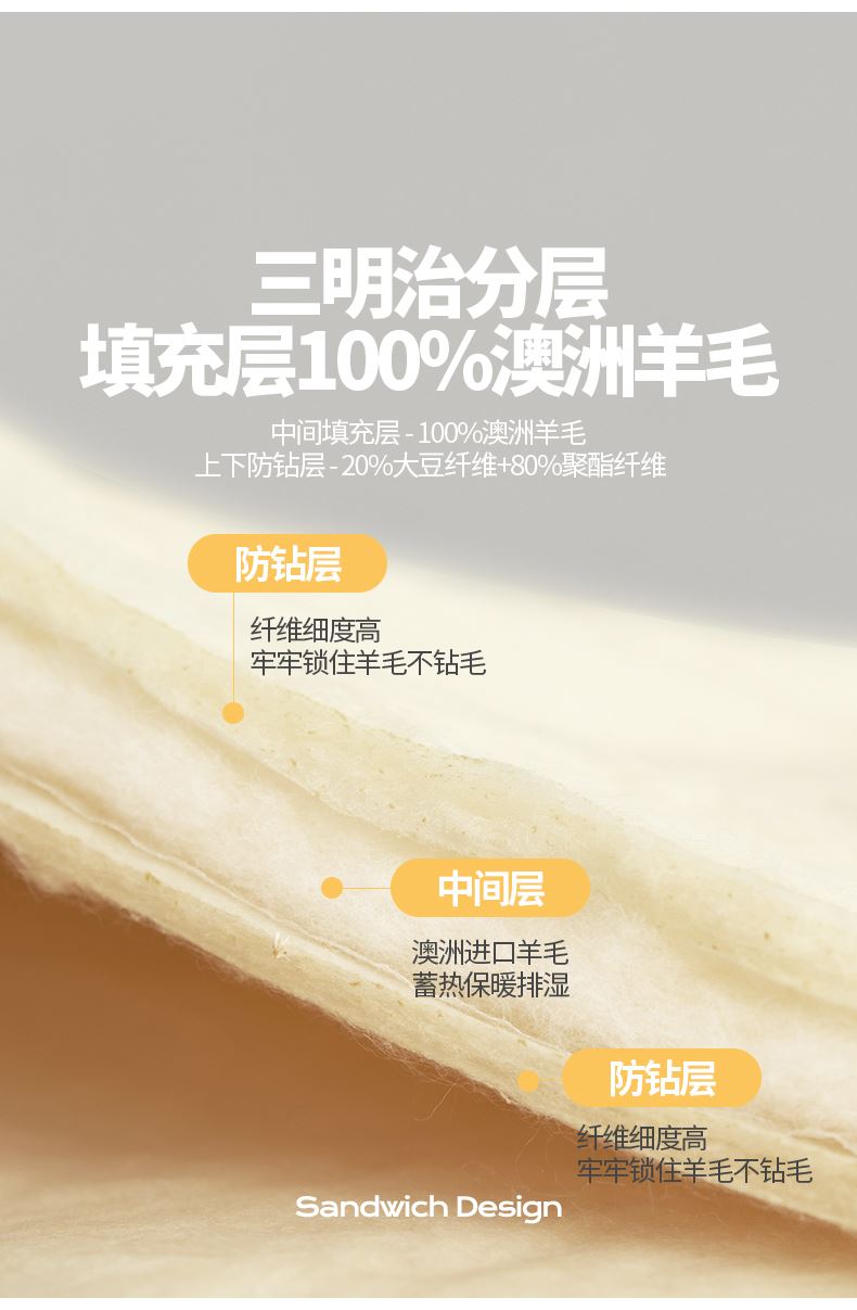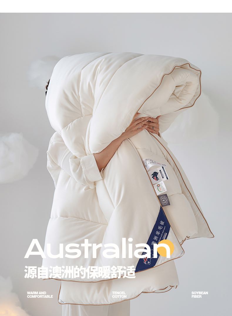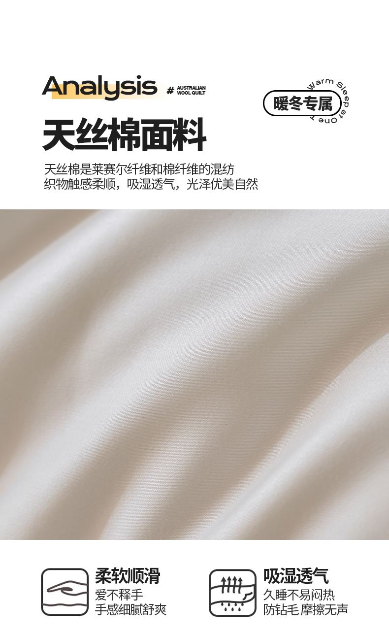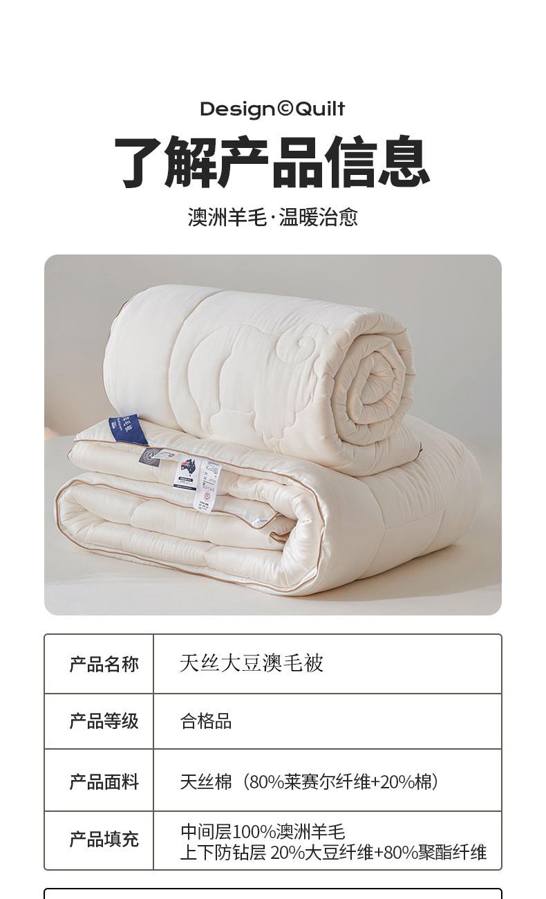 面料:天丝棉(80%莱赛尔纤维+20%棉) 填充:中间层:澳洲羊毛 上下防钻层: 20%大豆纤维+80%聚酯纤维 规格:200cm*230cm 总重量:3200g 包装:精美软包 澳洲进口羊毛,手感媲美羊绒,保暖性好体感舒适,透气排湿,整夜干爽睡眠,填充上下防砖层填充20%大豆纤维,保暖透气,面料更是采用高品天丝棉面料,丝滑轻柔,整条被芯呵护一整个冬季。
