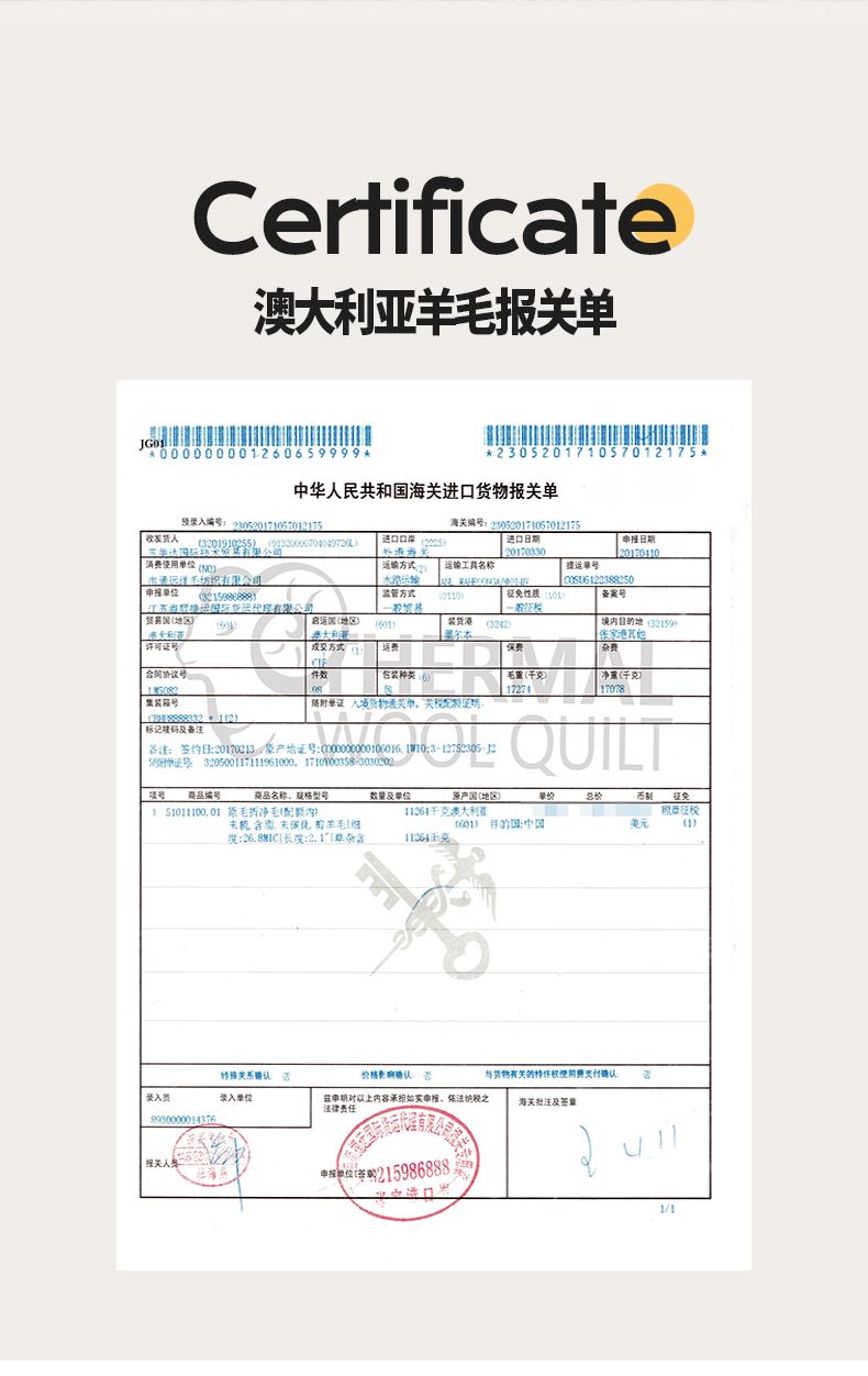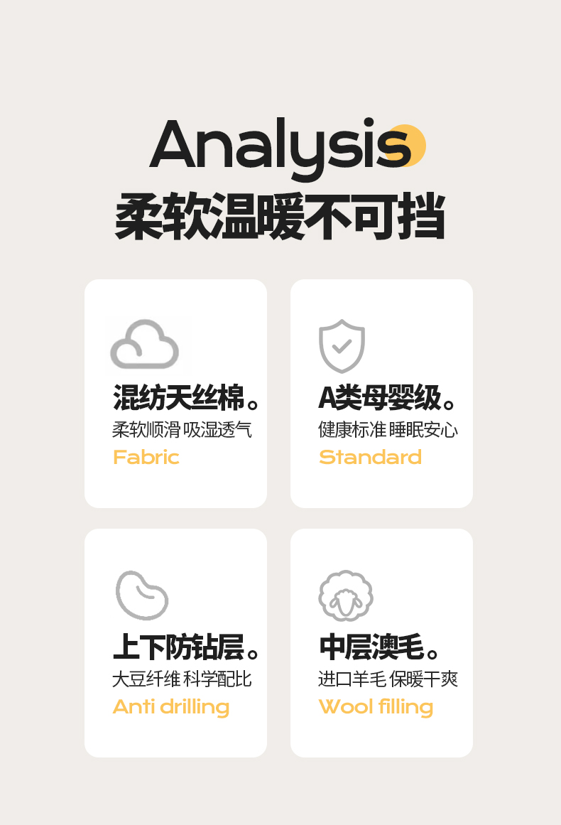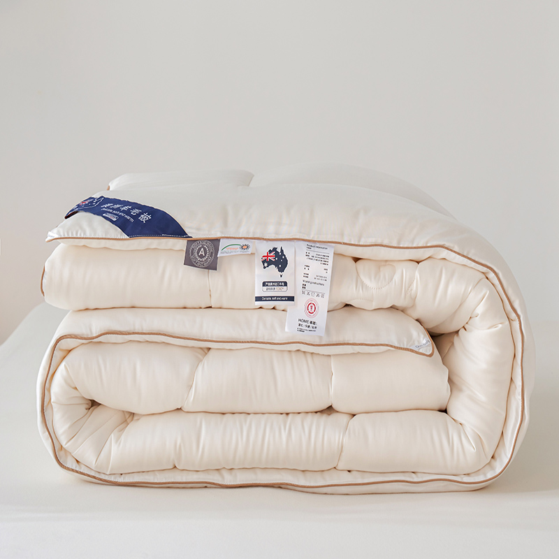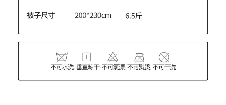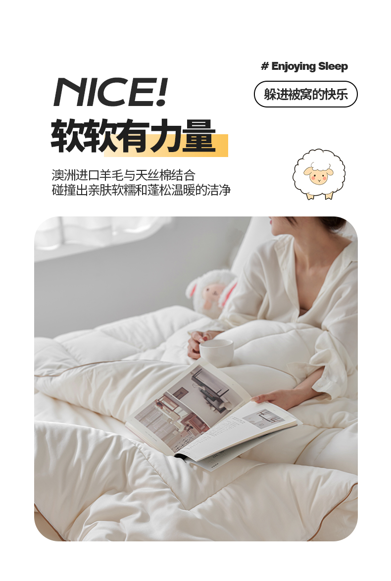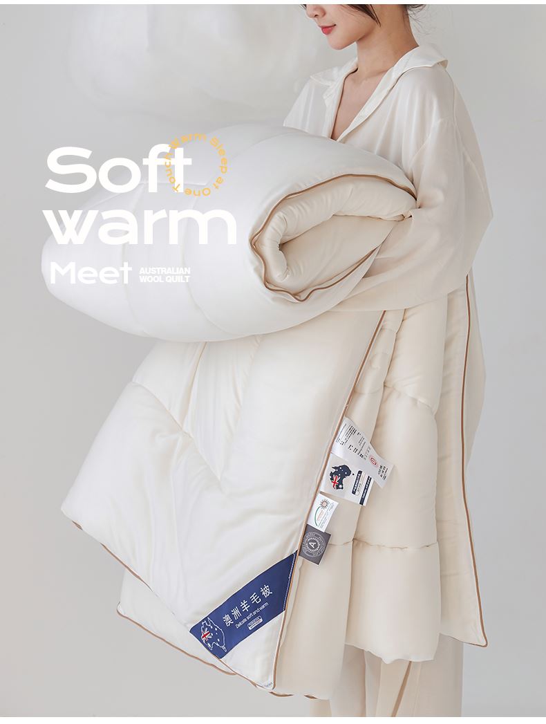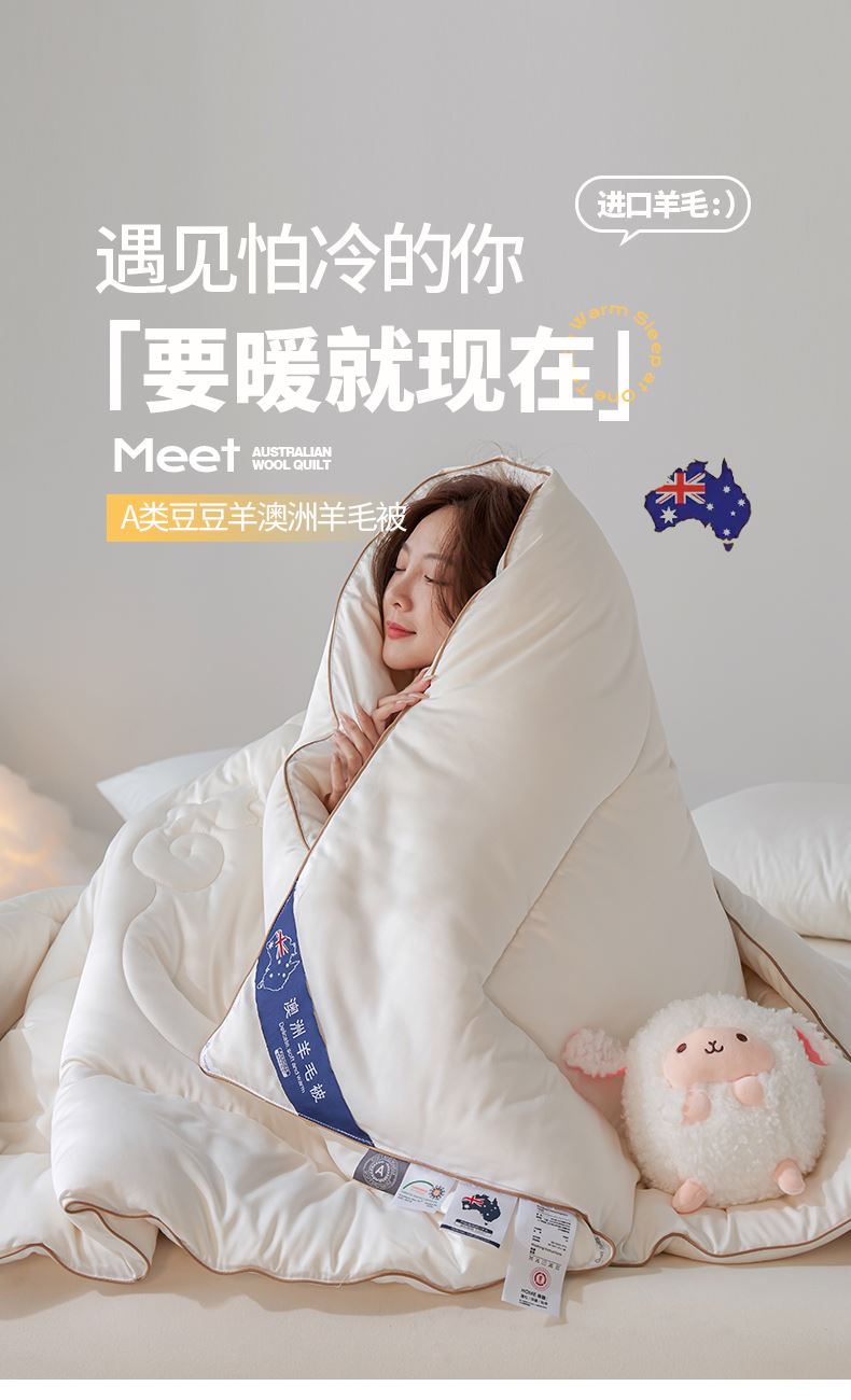 面料:天丝棉(80%莱赛尔纤维+20%棉) 填充:中间层:澳洲羊毛 上下防钻层: 20%大豆纤维+80%聚酯纤维 规格:200cm*230cm 总重量:3200g 包装:精美软包 澳洲进口羊毛,手感媲美羊绒,保暖性好体感舒适,透气排湿,整夜干爽睡眠,填充上下防砖层填充20%大豆纤维,保暖透气,面料更是采用高品天丝棉面料,丝滑轻柔,整条被芯呵护一整个冬季。
