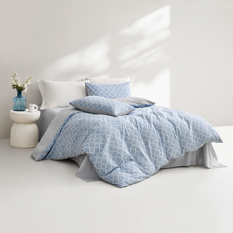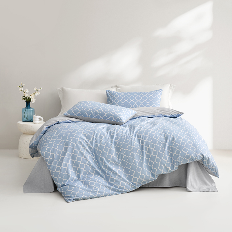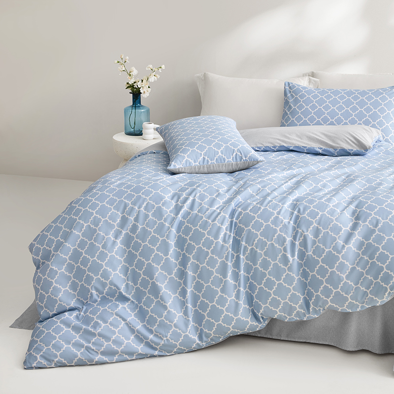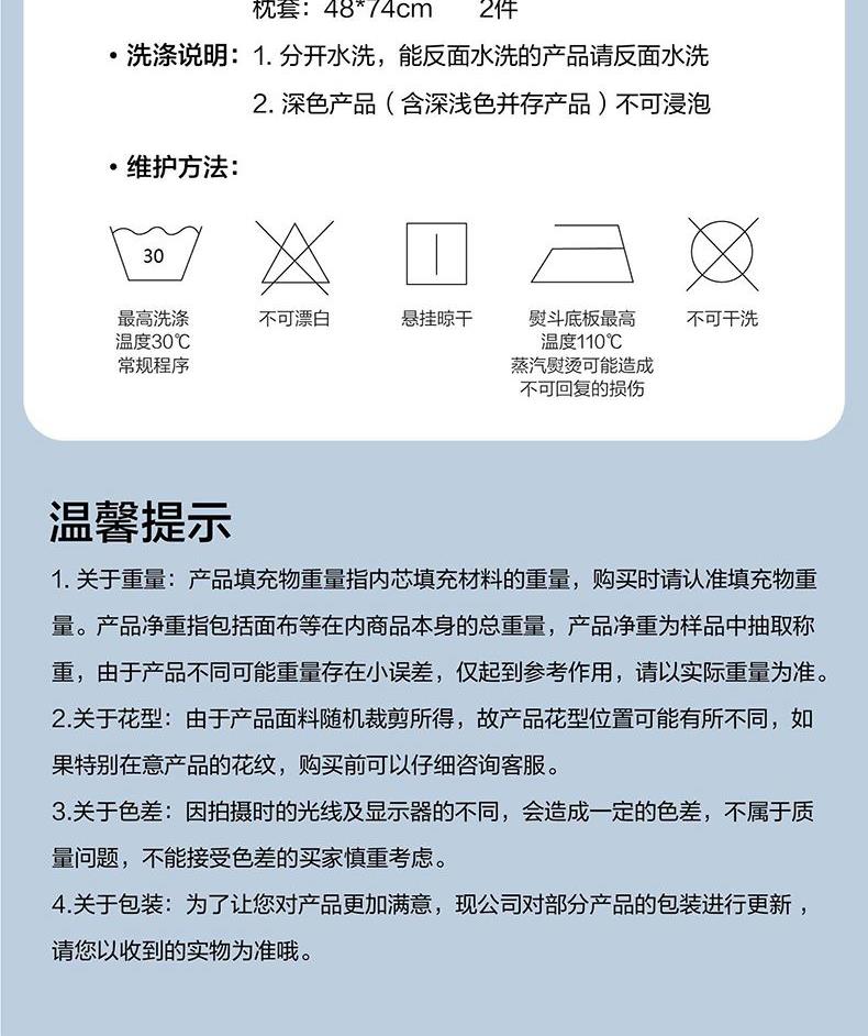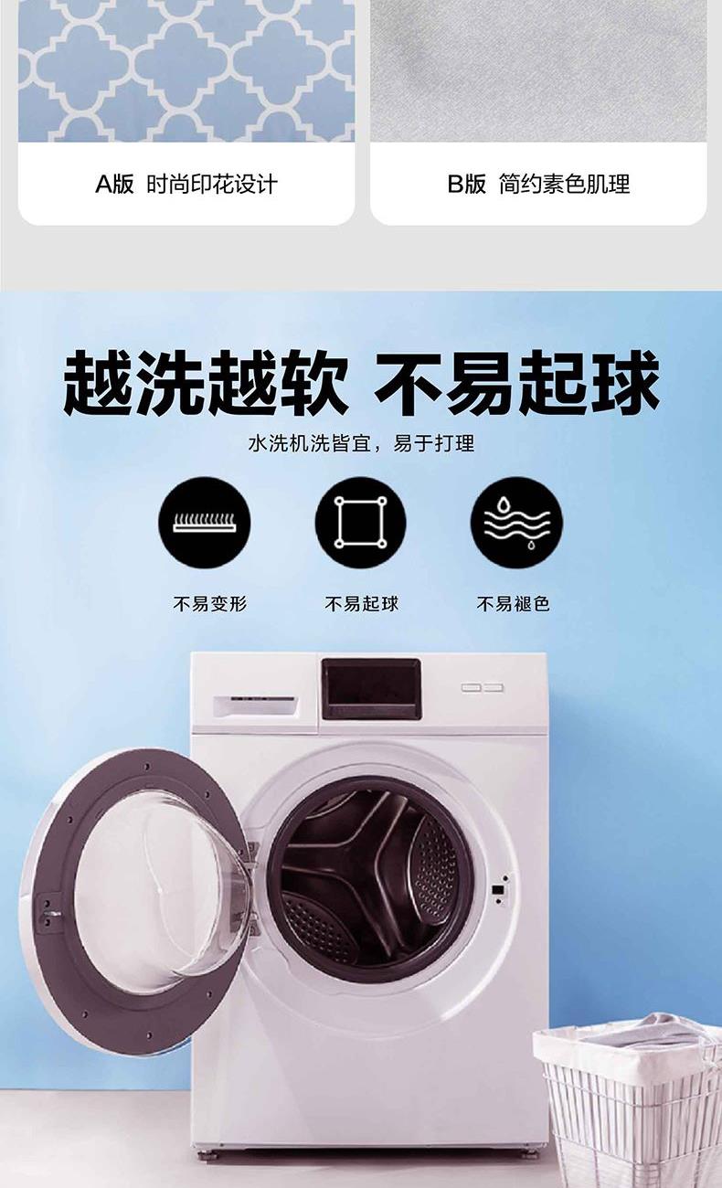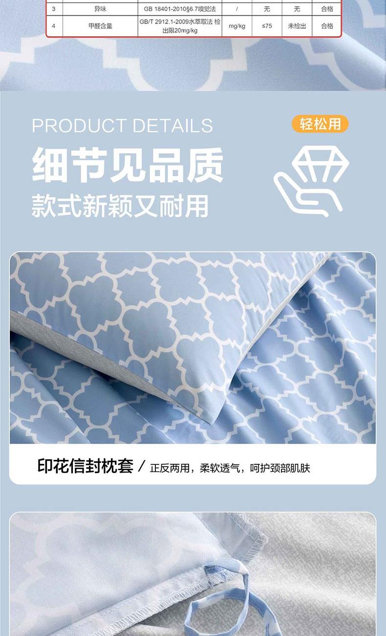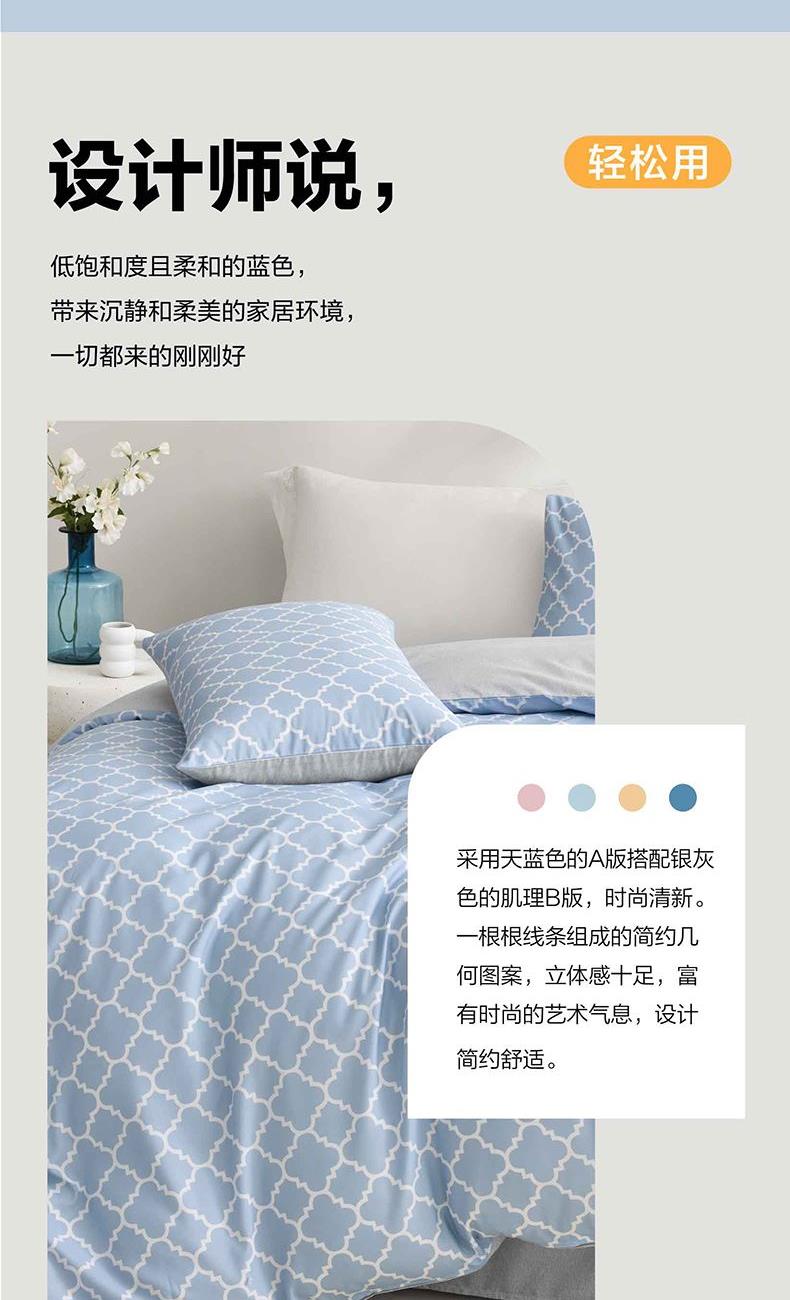 规 格 :200*230cm 被 套 :200*230(cm)*1 被 单 :230*241(cm)*1 枕 套 :48*74(cm)*2 面 料 :聚酯纤维 包 装 :礼盒包装 采用天蓝色的A版搭配银灰色的肌理B版,时尚清新。一根根的线条组成的简约几何图案,立体感十足,富有时尚的艺术气息,设计简约舒适。