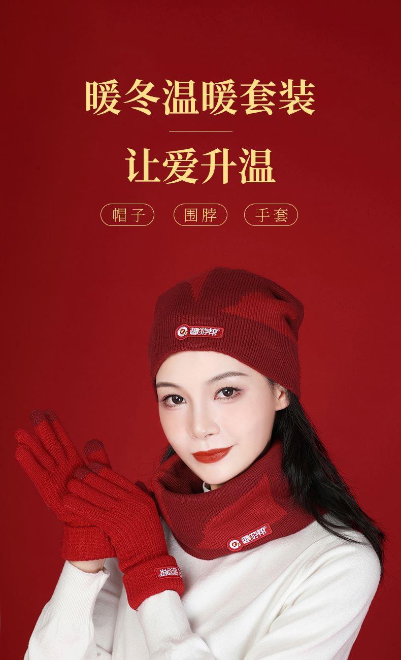 材质 围脖:腈纶 、 围脖:腈纶 手套:95%腈纶3%涤纶2%导电丝 颜色 车厘子红 规格 帽子~28*27cm 、围脖~26*24cm 手套~9*24cm (展开尺寸) 组合 帽子 、围脖、手套、外盒、手提袋 时尚科技面料,亲肤、锁温、柔软、高弹 全新升级材料,手套三指触屏,兼容各种设备 奢华礼盒包装,送礼自用都温暖 车厘子红戴出好肤色