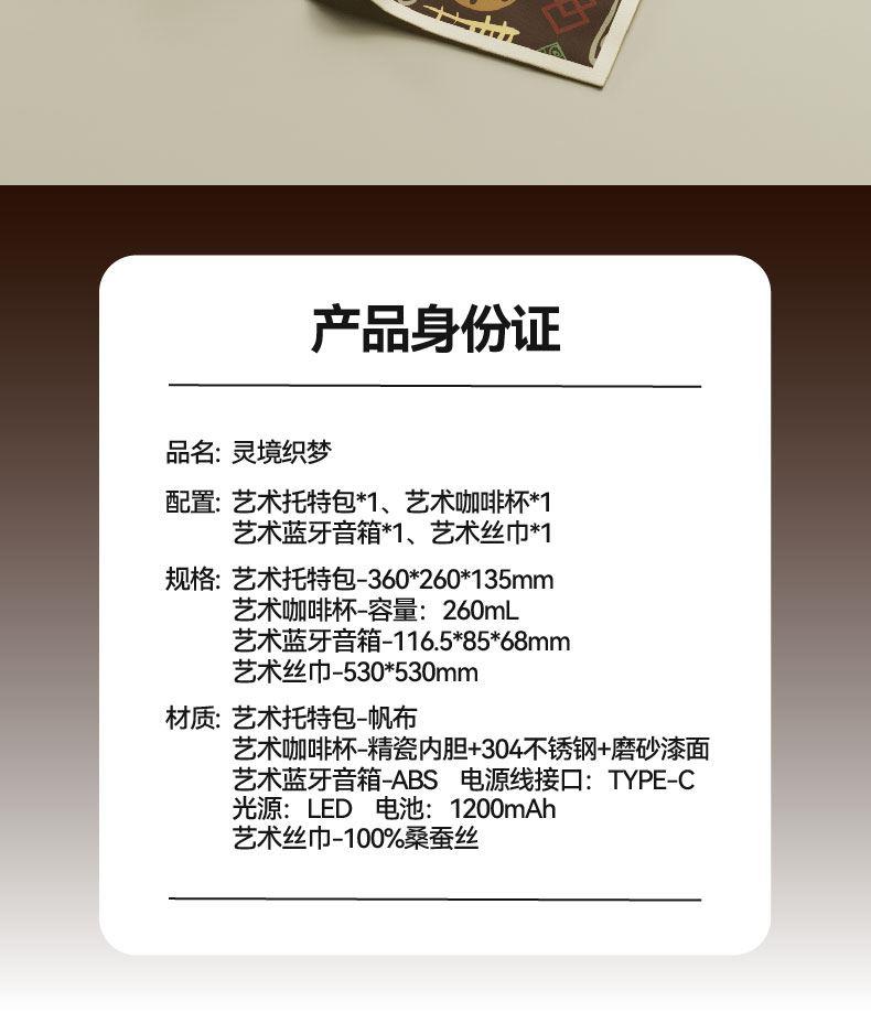 以艺术插画勾勒女性内心的灵性图景 那里是梦想的织坊,现实与幻境在笔触间温柔交融 在这个致敬她的节日,我们礼赞那些静谧而坚韧的力量 每一幅插画都是内在世界的映照,每一次编织都是自我实现的启程 愿这份礼物成为一把钥匙,开启独属于她的精神共鸣,在三月春光里,见证无限可能。 内配: 配置一:艺术托特包x1 配置二:艺术咖啡杯x 1 配置三:艺术蓝牙音响x1 配置四:艺术丝巾x1