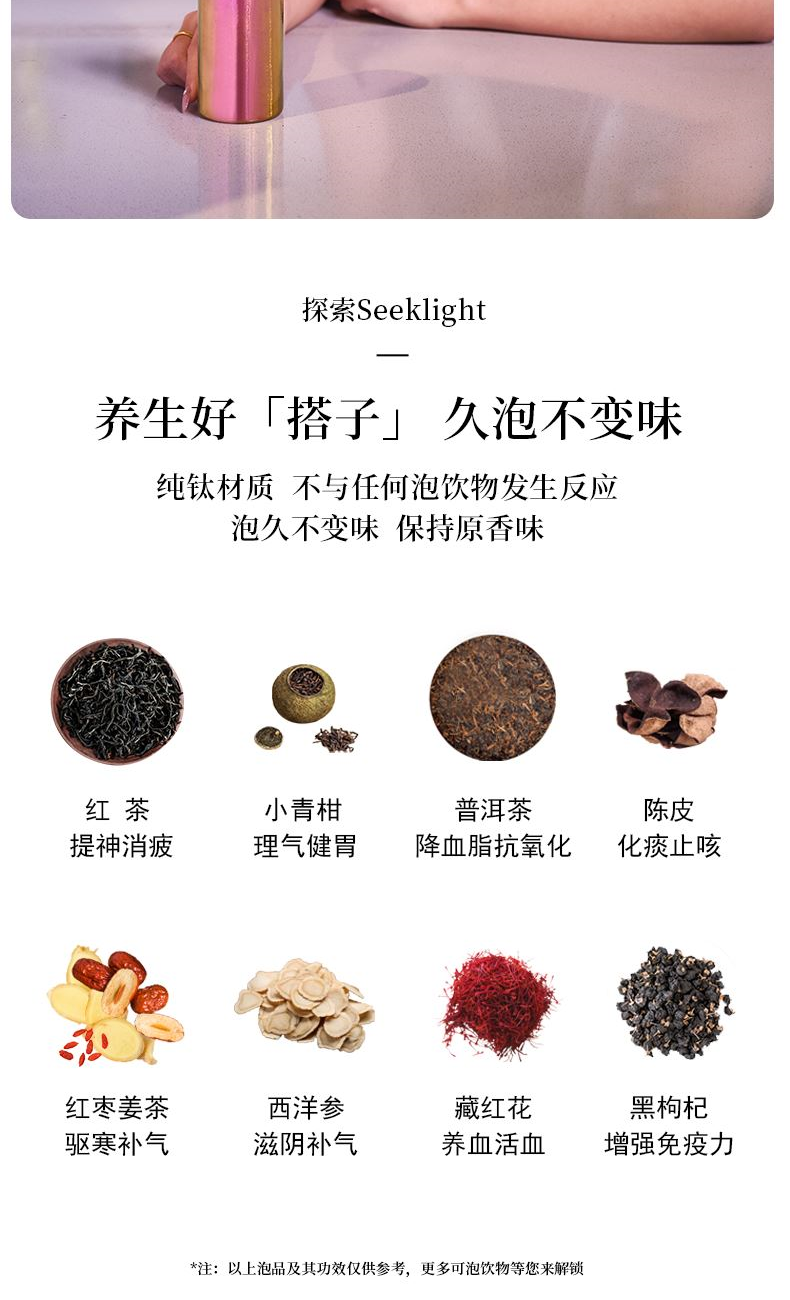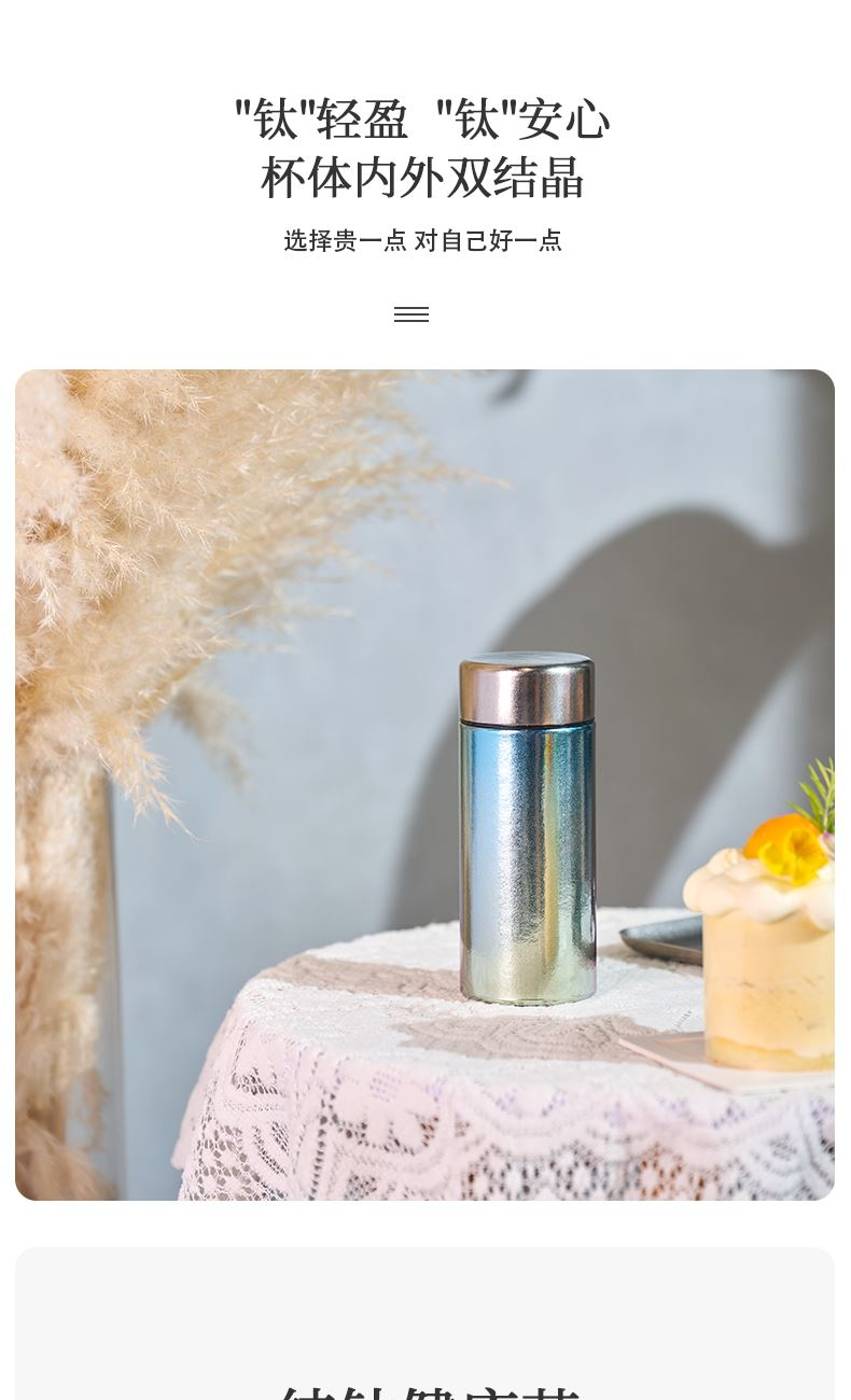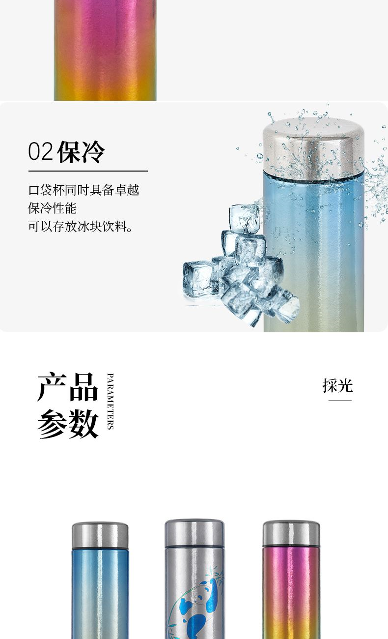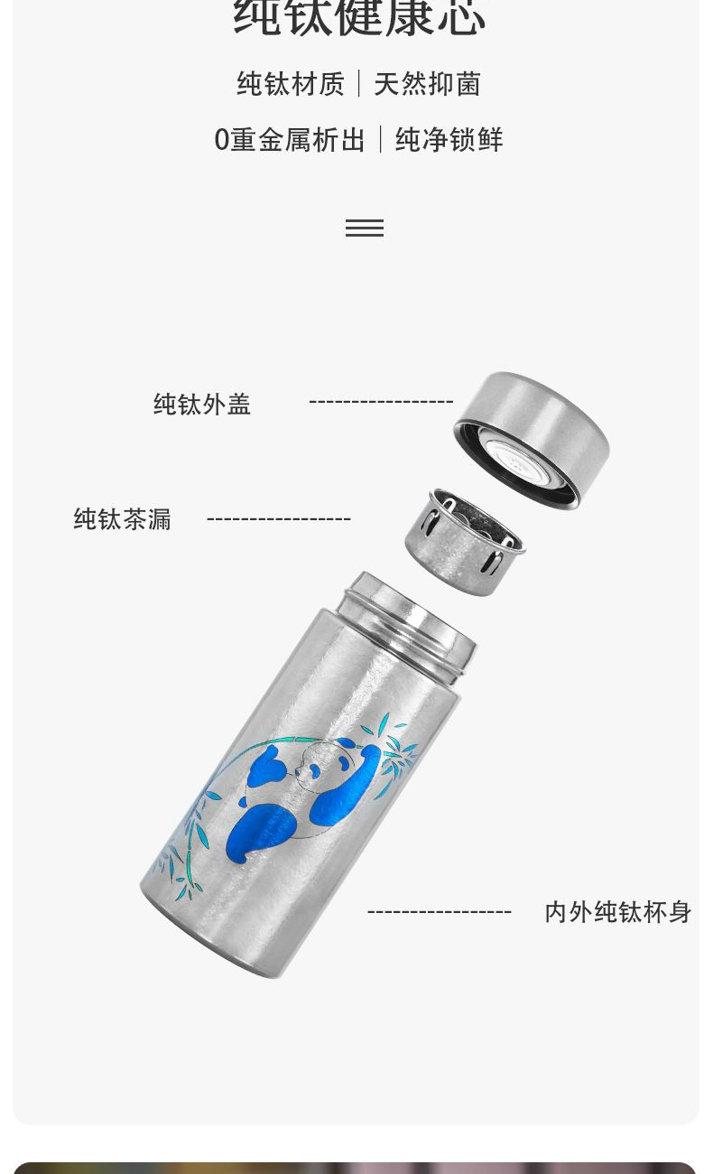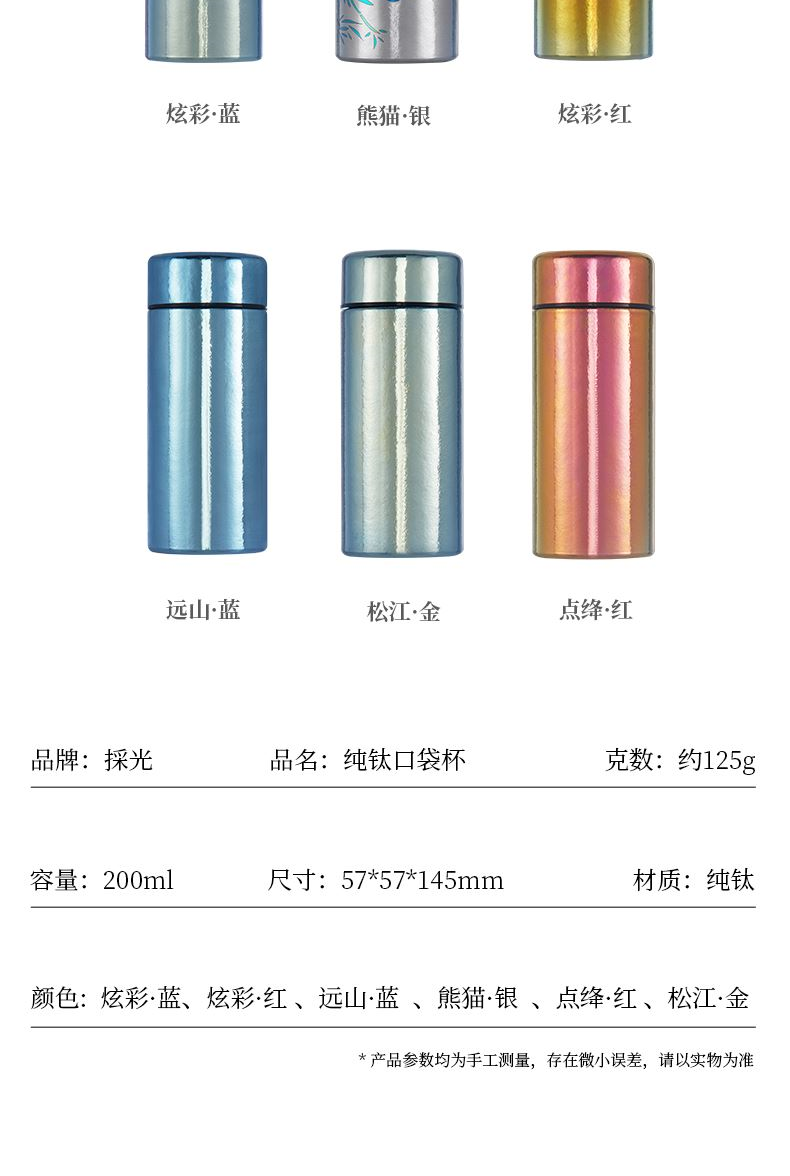 >99.9%纯钛材质|0重金属析出|纯净锁鲜 纯钛滤网|茶渣果粒高效拦截|茶咖果饮随心泡 双层真空隔温|外壁不凝露|双层隔热不烫手 200ml掌中莲影盈盈一握,东方焕彩·健康随行 型号:LBKD-020S CBKD-020B/020R LBKD-0202/0203/0206 尺寸:57*57*145 mm 重量:约125g 容量:200ML 彩钛 · 银(熊猫) 纯色 · 蓝/红/金 炫彩 · 蓝/红