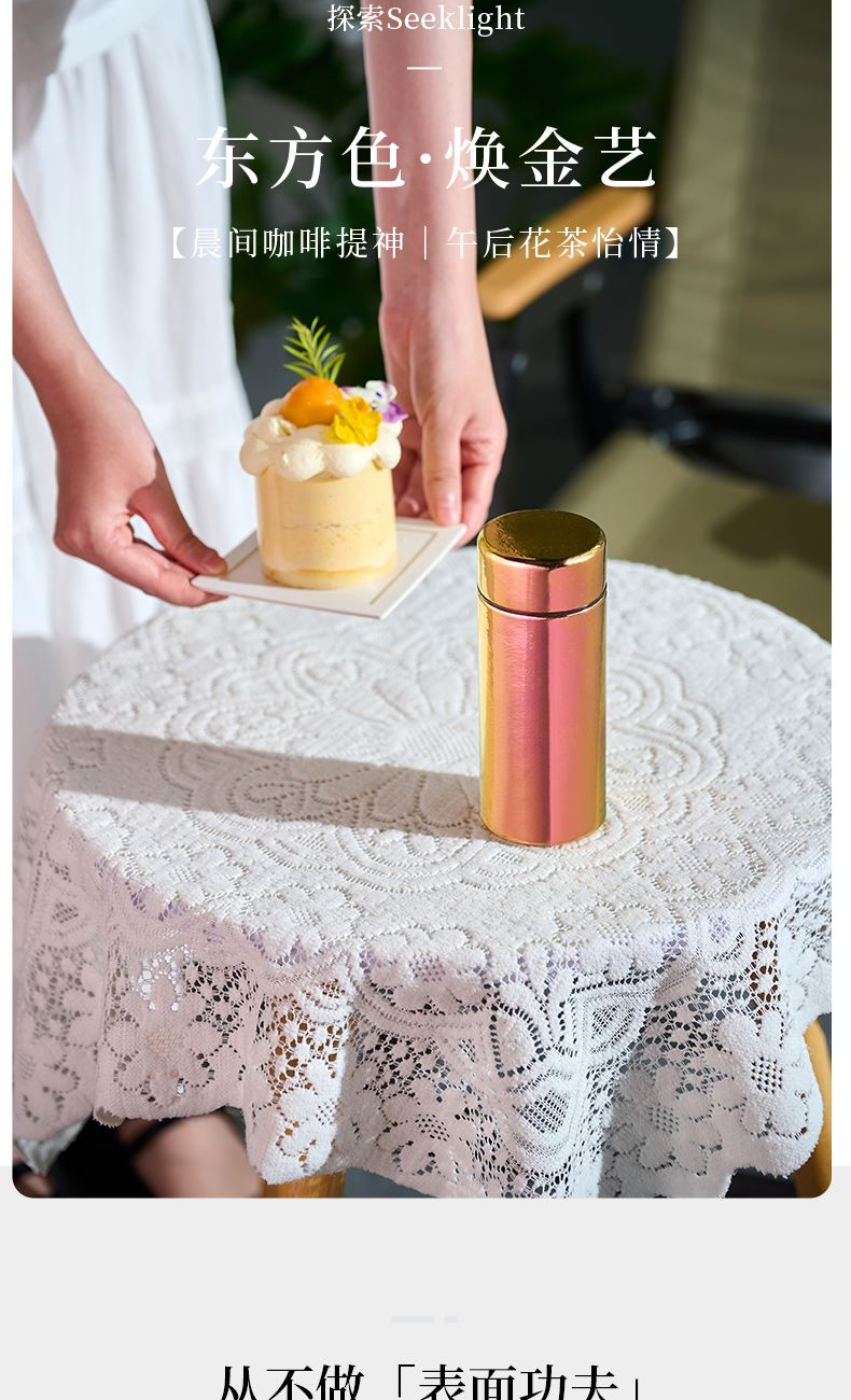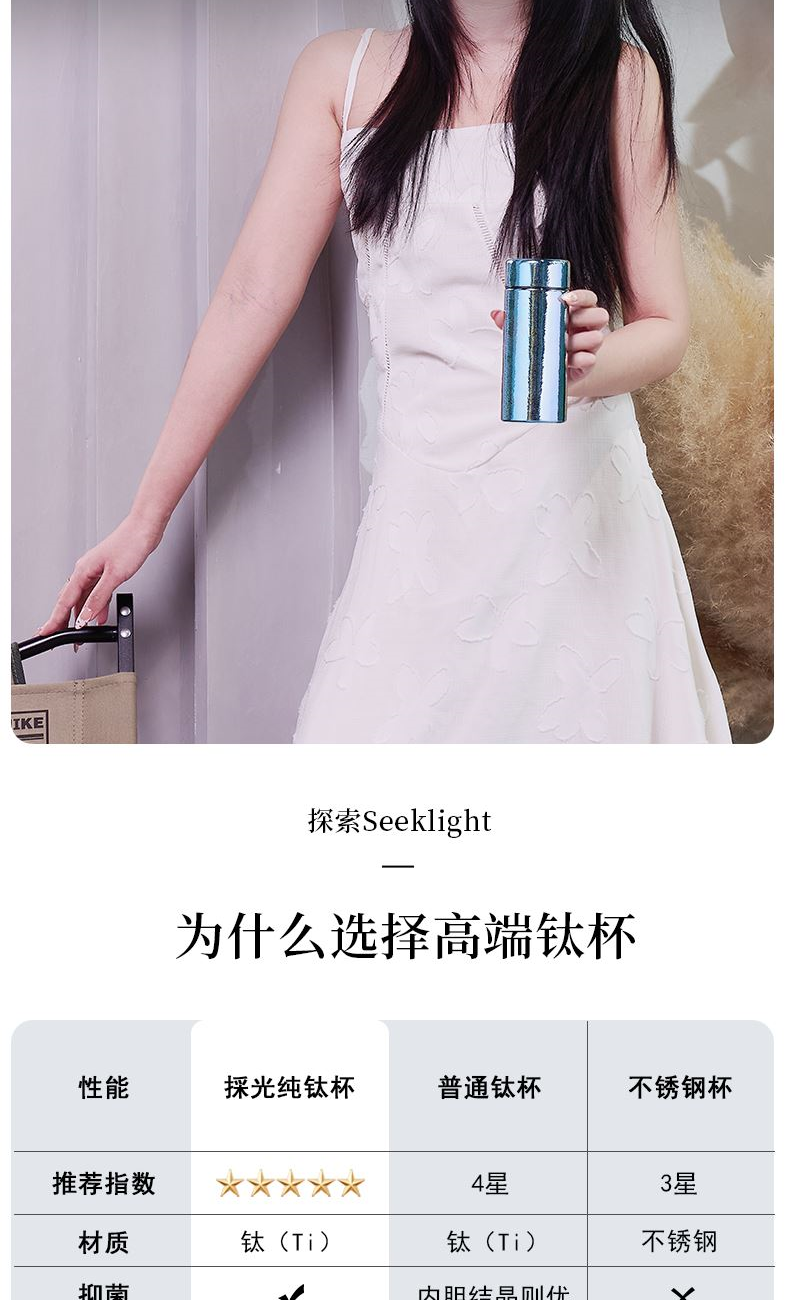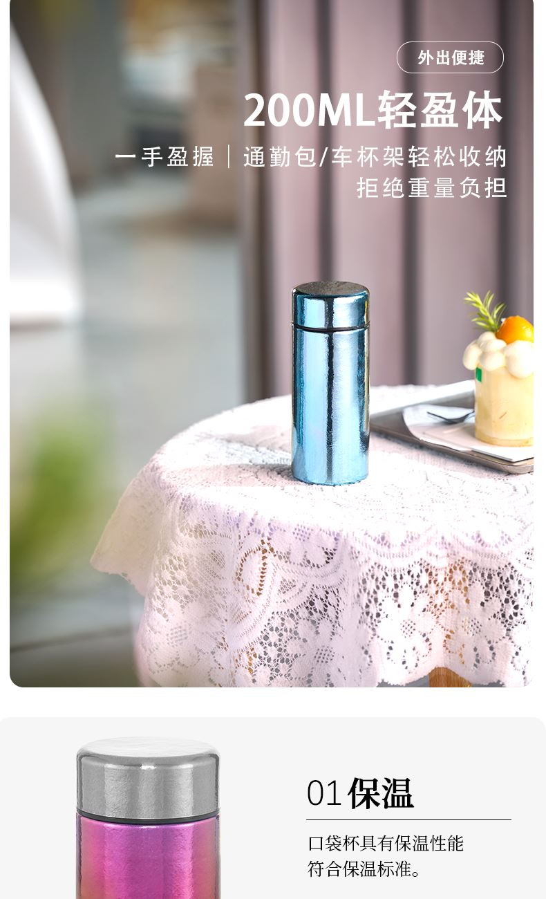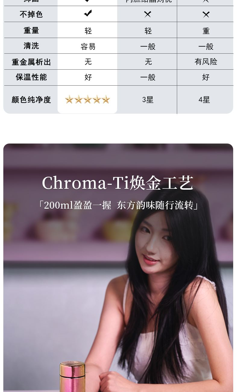 >99.9%纯钛材质|0重金属析出|纯净锁鲜 纯钛滤网|茶渣果粒高效拦截|茶咖果饮随心泡 双层真空隔温|外壁不凝露|双层隔热不烫手 200ml掌中莲影盈盈一握,东方焕彩·健康随行 型号:LBKD-020S CBKD-020B/020R LBKD-0202/0203/0206 尺寸:57*57*145 mm 重量:约125g 容量:200ML 彩钛 · 银(熊猫) 纯色 · 蓝/红/金 炫彩 · 蓝/红