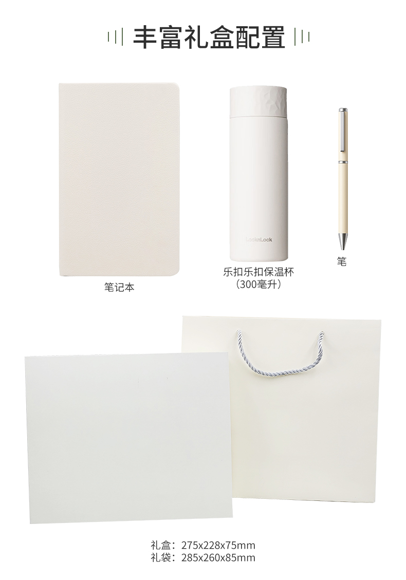 礼盒配置: 1、A6硬皮PU笔记本 2、金属烤漆笔 3、LOCK&LOCK 保温杯 316内胆 300ml 4、包装盒尺寸:275x227x75mm 5、手提袋尺寸:286x260x85mm 6、颜色:米白色 7、重量:25kg/箱
