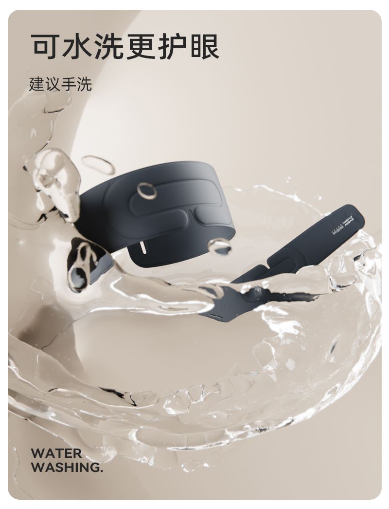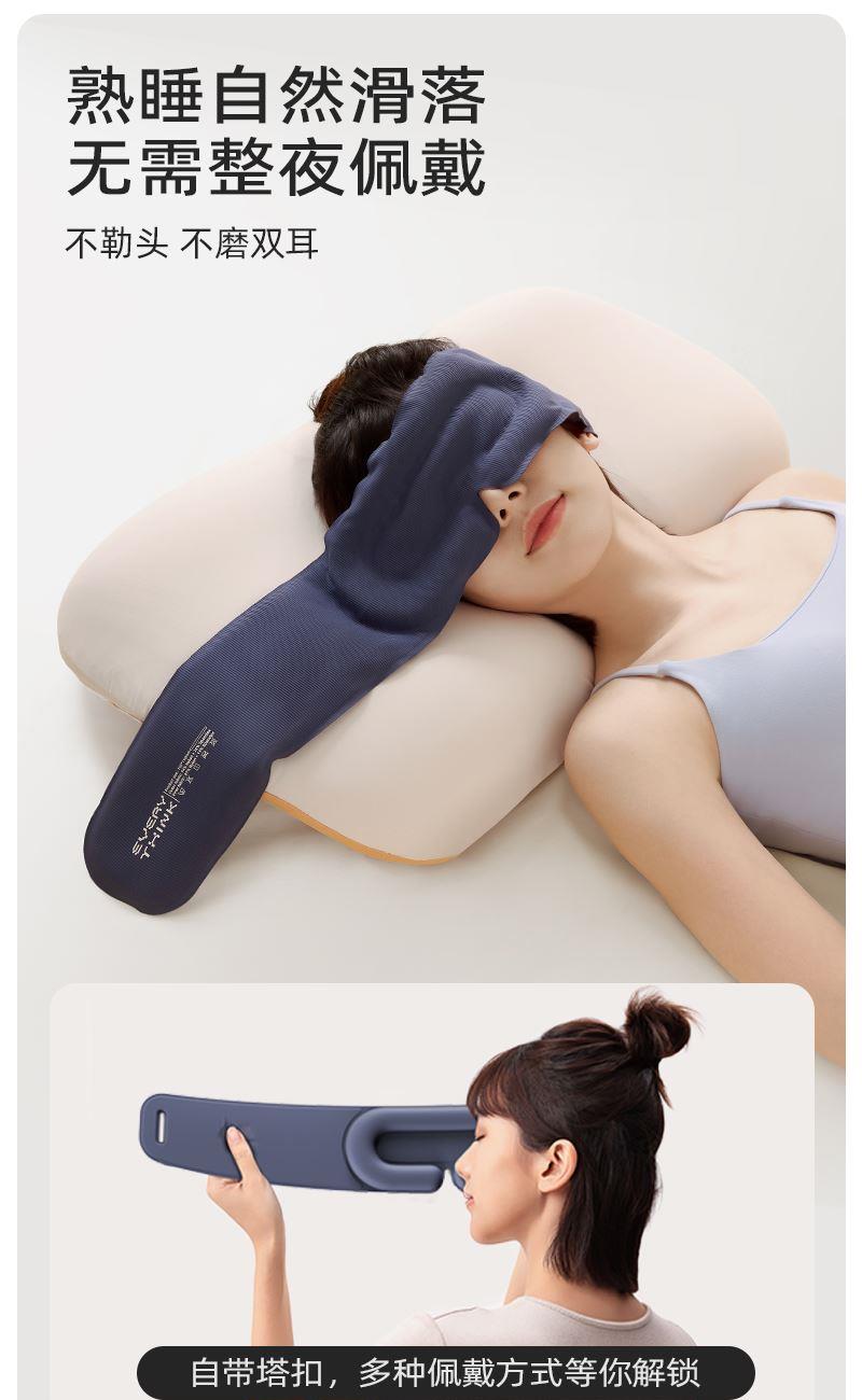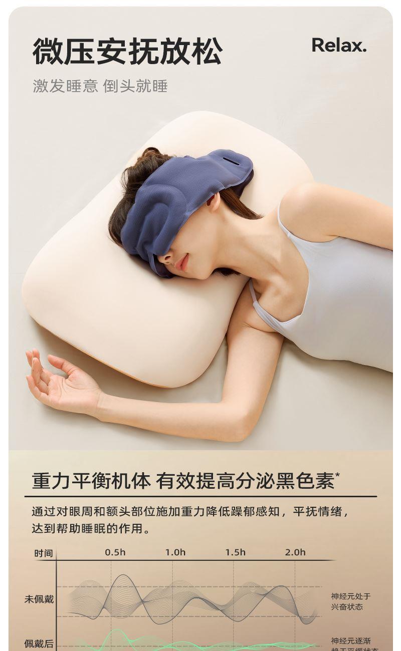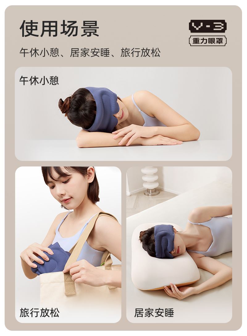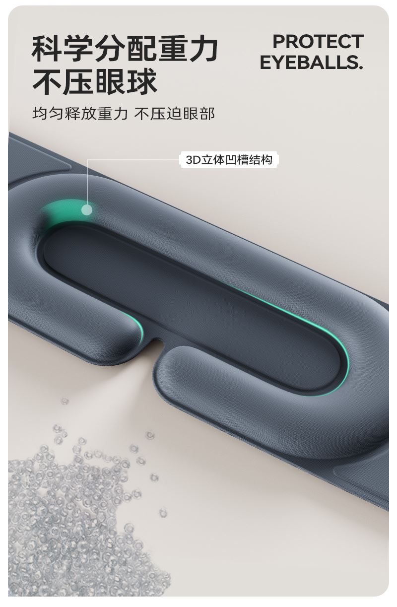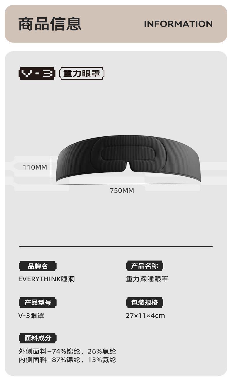 外侧面料: 74%锦纶,26%氨纶 内侧面料: 87%锦纶,13%氨纶 包装清单:眼罩*1 防尘防尘袋*1 单台包装尺寸:270*110*40mm 单台重量:300g(含彩盒) 颜色:阑夜黑、深睡蓝 功能特点: ①多穴位重力触达,缓解疲劳轻松入眠 ②科学分配重力,不压眼球 ③3层结构 ,遮光率99% ④可调节大小,小巧便携,可水洗 ⑤午睡不易花妆
