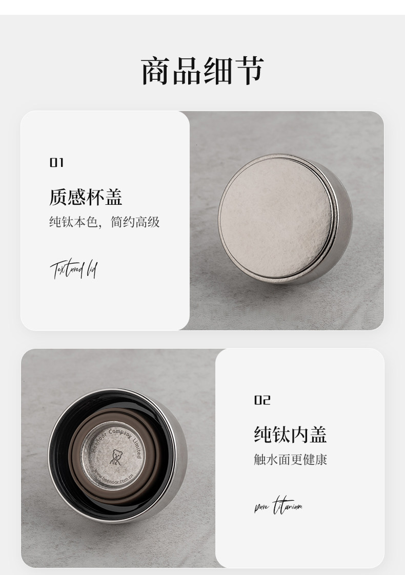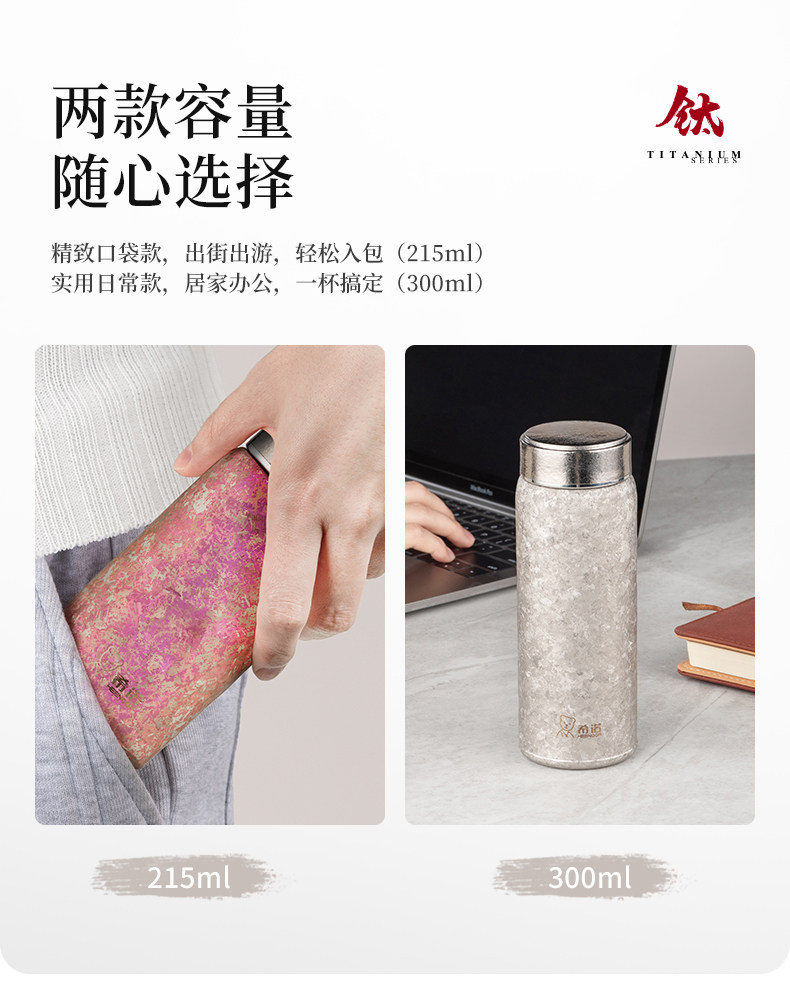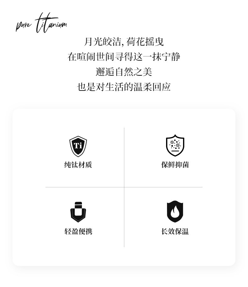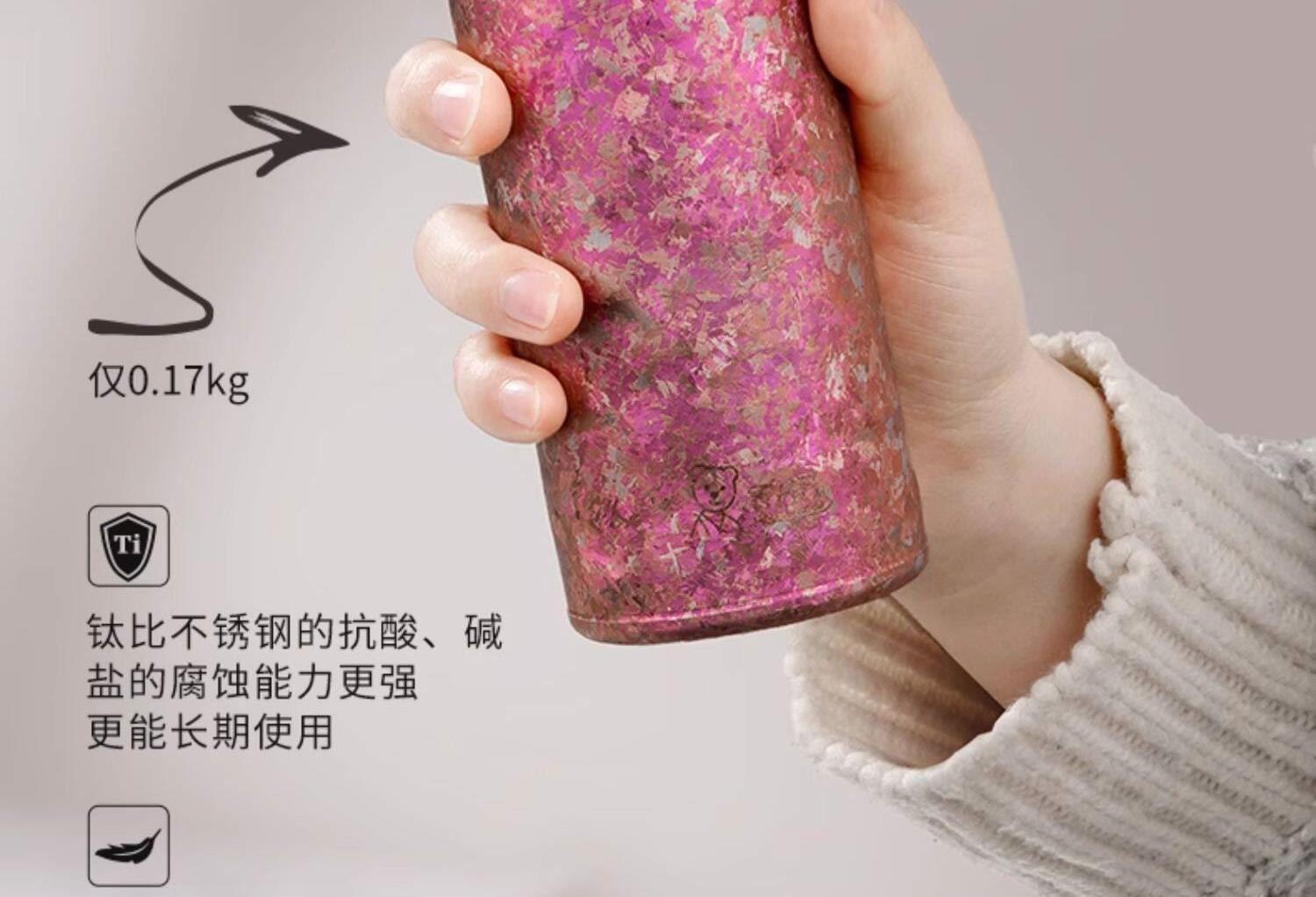 材质: 内胆-钛/杯身-钛 密封圈:硅橡胶 颜色:银月白/初荷粉 杯盖样式:旋盖 容量:215ml