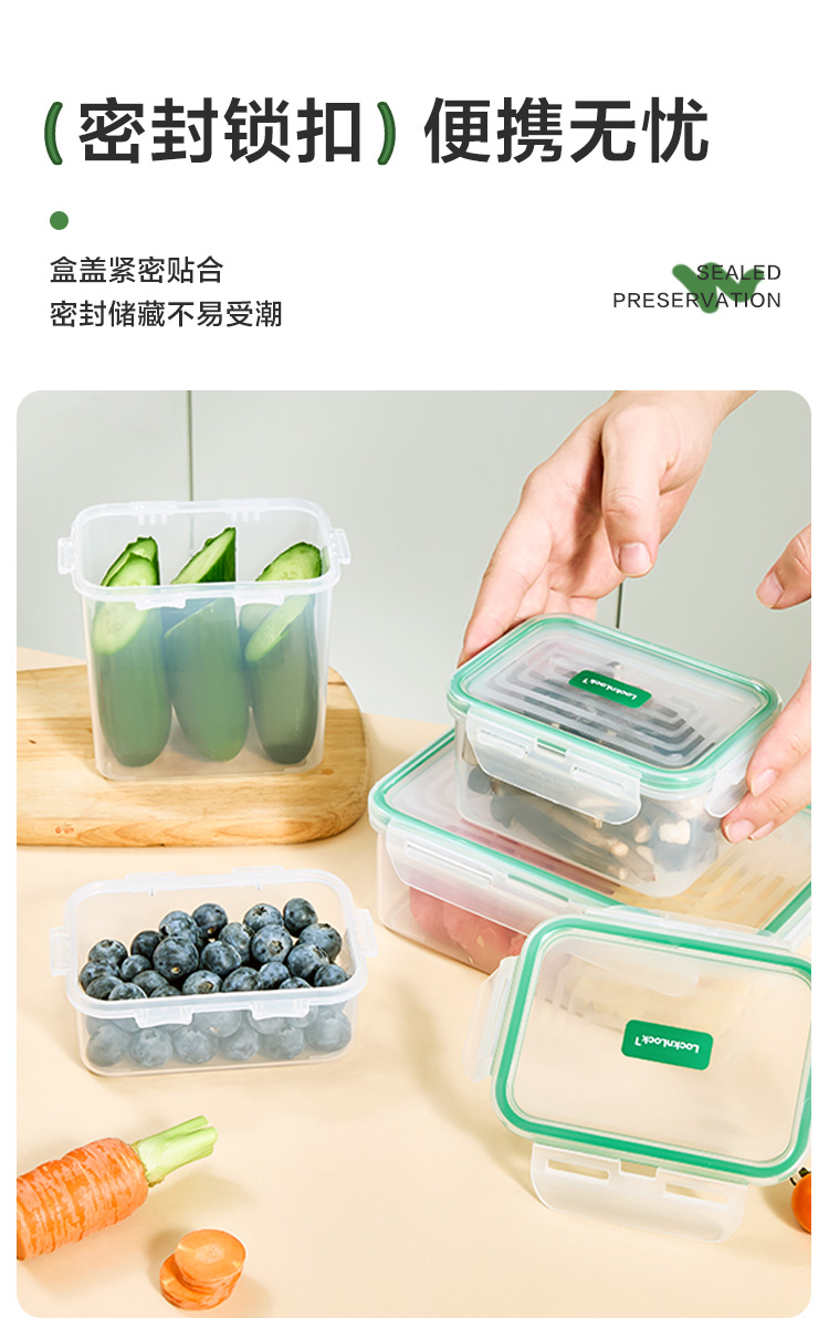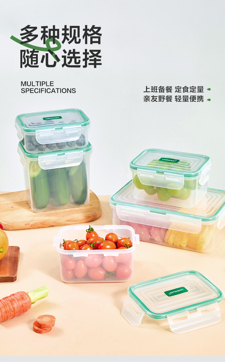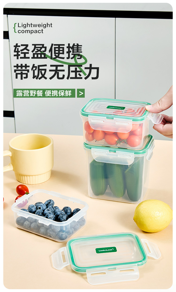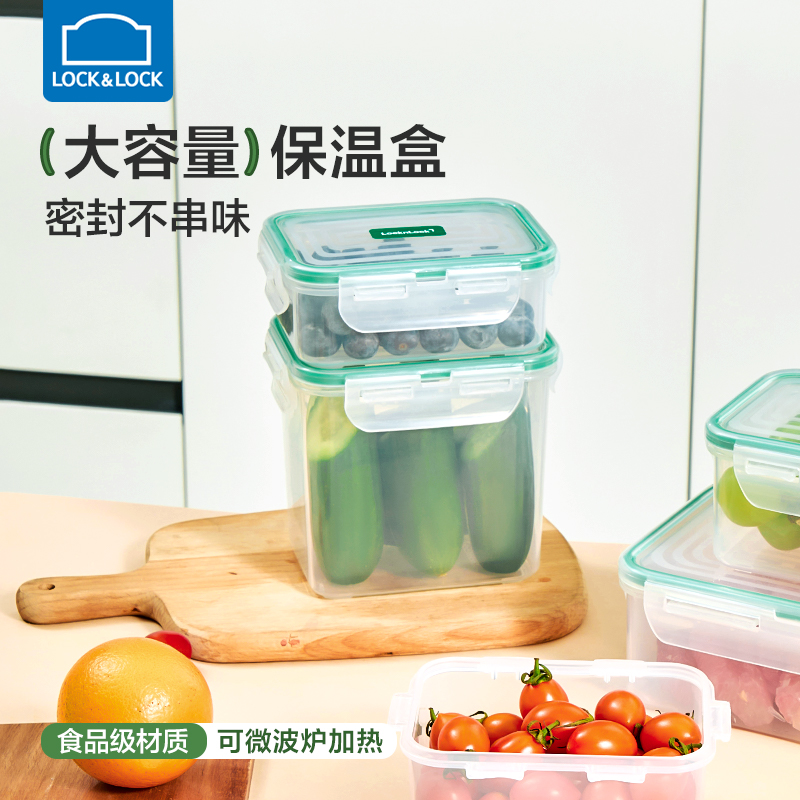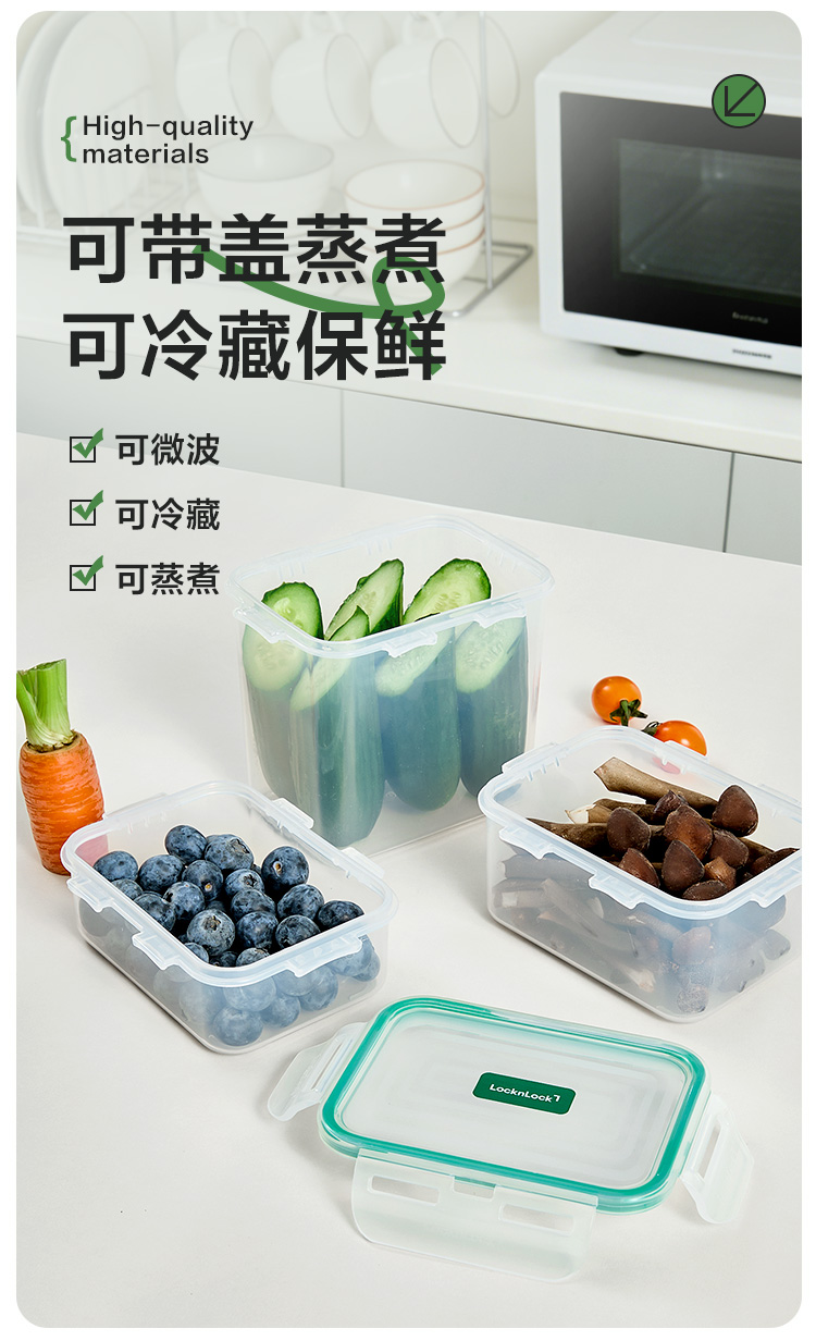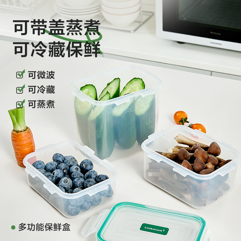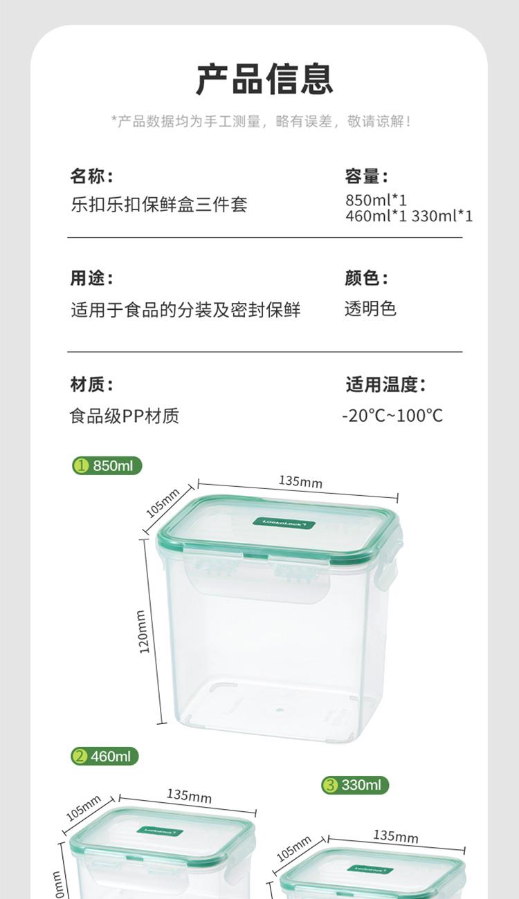 乐扣乐扣保鲜盒3件套 (330ml,135*105*50mm)*1 (460ml,135*105*70mm)*1 (850ml,135*105*120mm)*1 产品特点: 耐热100℃高温,安心健康PP材质。 适用于微波炉、烤箱、冰箱、洗碗机 弯曲扣盖,经久耐用 长久保鲜,四面锁扣,密封性好,有效防止水分流失 健康材质,盒盖采用聚丙烯PP制造,呵护健康,放心使用 硅胶树脂一体式密封圈,保鲜性好