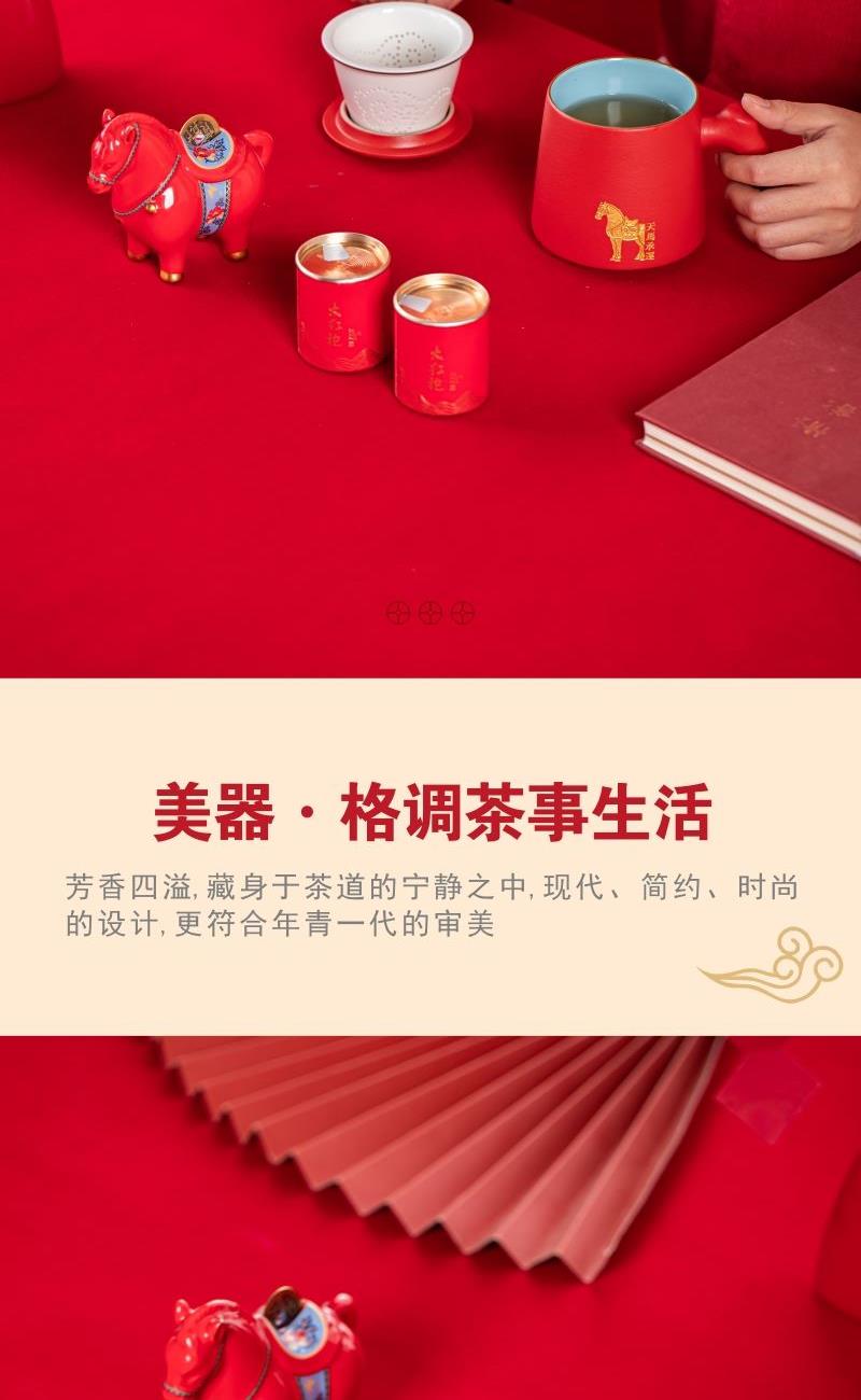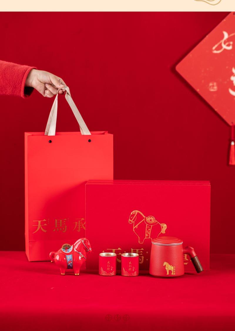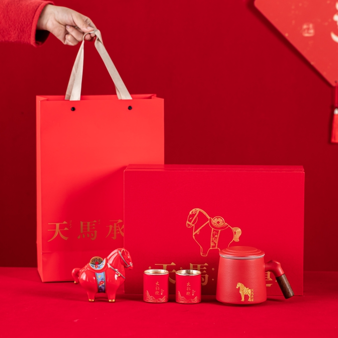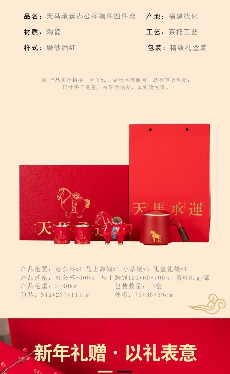 产品型号:TMCY-004 产品材质:陶瓷 产品颜色:红色 产品配置:办公杯x1 、马上赚钱x1 、小茶罐x2 、礼盒礼袋x1 产品规格:办公杯*400ml、马上赚钱120*60*100mm、茶叶8.g/罐 产品毛重:2.00kg 包装数量:15套 包装尺寸:342*237*111mm 外箱尺寸:73*35*59cm 产品特点: 1. 红韵传统:中国红主调,传统雅致一眼沦陷; 2. 茶香锁鲜:两罐大红袍+磨砂茶罐,锁香绝绝子; 3. 寓意满分:珐琅彩马配铜钱,“马上赚钱”谁不爱; 4. 礼享双绝:自饮是中式美学,送礼是鸿运担当。