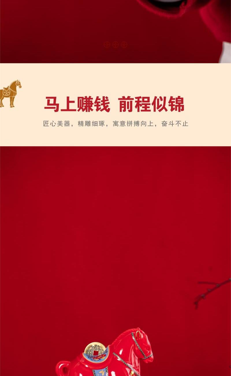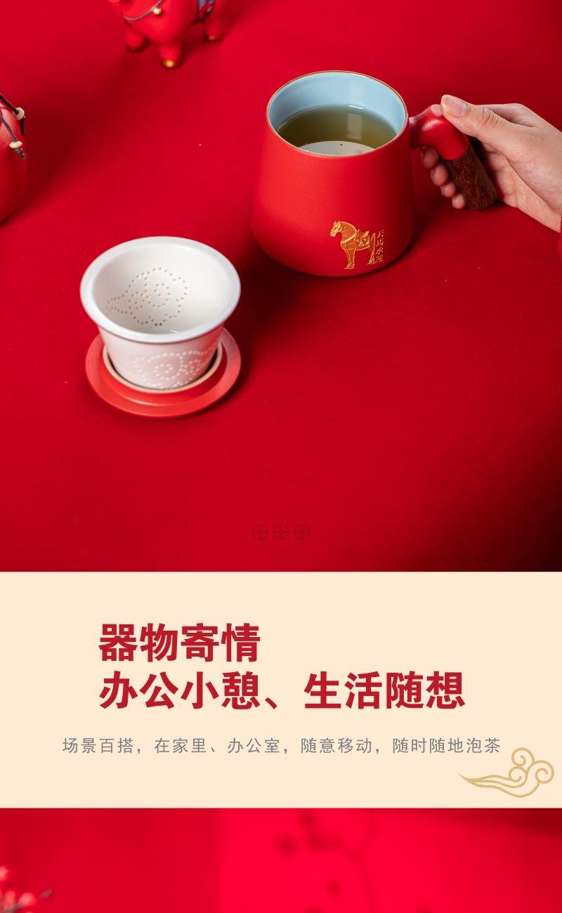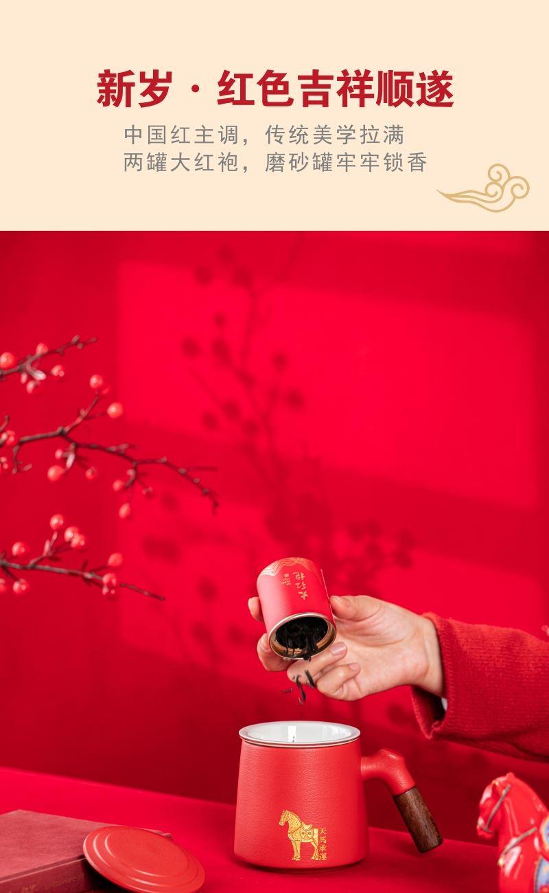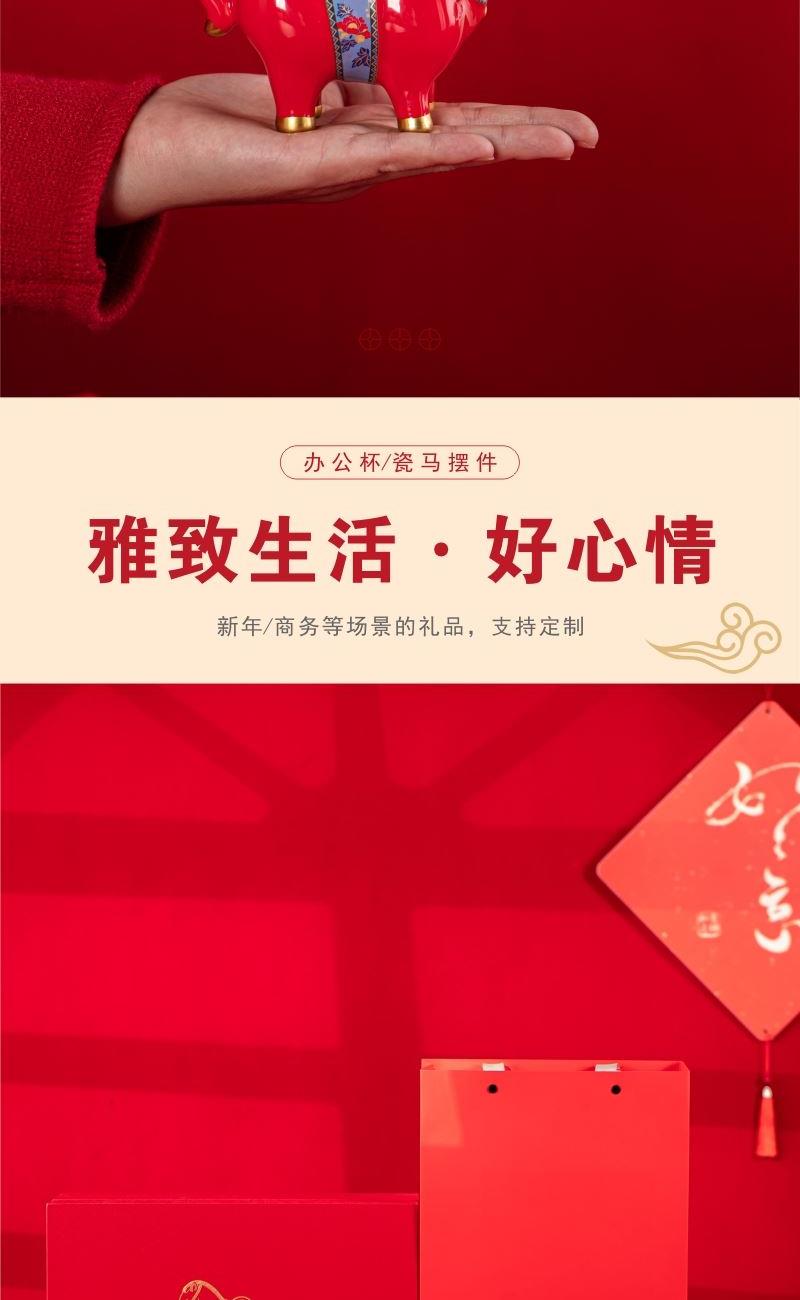 产品型号:TMCY-004 产品材质:陶瓷 产品颜色:红色 产品配置:办公杯x1 、马上赚钱x1 、小茶罐x2 、礼盒礼袋x1 产品规格:办公杯*400ml、马上赚钱120*60*100mm、茶叶8.g/罐 产品毛重:2.00kg 包装数量:15套 包装尺寸:342*237*111mm 外箱尺寸:73*35*59cm 产品特点: 1. 红韵传统:中国红主调,传统雅致一眼沦陷; 2. 茶香锁鲜:两罐大红袍+磨砂茶罐,锁香绝绝子; 3. 寓意满分:珐琅彩马配铜钱,“马上赚钱”谁不爱; 4. 礼享双绝:自饮是中式美学,送礼是鸿运担当。