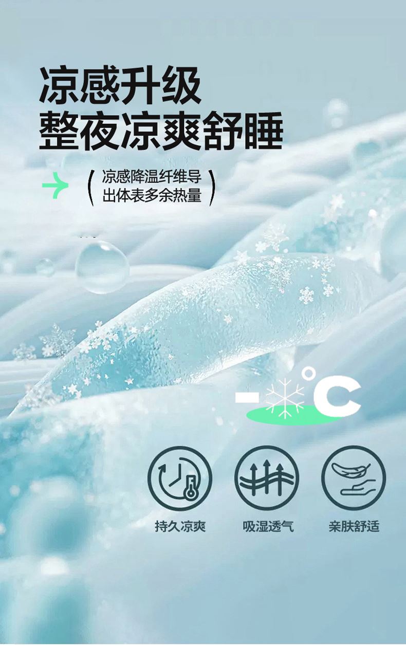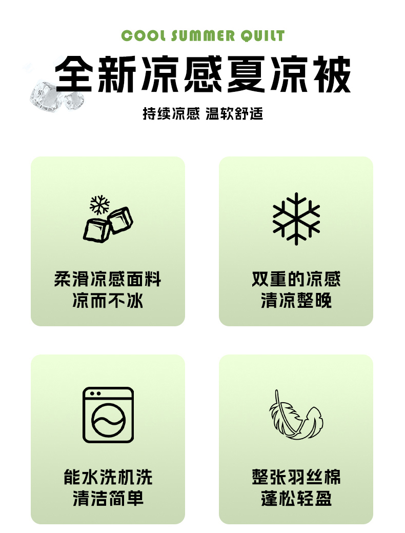 面料材质:氨伦/凉感丝 填充:羽丝棉 产品规格:200*230cm 克重:1700g 产品特点: 夏被感受凉感黑科技,触感细腻的凉感丝,内部多孔结构有效排出湿气。不闷热,凉而不冰。夏日清凉新睡眠。