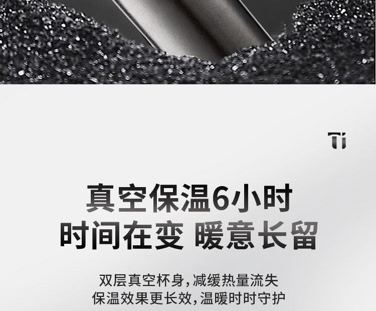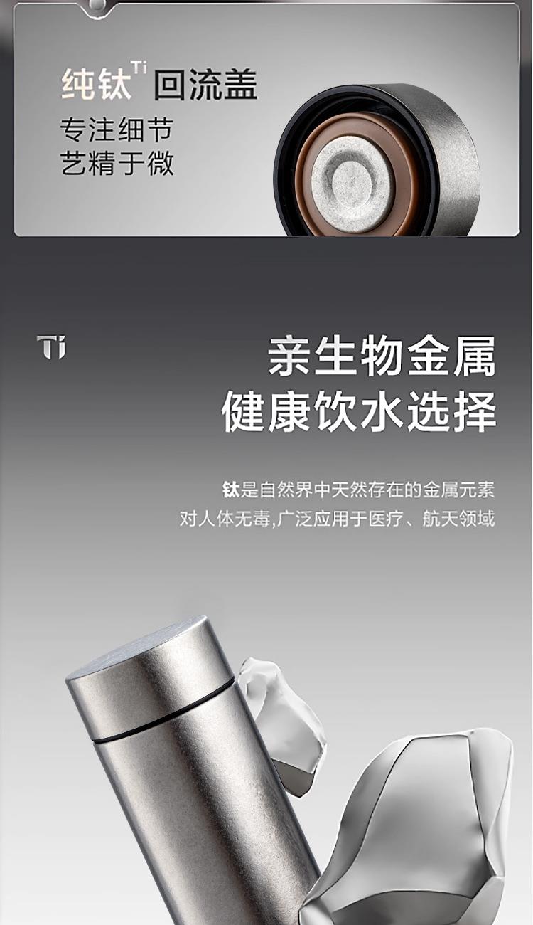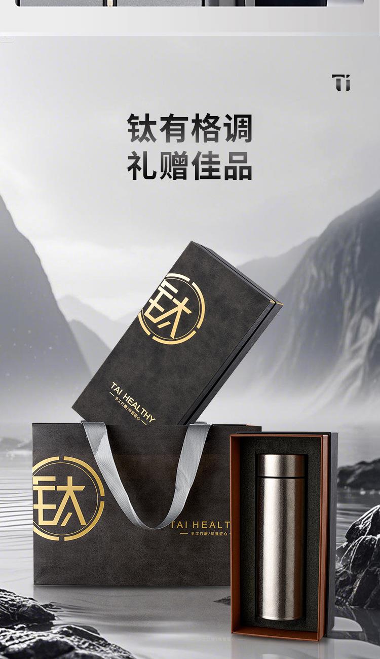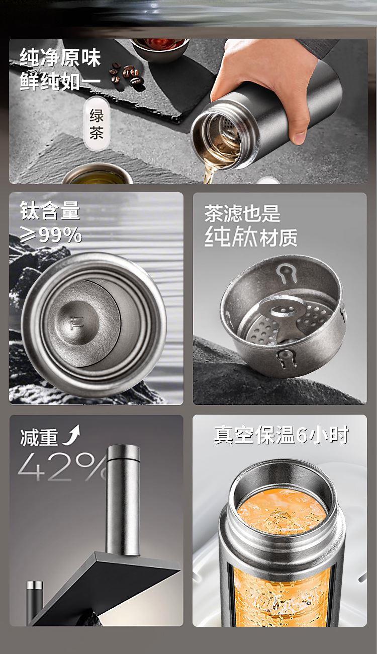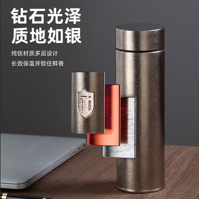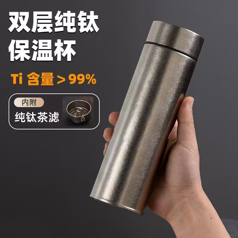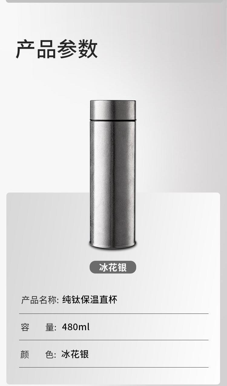 保温杯容量:480ML 材质:99.8%纯钛 颜色: 本色 包装:礼盒 品质:精品杯 •选用航天材质纯钛环保保新功能,高温轰烤结精工艺,无尾真空技术处理。 •杯口圆润光滑,精工细作,食品级PP塑料盖安全无异味。 •高温结精工艺,无任何漆面 ,雾面质感思腻尔温润。 •未成年人请在大人指导下或告知后使用。