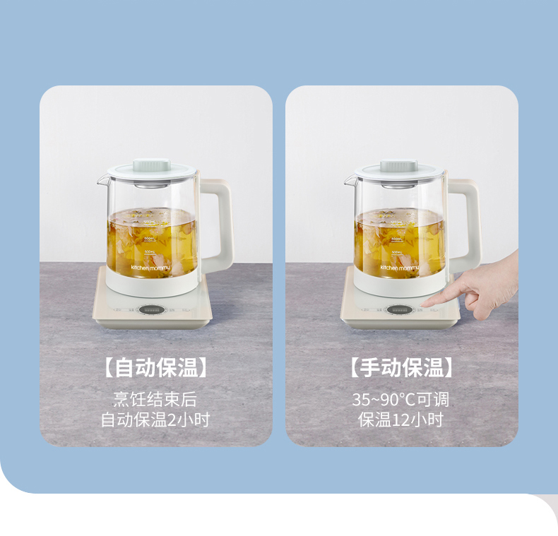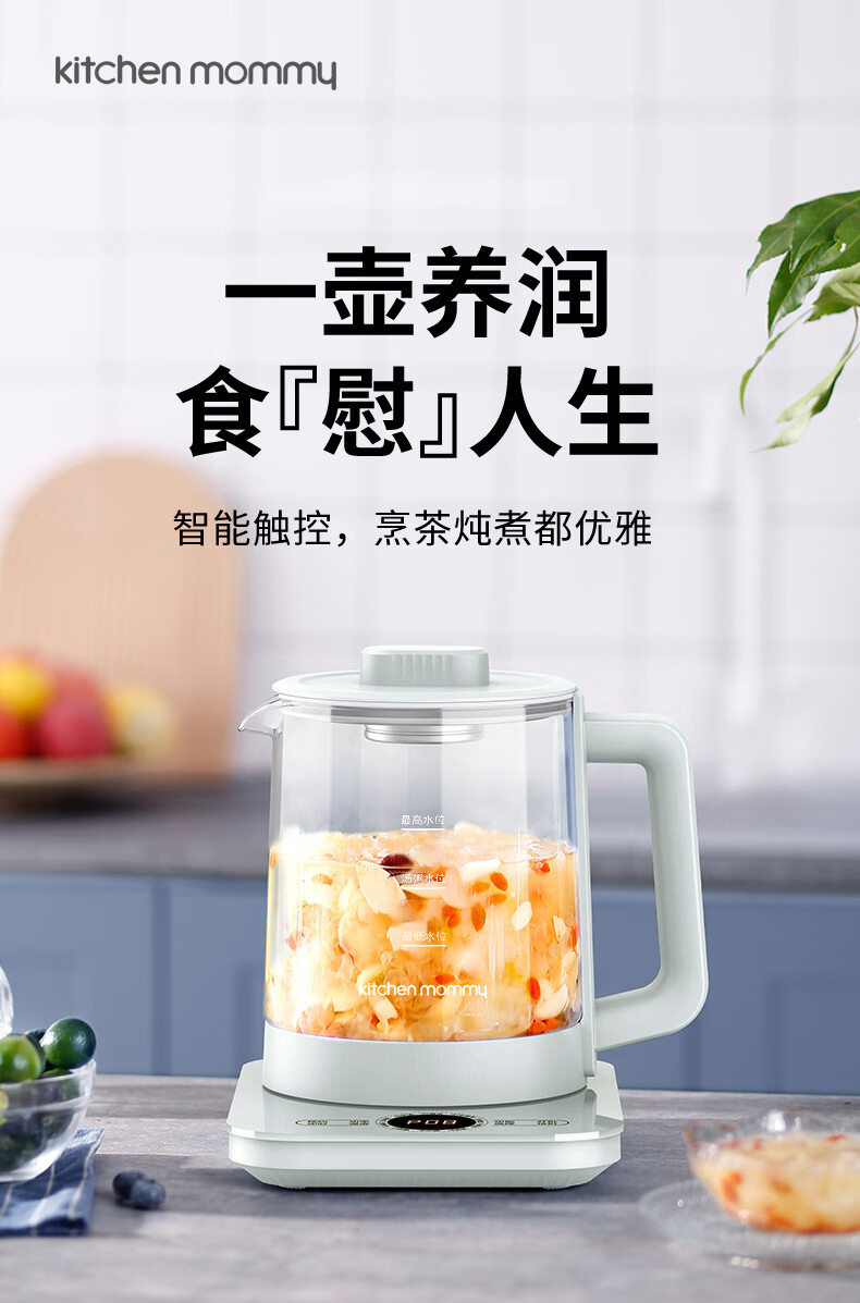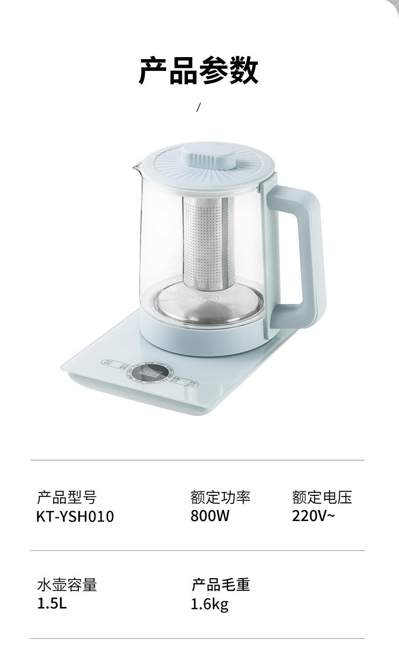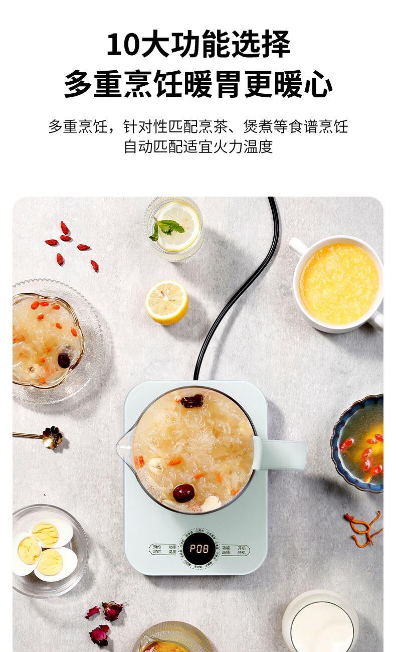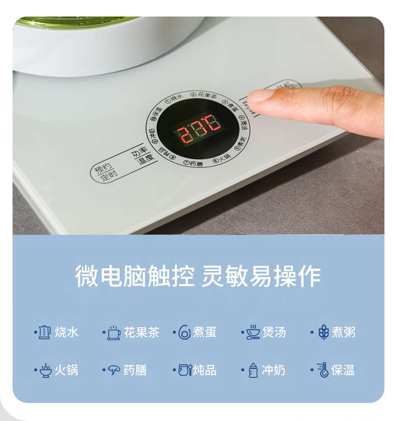 功率:800W 电压:220V 容量:1.5L 毛重:1.6Kg 材质:外壳全新PP+高硼硅玻璃+304不锈钢 彩盒包装尺寸:283*215*255 mm 外箱包装尺寸:590*450*535mm 推荐理由: 1、5环控温,静炖细煮,不溢出 2、钢化玻璃面板,极具档次感和易清洁 3、高硼硅玻璃壶身,骤热骤冷不破裂 4、新增煮粥 煲汤 药膳且不溢出,功能强大 5、1.5升大容量,外观造型经典,赏心悦目 6、触控式按键,轻松控制