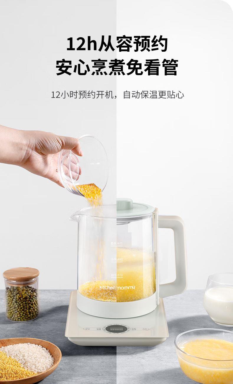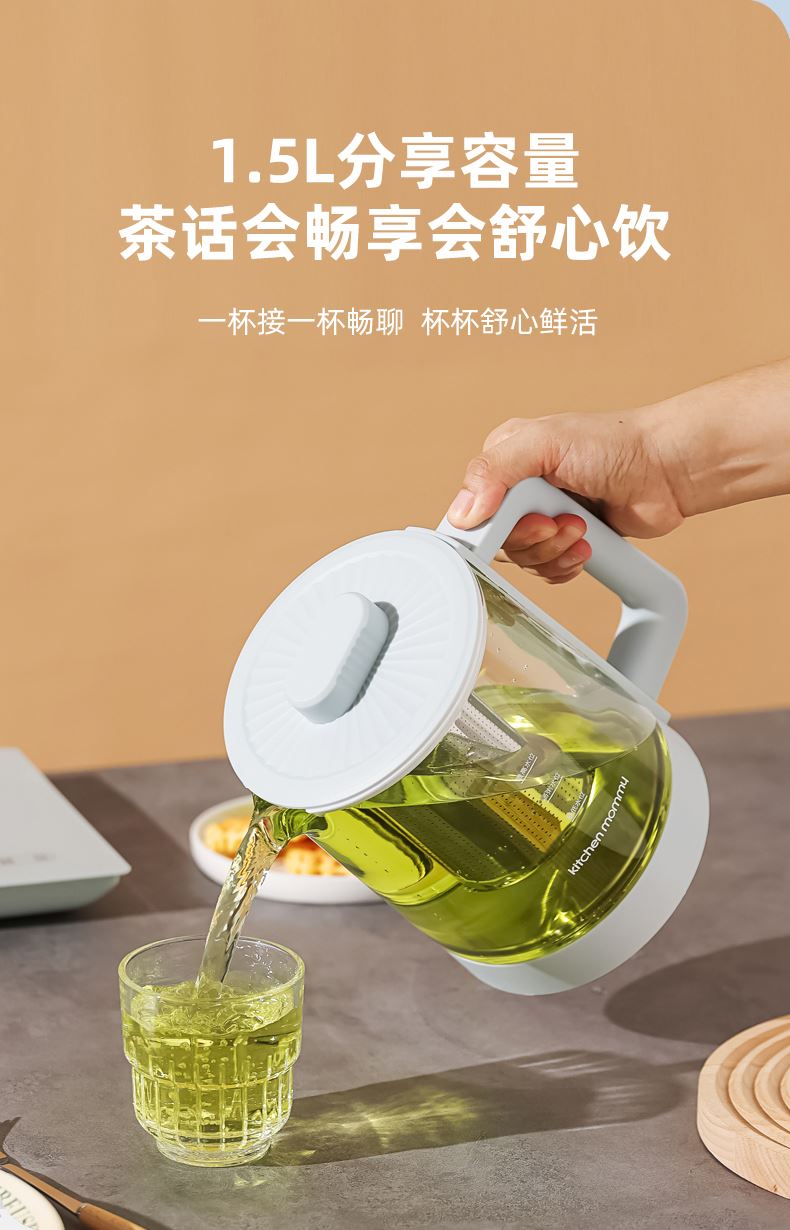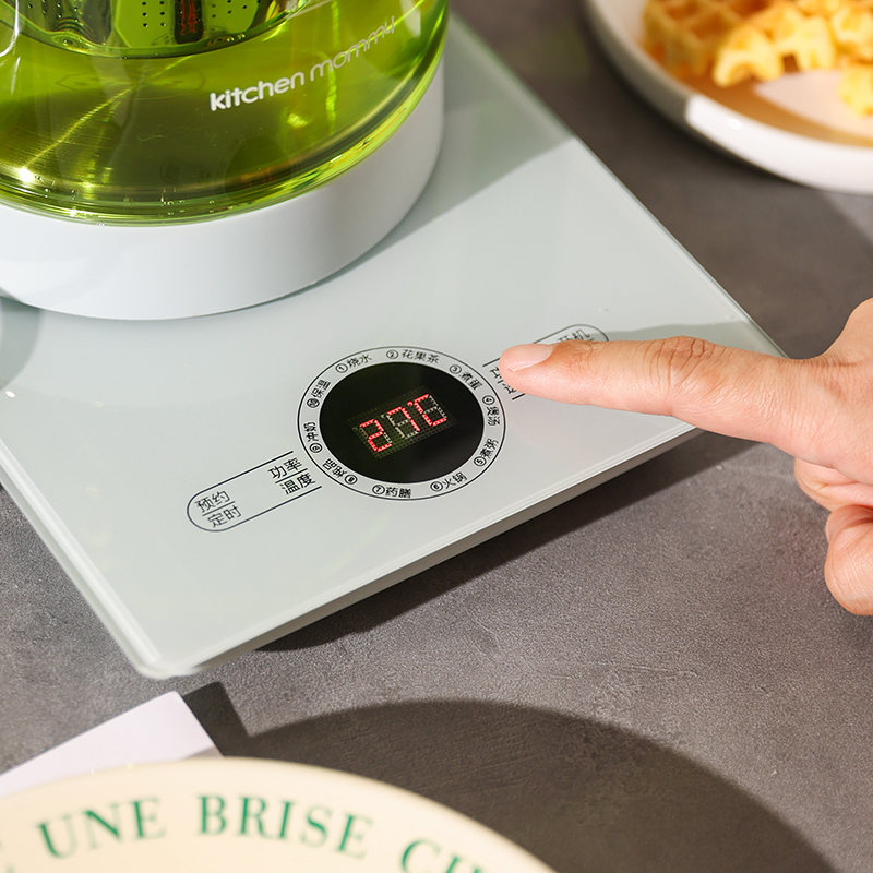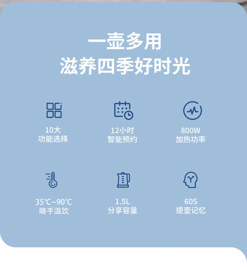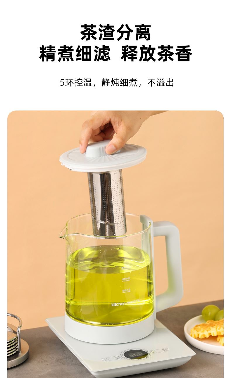 功率:800W 电压:220V 容量:1.5L 毛重:1.6Kg 材质:外壳全新PP+高硼硅玻璃+304不锈钢 彩盒包装尺寸:283*215*255 mm 外箱包装尺寸:590*450*535mm 推荐理由: 1、5环控温,静炖细煮,不溢出 2、钢化玻璃面板,极具档次感和易清洁 3、高硼硅玻璃壶身,骤热骤冷不破裂 4、新增煮粥 煲汤 药膳且不溢出,功能强大 5、1.5升大容量,外观造型经典,赏心悦目 6、触控式按键,轻松控制