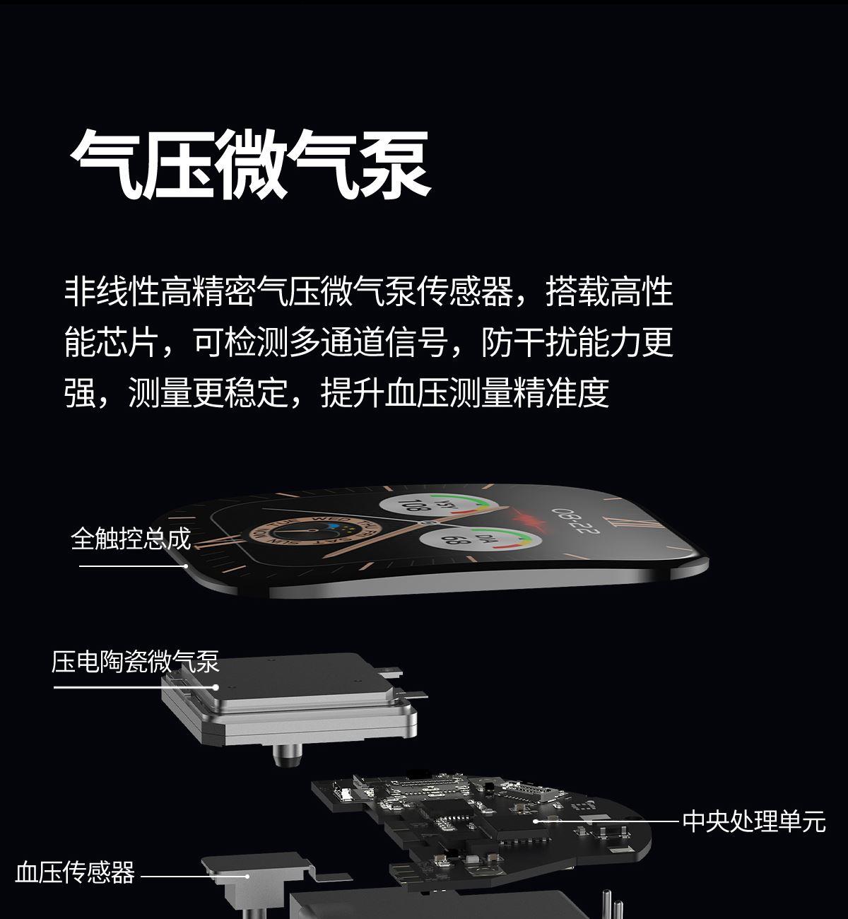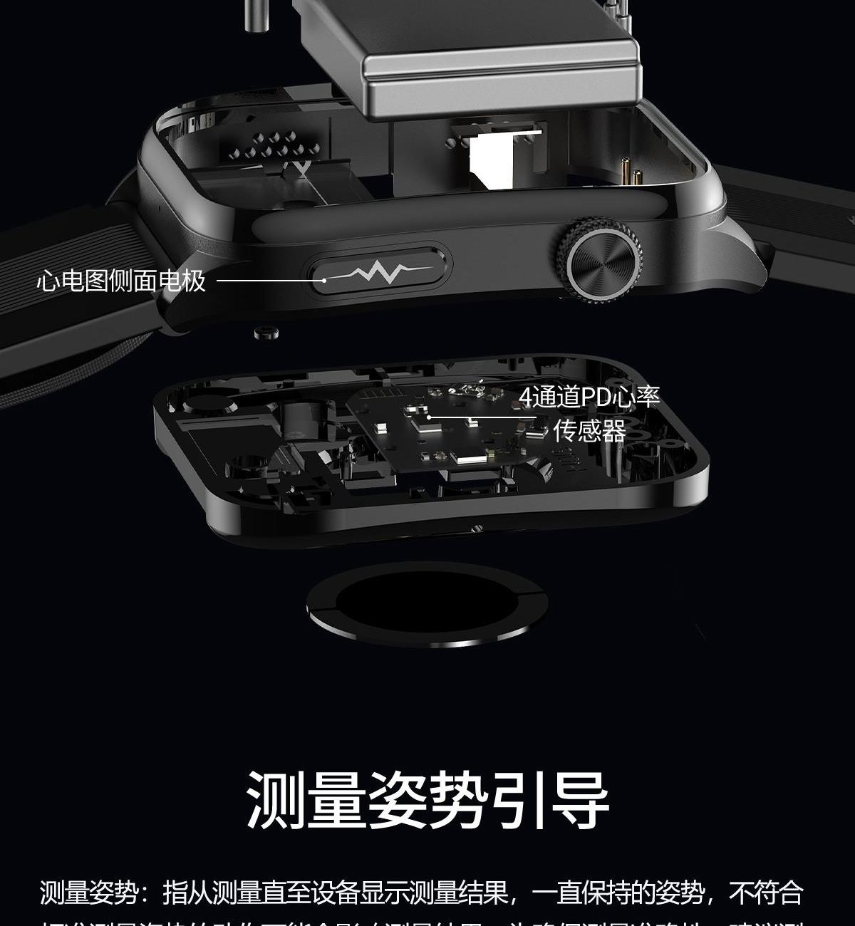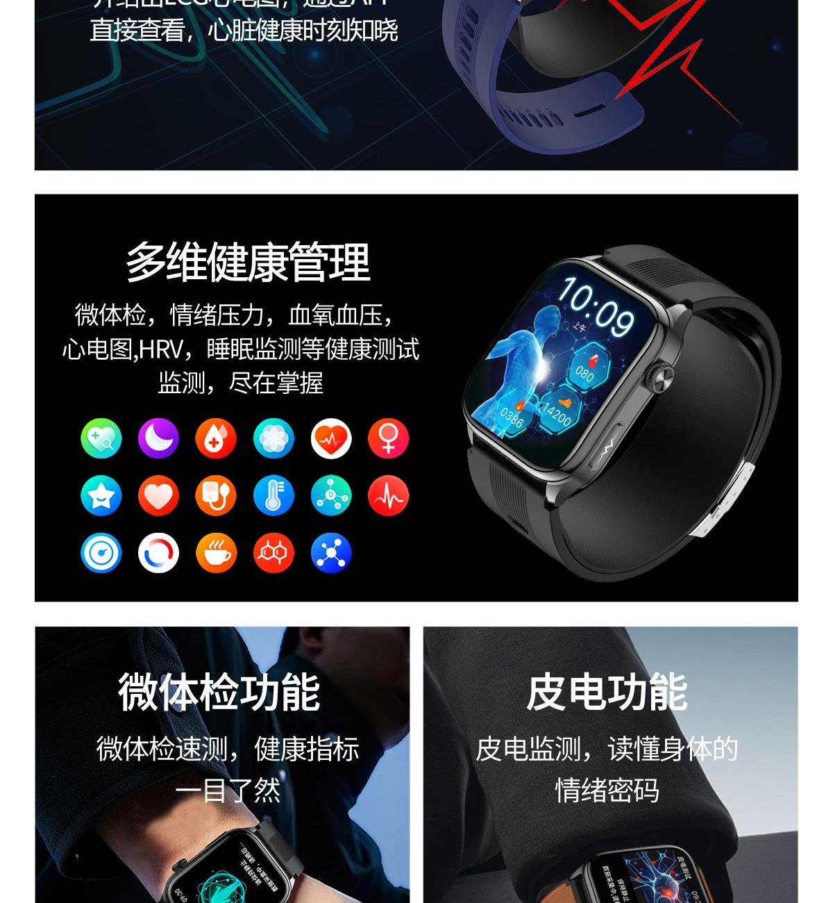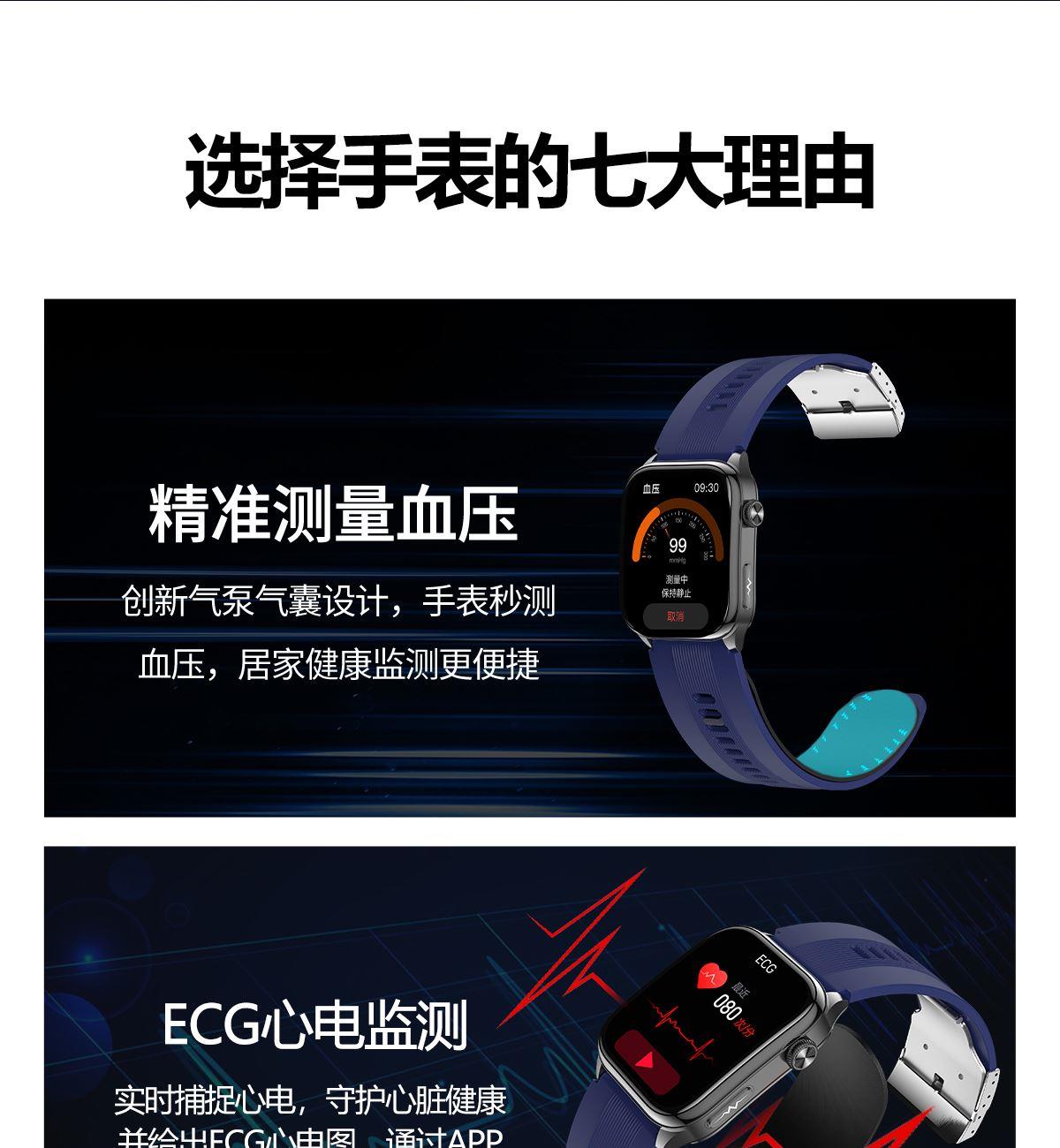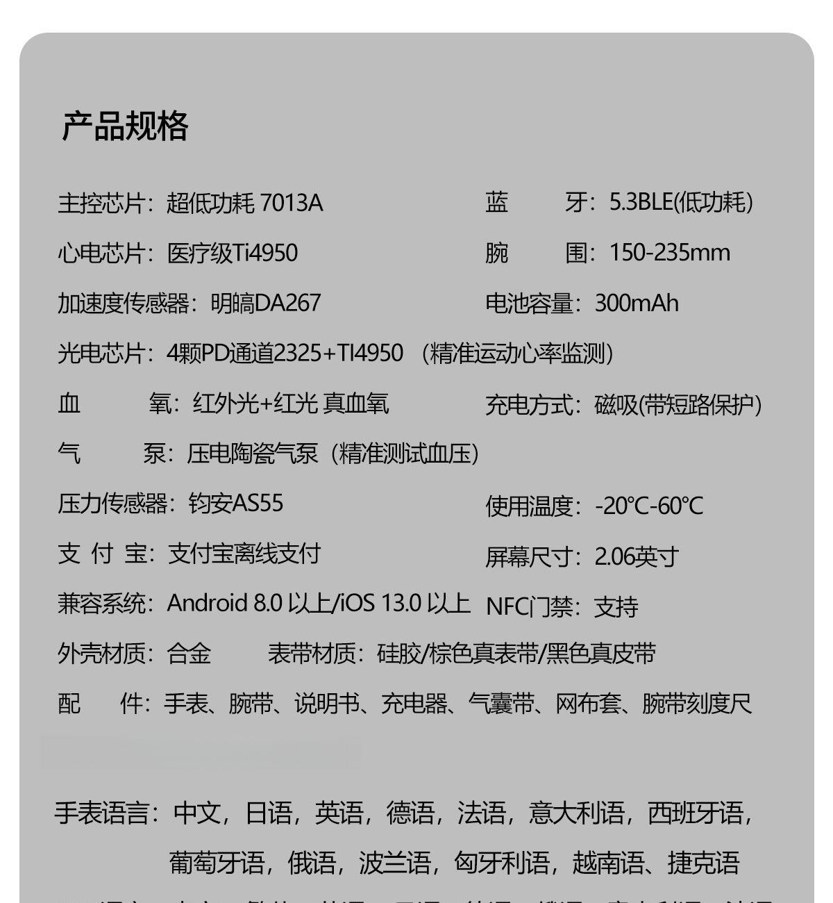 CPU: 超低功耗 JL7013A7 心电芯片:Ti4950级 屏幕尺寸: 2.06英寸410*502分辨率 使用时间:2-5天 充电方式:磁吸式 电池容量:300mAh 智能手表尺寸(mm):260*48*13mm 产品材质:合金金属+塑胶注塑+喷涂黑色全+硅胶表带 APP:G band 防水等级:IP66 产品清单:手表+气囊+表带、充电线、使用说明书、包装盒 1. 密闭腔体气泵气囊式血压测试,血压测试稳定,一致性好,精量姿势判断、错误姿势、错误结果过滤和提醒。(防水性能也更好), 2. 采用Ti4950进口级芯片+纳米超导心电玻璃,采集心电图 3. 4PD多通道动态心率血氧监测,采集心率血氧更 4. 一键微tijian功能,情绪检测,疲劳度检测 5. 皮电功能(测试情绪和交感神经活跃度、抑郁症风险等) 6. 科学睡眠(24小时睡眠监测) 其他:智能语音助手,蓝牙通话,支付宝离线支付,NFC门禁,SOS紧急呼叫功能,身体成分(体脂BMI)、无创xuetang评估,血液成分评估(尿酸血脂功能),梅脱功能,血氧监测,血压监测,呼吸训练,女性健康,心率监测,体温监测,手电筒,计步/卡路里/距离,多运动模式,闹钟,息屏显示功能,天气预报,游戏,音乐播放和控制。