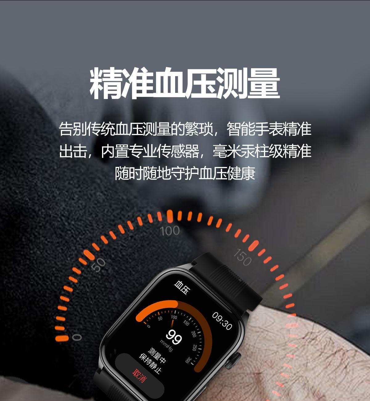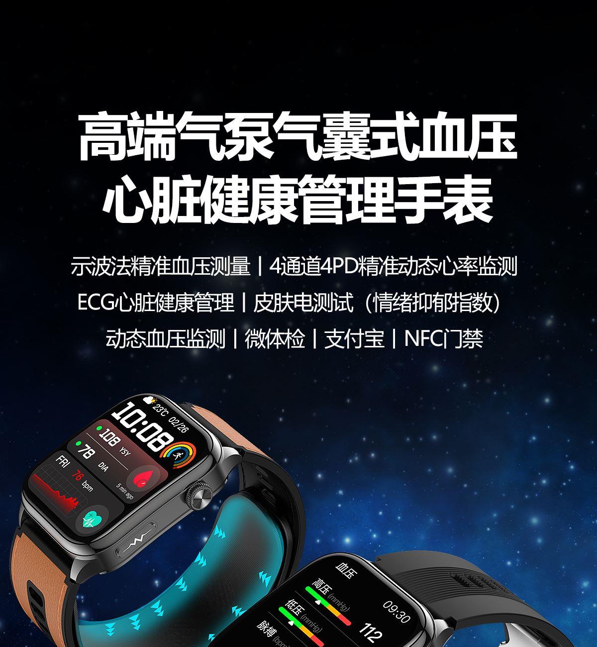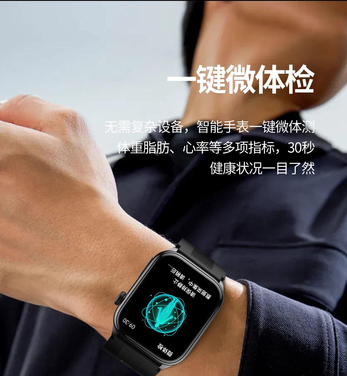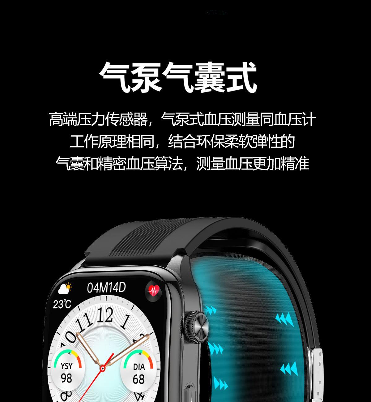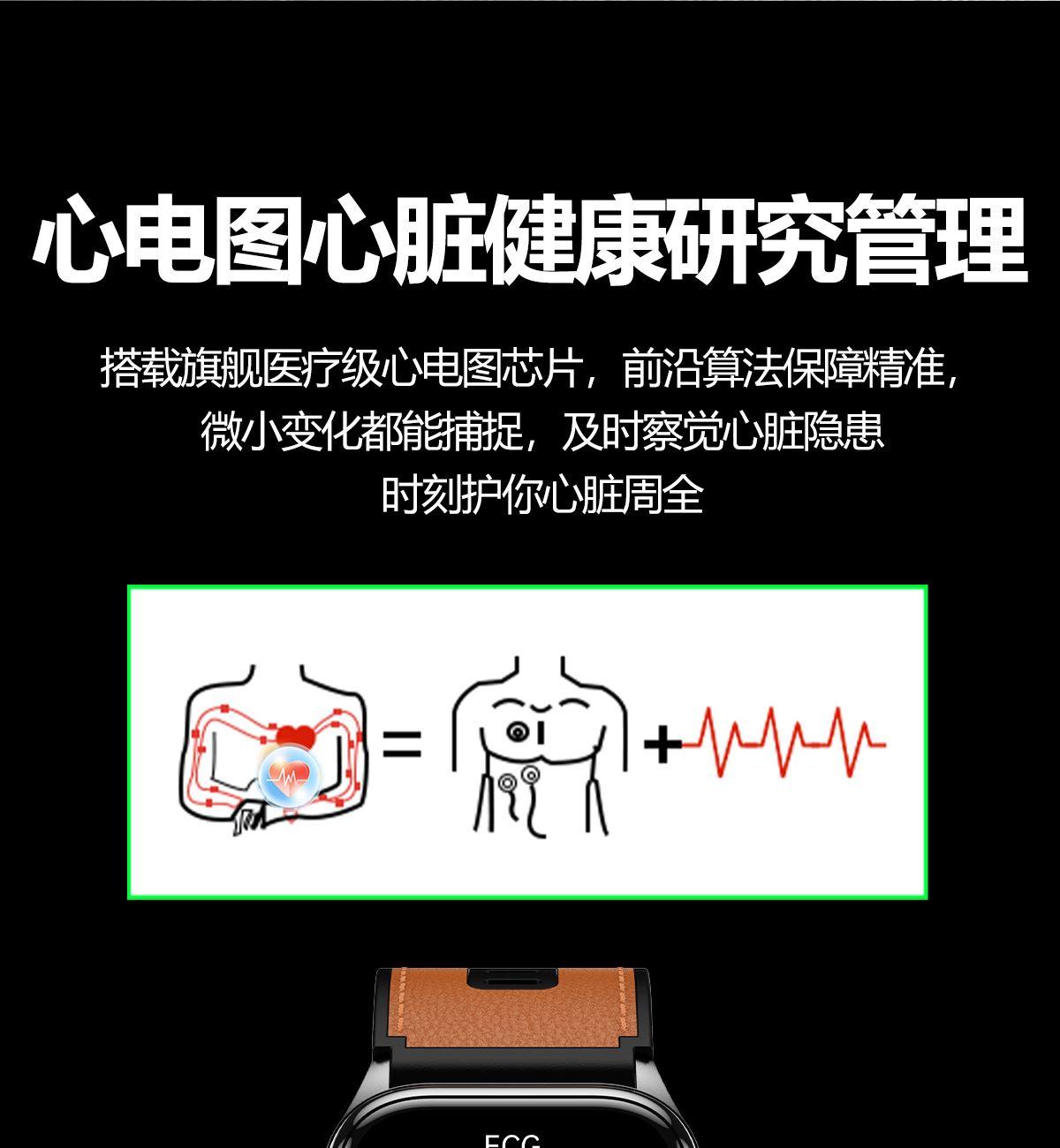 CPU: 超低功耗 JL7013A7 心电芯片:Ti4950级 屏幕尺寸: 2.06英寸410*502分辨率 使用时间:2-5天 充电方式:磁吸式 电池容量:300mAh 智能手表尺寸(mm):260*48*13mm 产品材质:合金金属+塑胶注塑+喷涂黑色全+硅胶表带 APP:G band 防水等级:IP66 产品清单:手表+气囊+表带、充电线、使用说明书、包装盒 1. 密闭腔体气泵气囊式血压测试,血压测试稳定,一致性好,精量姿势判断、错误姿势、错误结果过滤和提醒。(防水性能也更好), 2. 采用Ti4950进口级芯片+纳米超导心电玻璃,采集心电图 3. 4PD多通道动态心率血氧监测,采集心率血氧更 4. 一键微tijian功能,情绪检测,疲劳度检测 5. 皮电功能(测试情绪和交感神经活跃度、抑郁症风险等) 6. 科学睡眠(24小时睡眠监测) 其他:智能语音助手,蓝牙通话,支付宝离线支付,NFC门禁,SOS紧急呼叫功能,身体成分(体脂BMI)、无创xuetang评估,血液成分评估(尿酸血脂功能),梅脱功能,血氧监测,血压监测,呼吸训练,女性健康,心率监测,体温监测,手电筒,计步/卡路里/距离,多运动模式,闹钟,息屏显示功能,天气预报,游戏,音乐播放和控制。