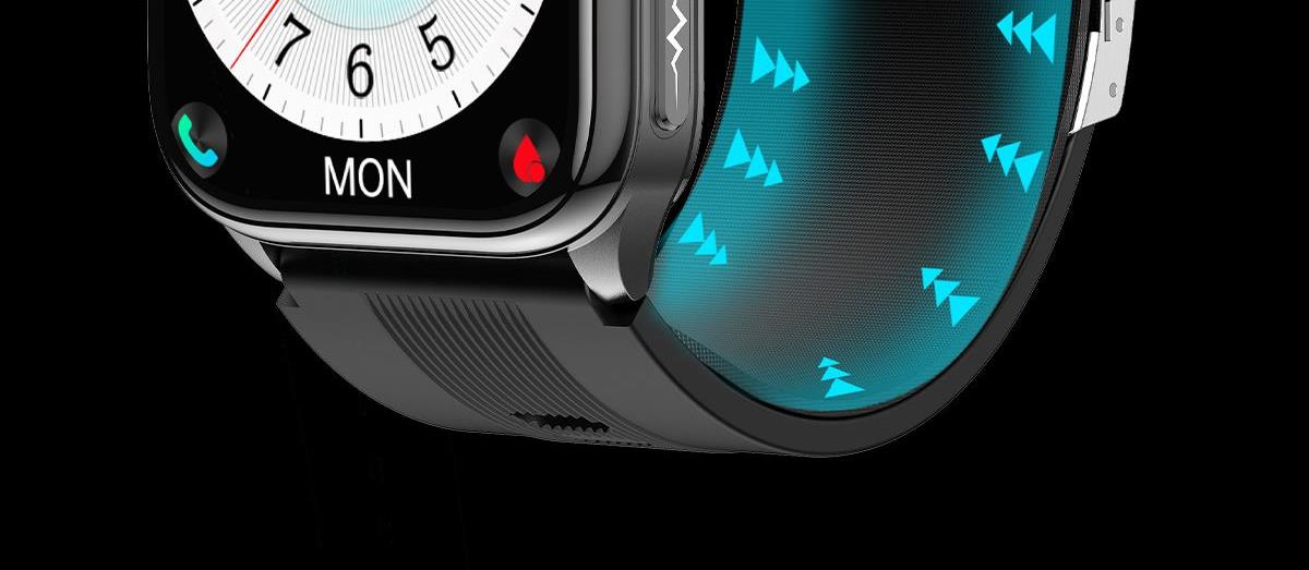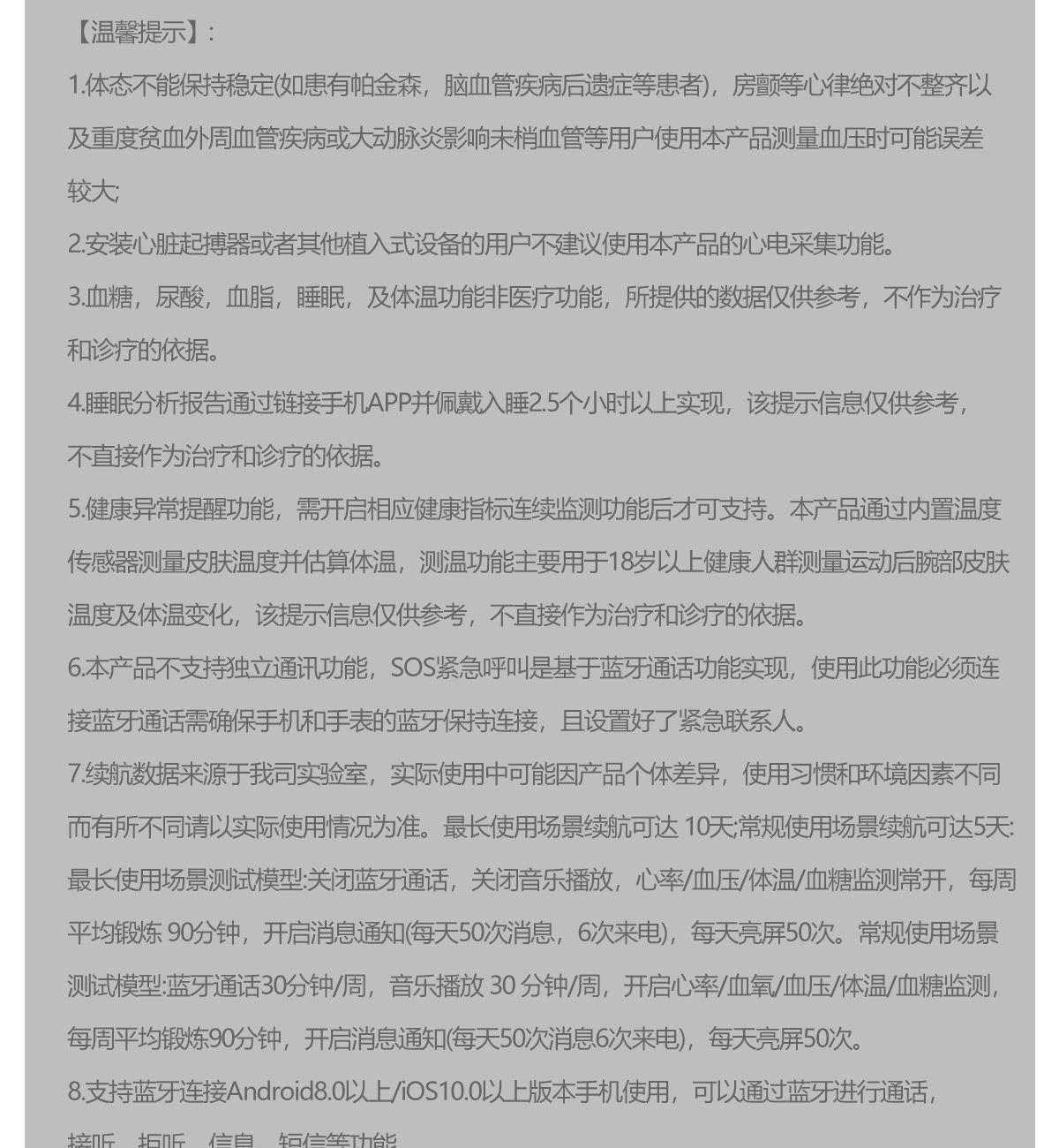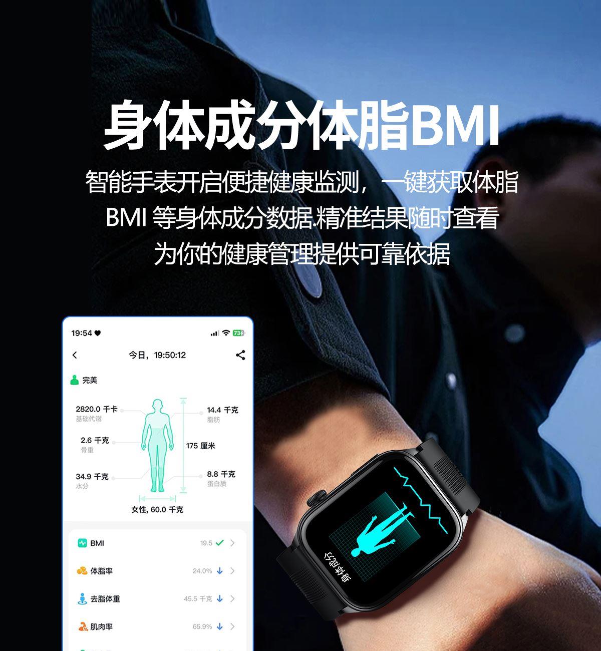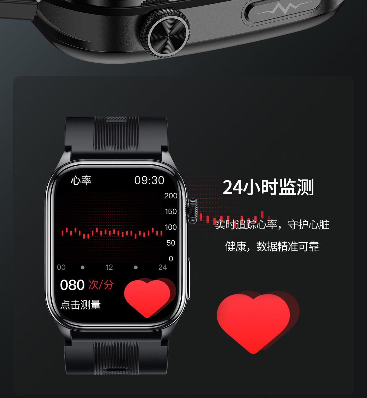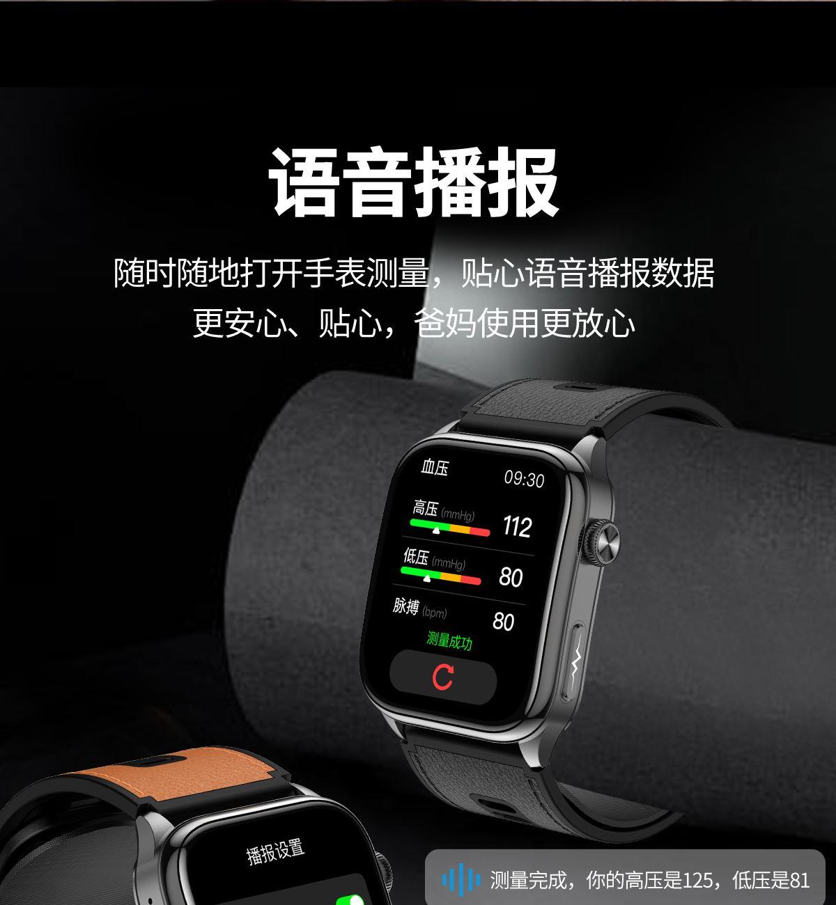 CPU: 超低功耗 JL7013A7 心电芯片:Ti4950级 屏幕尺寸: 2.06英寸410*502分辨率 使用时间:2-5天 充电方式:磁吸式 电池容量:300mAh 智能手表尺寸(mm):260*48*13mm 产品材质:合金金属+塑胶注塑+喷涂黑色全+硅胶表带 APP:G band 防水等级:IP66 产品清单:手表+气囊+表带、充电线、使用说明书、包装盒 1. 密闭腔体气泵气囊式血压测试,血压测试稳定,一致性好,精量姿势判断、错误姿势、错误结果过滤和提醒。(防水性能也更好), 2. 采用Ti4950进口级芯片+纳米超导心电玻璃,采集心电图 3. 4PD多通道动态心率血氧监测,采集心率血氧更 4. 一键微tijian功能,情绪检测,疲劳度检测 5. 皮电功能(测试情绪和交感神经活跃度、抑郁症风险等) 6. 科学睡眠(24小时睡眠监测) 其他:智能语音助手,蓝牙通话,支付宝离线支付,NFC门禁,SOS紧急呼叫功能,身体成分(体脂BMI)、无创xuetang评估,血液成分评估(尿酸血脂功能),梅脱功能,血氧监测,血压监测,呼吸训练,女性健康,心率监测,体温监测,手电筒,计步/卡路里/距离,多运动模式,闹钟,息屏显示功能,天气预报,游戏,音乐播放和控制。