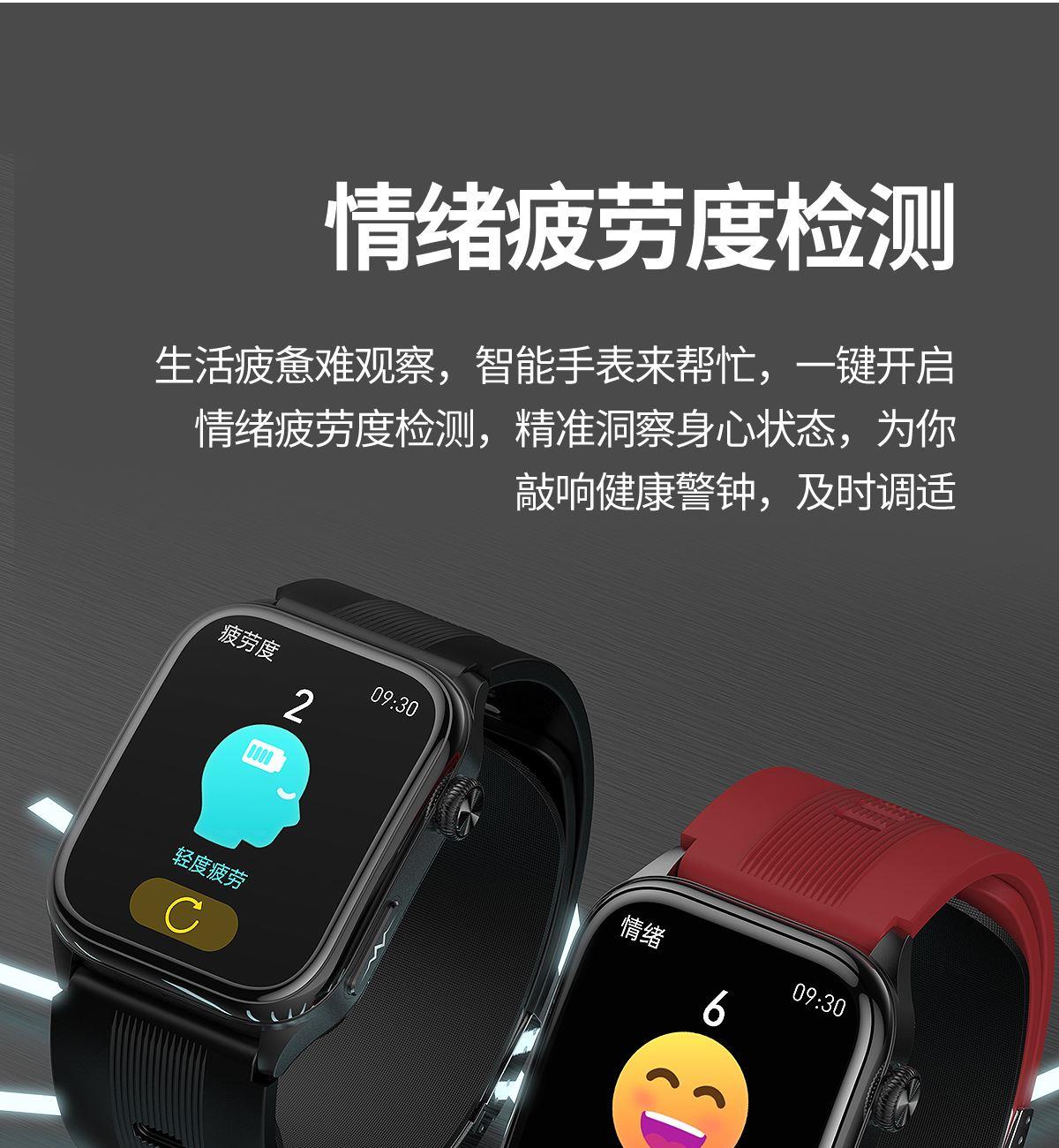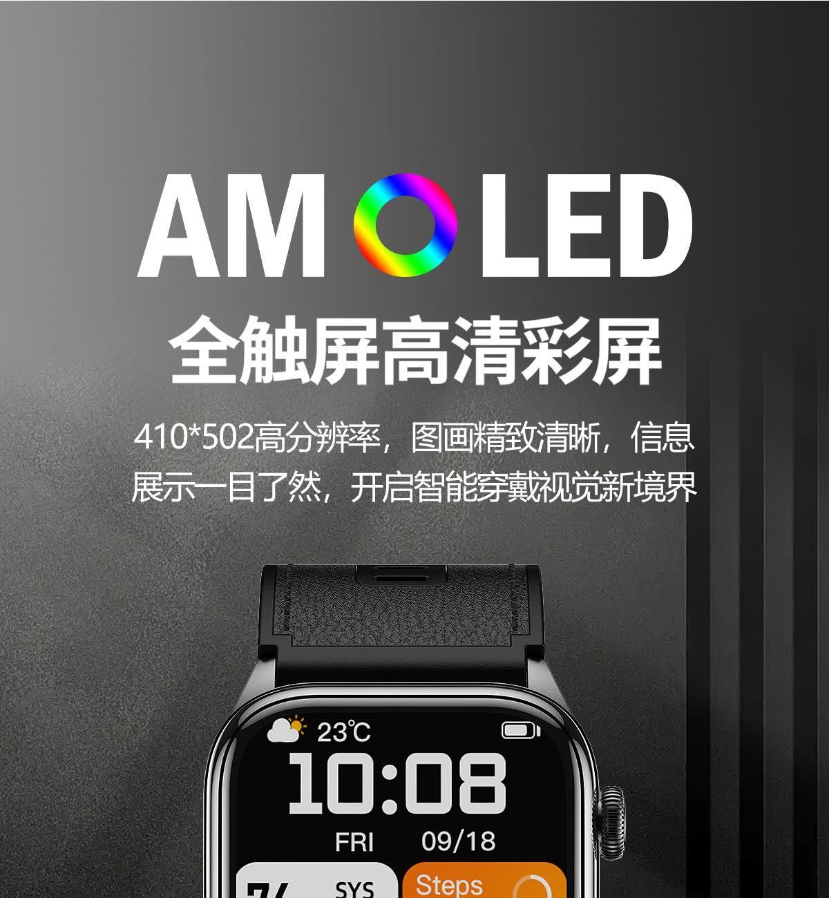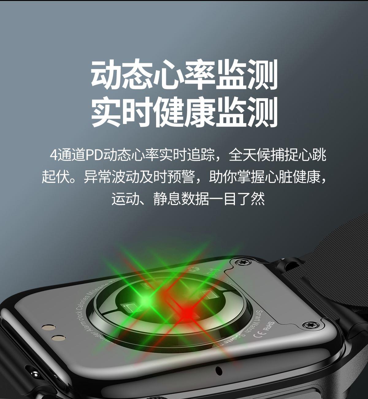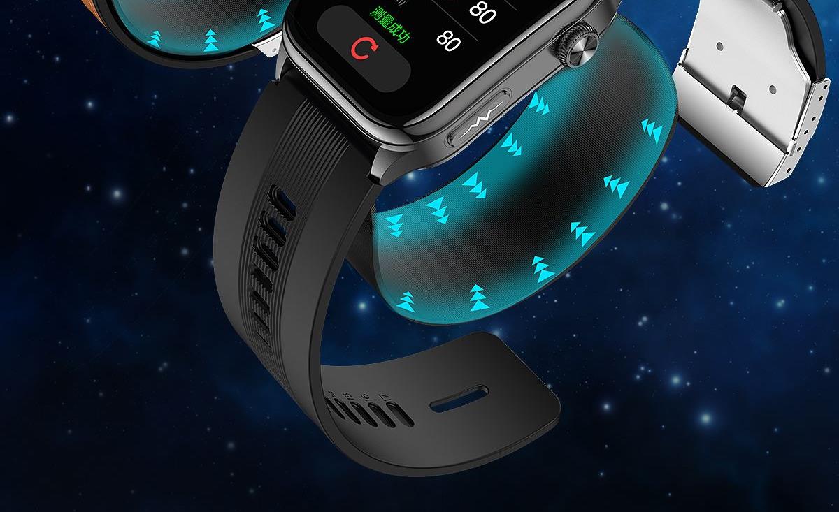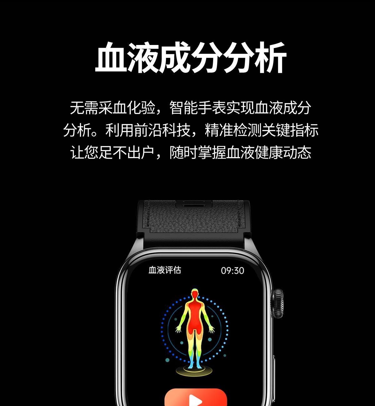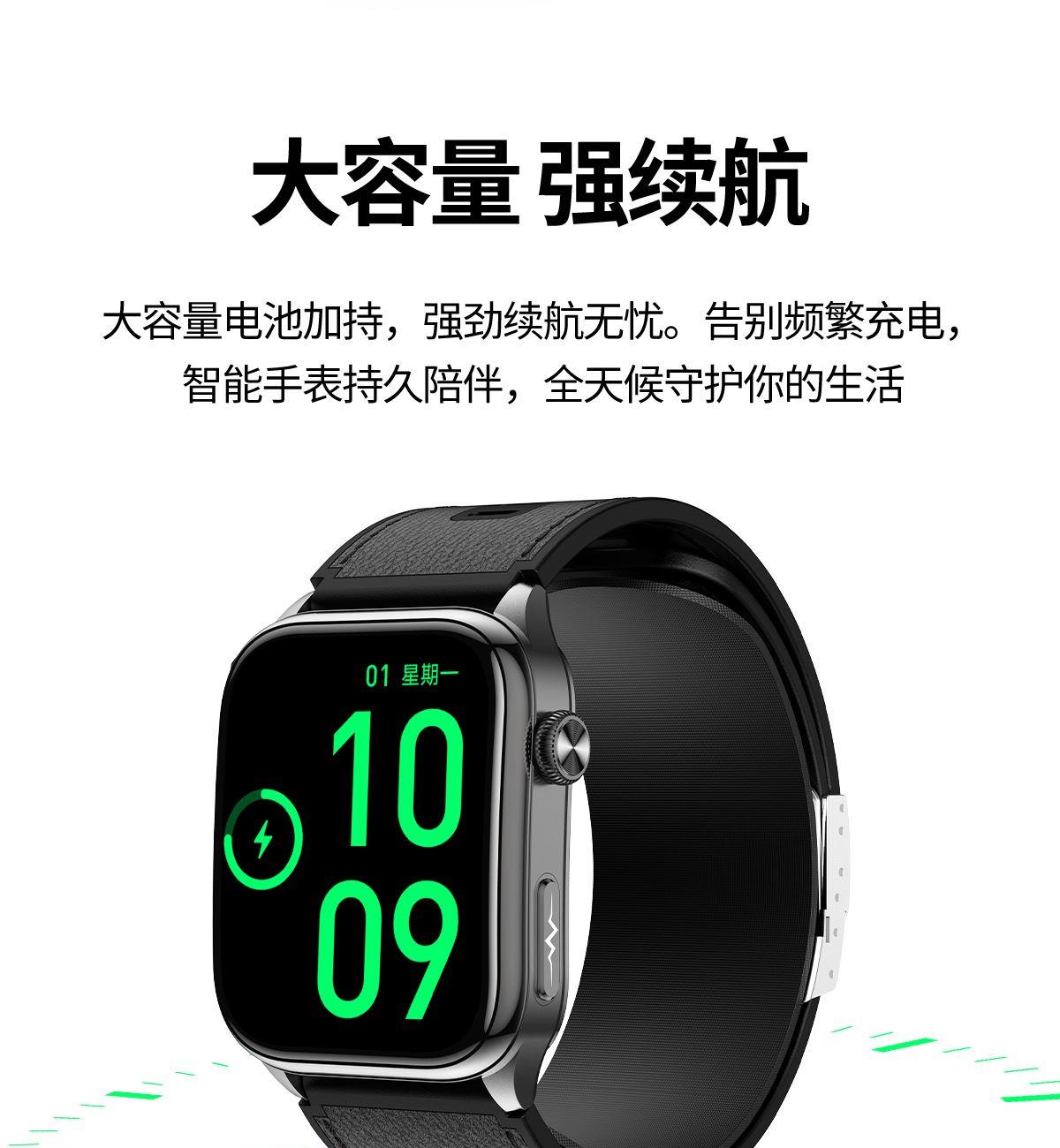 CPU: 超低功耗 JL7013A7 心电芯片:Ti4950级 屏幕尺寸: 2.06英寸410*502分辨率 使用时间:2-5天 充电方式:磁吸式 电池容量:300mAh 智能手表尺寸(mm):260*48*13mm 产品材质:合金金属+塑胶注塑+喷涂黑色全+硅胶表带 APP:G band 防水等级:IP66 产品清单:手表+气囊+表带、充电线、使用说明书、包装盒 1. 密闭腔体气泵气囊式血压测试,血压测试稳定,一致性好,精量姿势判断、错误姿势、错误结果过滤和提醒。(防水性能也更好), 2. 采用Ti4950进口级芯片+纳米超导心电玻璃,采集心电图 3. 4PD多通道动态心率血氧监测,采集心率血氧更 4. 一键微tijian功能,情绪检测,疲劳度检测 5. 皮电功能(测试情绪和交感神经活跃度、抑郁症风险等) 6. 科学睡眠(24小时睡眠监测) 其他:智能语音助手,蓝牙通话,支付宝离线支付,NFC门禁,SOS紧急呼叫功能,身体成分(体脂BMI)、无创xuetang评估,血液成分评估(尿酸血脂功能),梅脱功能,血氧监测,血压监测,呼吸训练,女性健康,心率监测,体温监测,手电筒,计步/卡路里/距离,多运动模式,闹钟,息屏显示功能,天气预报,游戏,音乐播放和控制。
