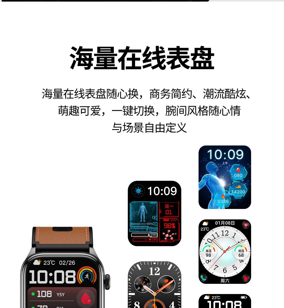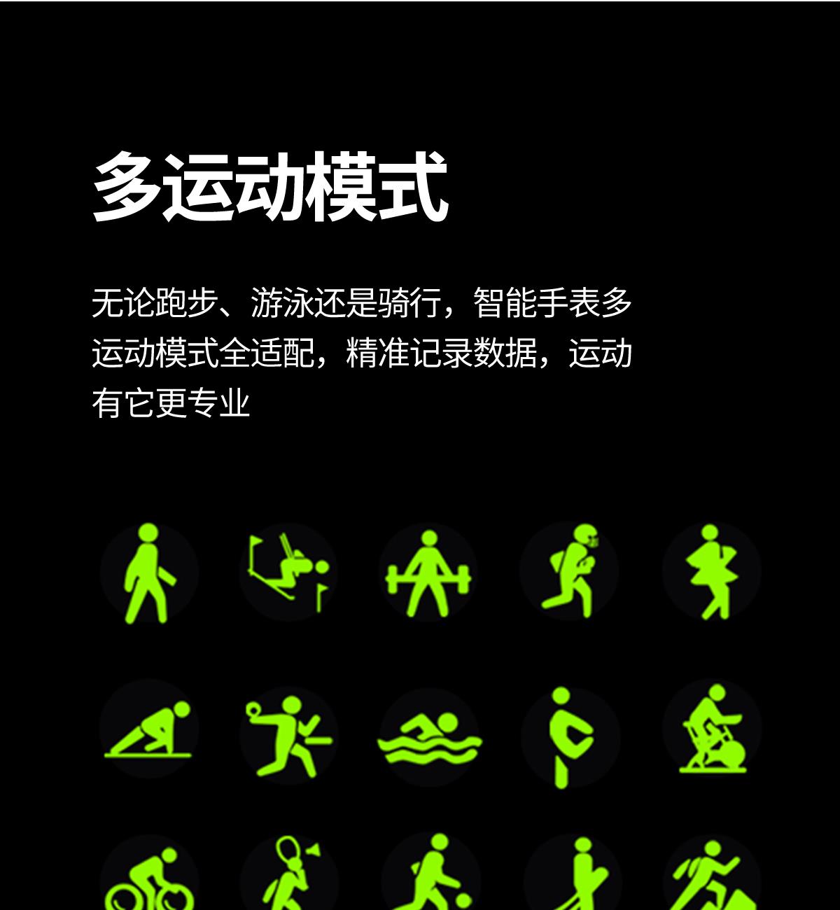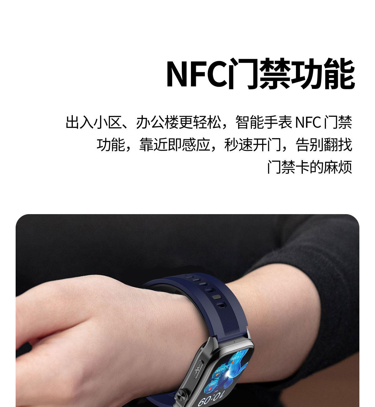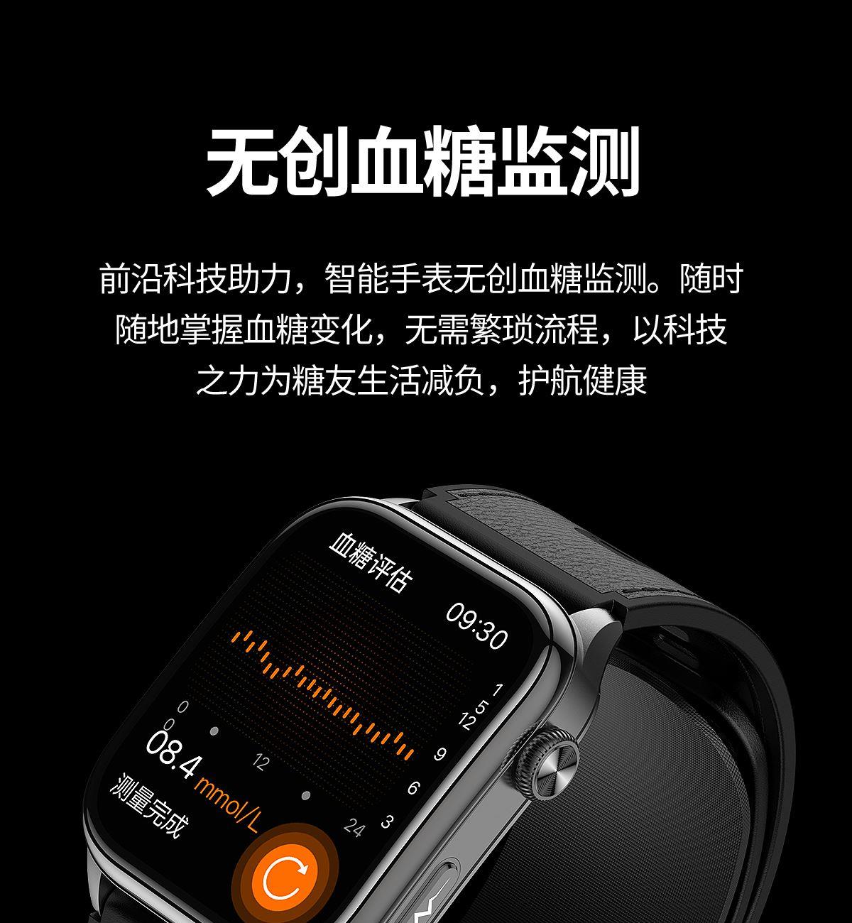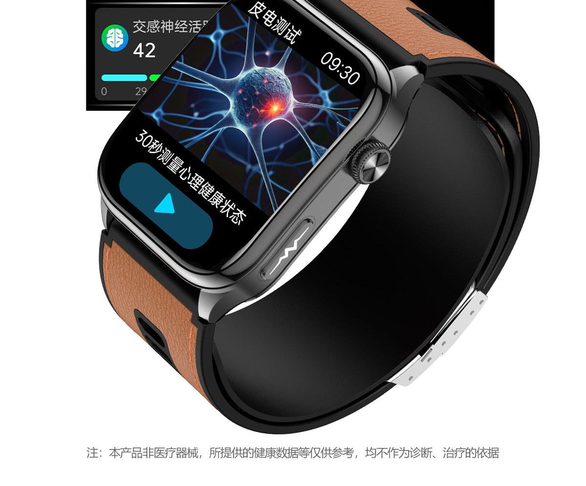 CPU: 超低功耗 JL7013A7 心电芯片:Ti4950级 屏幕尺寸: 2.06英寸410*502分辨率 使用时间:2-5天 充电方式:磁吸式 电池容量:300mAh 智能手表尺寸(mm):260*48*13mm 产品材质:合金金属+塑胶注塑+喷涂黑色全+硅胶表带 APP:G band 防水等级:IP66 产品清单:手表+气囊+表带、充电线、使用说明书、包装盒 1. 密闭腔体气泵气囊式血压测试,血压测试稳定,一致性好,精量姿势判断、错误姿势、错误结果过滤和提醒。(防水性能也更好), 2. 采用Ti4950进口级芯片+纳米超导心电玻璃,采集心电图 3. 4PD多通道动态心率血氧监测,采集心率血氧更 4. 一键微tijian功能,情绪检测,疲劳度检测 5. 皮电功能(测试情绪和交感神经活跃度、抑郁症风险等) 6. 科学睡眠(24小时睡眠监测) 其他:智能语音助手,蓝牙通话,支付宝离线支付,NFC门禁,SOS紧急呼叫功能,身体成分(体脂BMI)、无创xuetang评估,血液成分评估(尿酸血脂功能),梅脱功能,血氧监测,血压监测,呼吸训练,女性健康,心率监测,体温监测,手电筒,计步/卡路里/距离,多运动模式,闹钟,息屏显示功能,天气预报,游戏,音乐播放和控制。