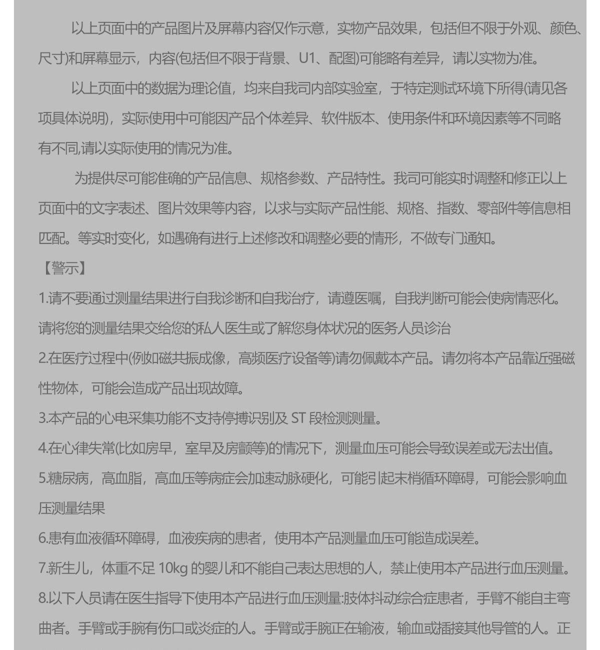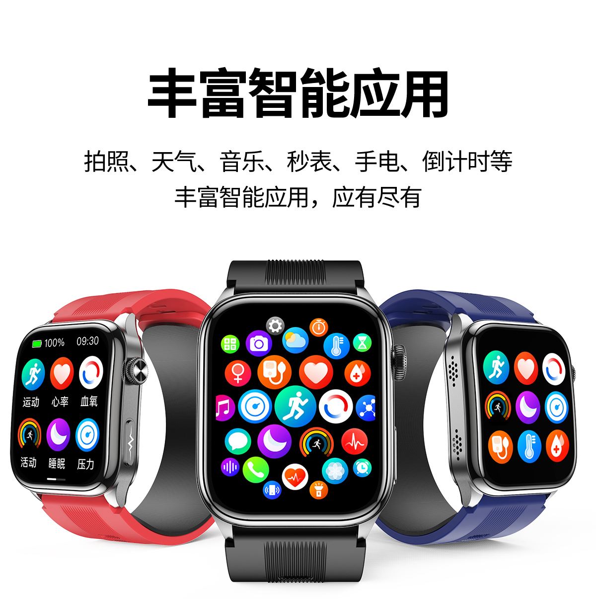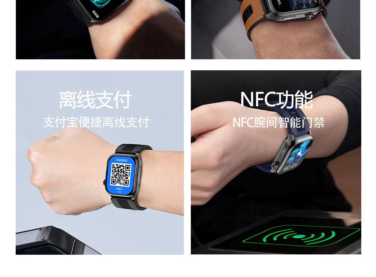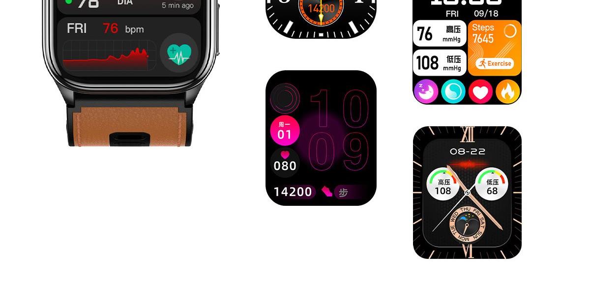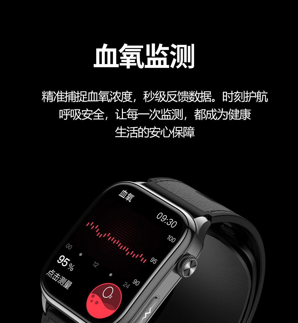 CPU: 超低功耗 JL7013A7 心电芯片:Ti4950级 屏幕尺寸: 2.06英寸410*502分辨率 使用时间:2-5天 充电方式:磁吸式 电池容量:300mAh 智能手表尺寸(mm):260*48*13mm 产品材质:合金金属+塑胶注塑+喷涂黑色全+硅胶表带 APP:G band 防水等级:IP66 产品清单:手表+气囊+表带、充电线、使用说明书、包装盒 1. 密闭腔体气泵气囊式血压测试,血压测试稳定,一致性好,精量姿势判断、错误姿势、错误结果过滤和提醒。(防水性能也更好), 2. 采用Ti4950进口级芯片+纳米超导心电玻璃,采集心电图 3. 4PD多通道动态心率血氧监测,采集心率血氧更 4. 一键微tijian功能,情绪检测,疲劳度检测 5. 皮电功能(测试情绪和交感神经活跃度、抑郁症风险等) 6. 科学睡眠(24小时睡眠监测) 其他:智能语音助手,蓝牙通话,支付宝离线支付,NFC门禁,SOS紧急呼叫功能,身体成分(体脂BMI)、无创xuetang评估,血液成分评估(尿酸血脂功能),梅脱功能,血氧监测,血压监测,呼吸训练,女性健康,心率监测,体温监测,手电筒,计步/卡路里/距离,多运动模式,闹钟,息屏显示功能,天气预报,游戏,音乐播放和控制。