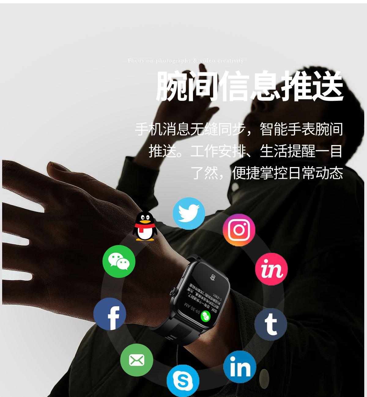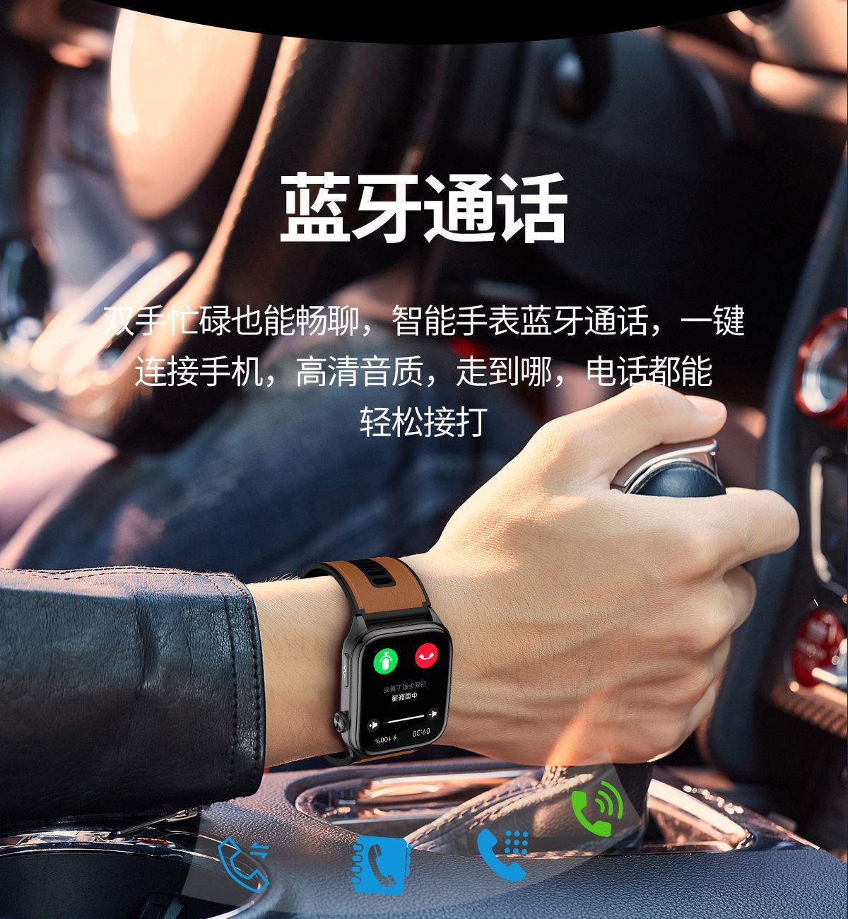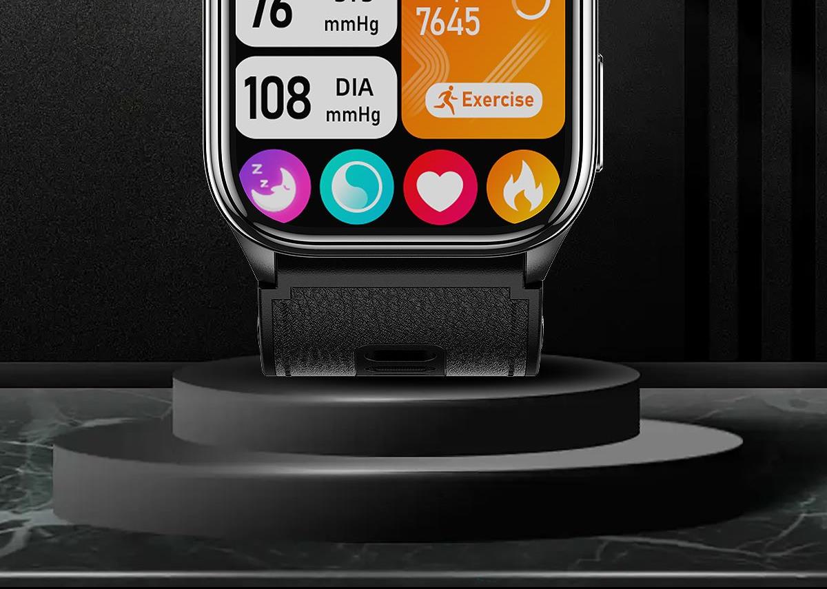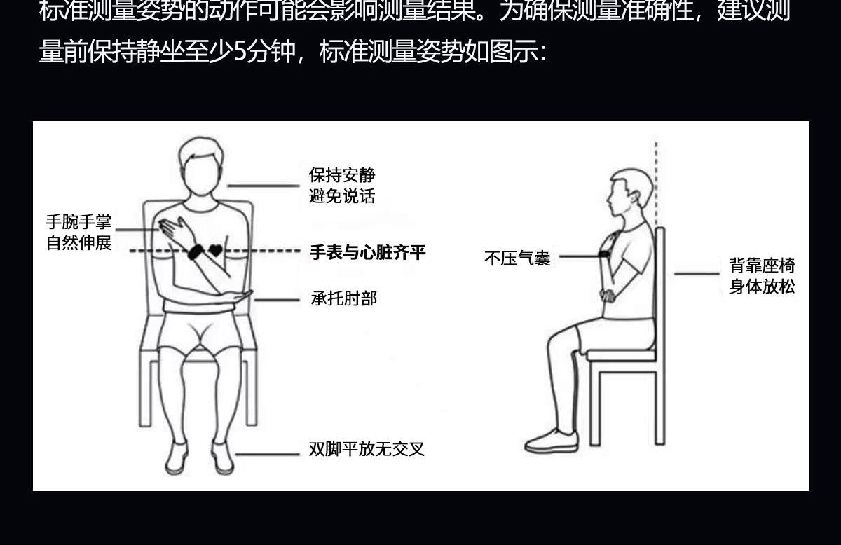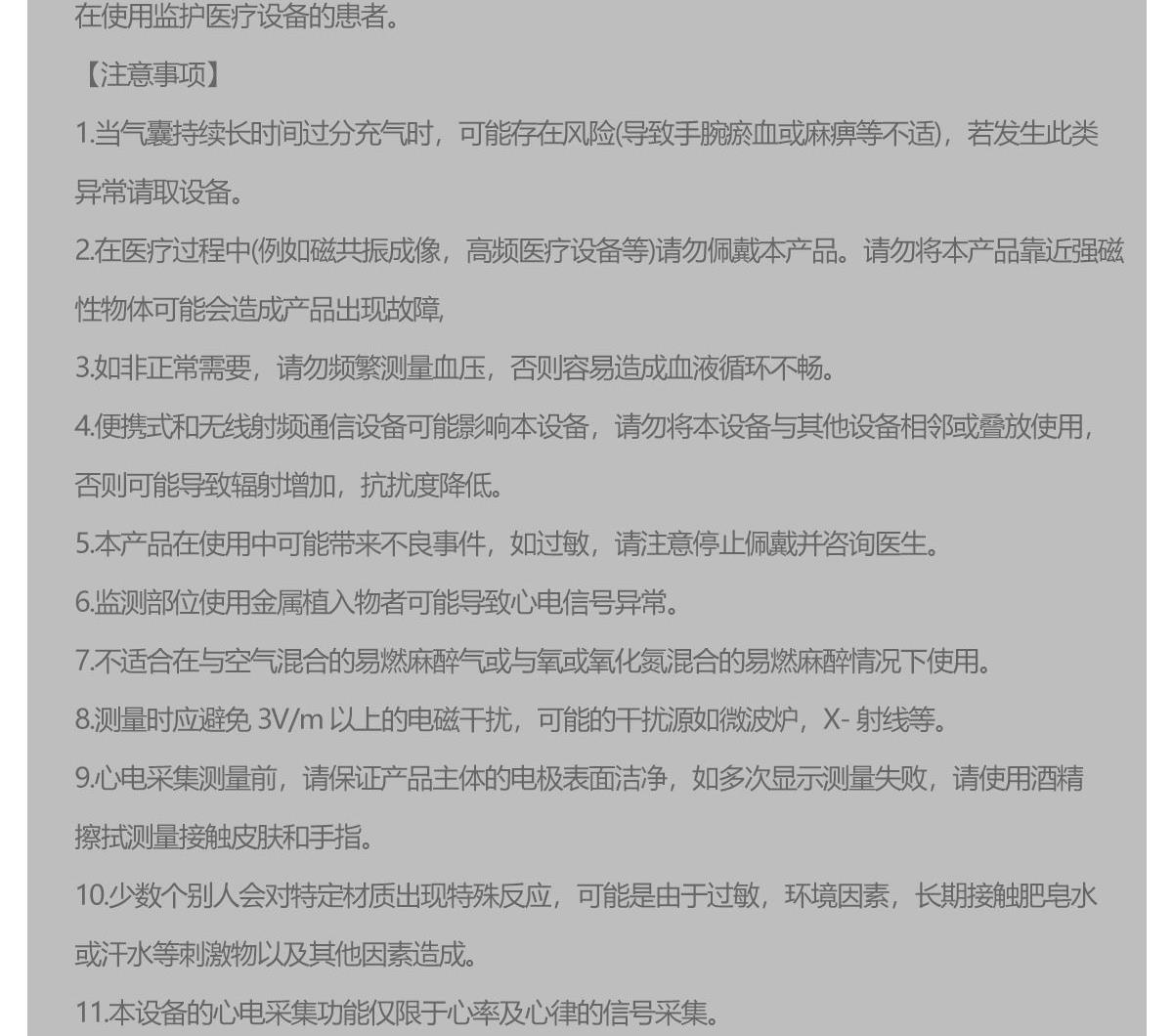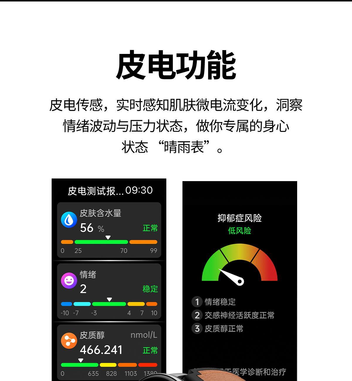 CPU: 超低功耗 JL7013A7 心电芯片:Ti4950级 屏幕尺寸: 2.06英寸410*502分辨率 使用时间:2-5天 充电方式:磁吸式 电池容量:300mAh 智能手表尺寸(mm):260*48*13mm 产品材质:合金金属+塑胶注塑+喷涂黑色全+硅胶表带 APP:G band 防水等级:IP66 产品清单:手表+气囊+表带、充电线、使用说明书、包装盒 1. 密闭腔体气泵气囊式血压测试,血压测试稳定,一致性好,精量姿势判断、错误姿势、错误结果过滤和提醒。(防水性能也更好), 2. 采用Ti4950进口级芯片+纳米超导心电玻璃,采集心电图 3. 4PD多通道动态心率血氧监测,采集心率血氧更 4. 一键微tijian功能,情绪检测,疲劳度检测 5. 皮电功能(测试情绪和交感神经活跃度、抑郁症风险等) 6. 科学睡眠(24小时睡眠监测) 其他:智能语音助手,蓝牙通话,支付宝离线支付,NFC门禁,SOS紧急呼叫功能,身体成分(体脂BMI)、无创xuetang评估,血液成分评估(尿酸血脂功能),梅脱功能,血氧监测,血压监测,呼吸训练,女性健康,心率监测,体温监测,手电筒,计步/卡路里/距离,多运动模式,闹钟,息屏显示功能,天气预报,游戏,音乐播放和控制。