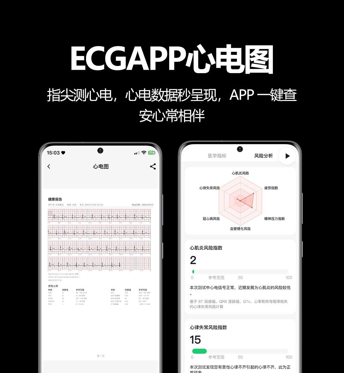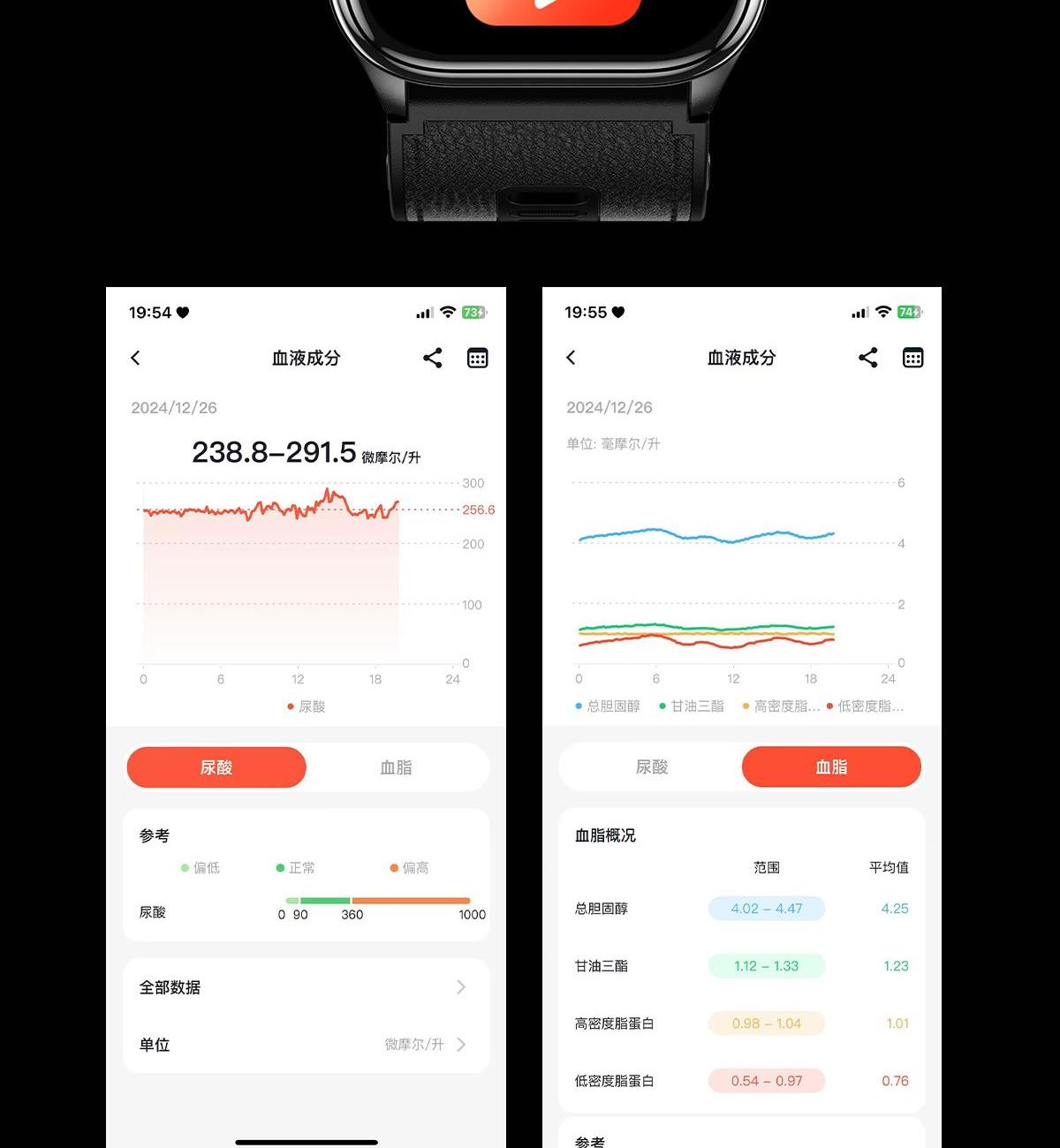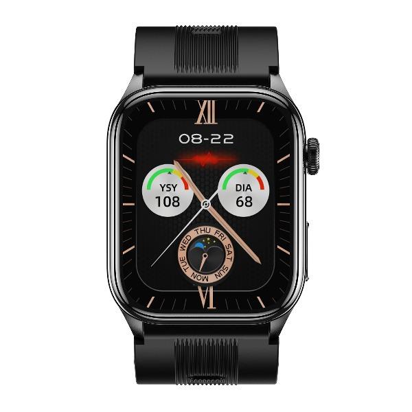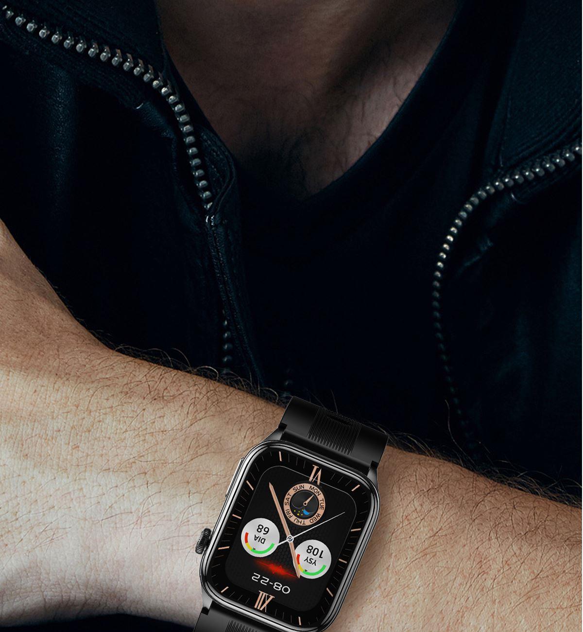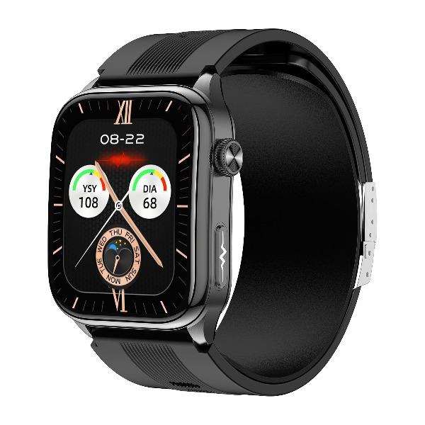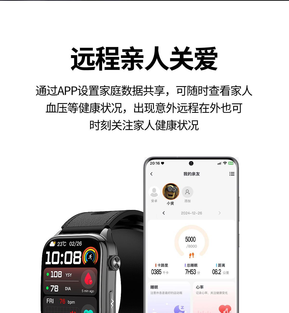 CPU: 超低功耗 JL7013A7 心电芯片:Ti4950级 屏幕尺寸: 2.06英寸410*502分辨率 使用时间:2-5天 充电方式:磁吸式 电池容量:300mAh 智能手表尺寸(mm):260*48*13mm 产品材质:合金金属+塑胶注塑+喷涂黑色全+硅胶表带 APP:G band 防水等级:IP66 产品清单:手表+气囊+表带、充电线、使用说明书、包装盒 1. 密闭腔体气泵气囊式血压测试,血压测试稳定,一致性好,精量姿势判断、错误姿势、错误结果过滤和提醒。(防水性能也更好), 2. 采用Ti4950进口级芯片+纳米超导心电玻璃,采集心电图 3. 4PD多通道动态心率血氧监测,采集心率血氧更 4. 一键微tijian功能,情绪检测,疲劳度检测 5. 皮电功能(测试情绪和交感神经活跃度、抑郁症风险等) 6. 科学睡眠(24小时睡眠监测) 其他:智能语音助手,蓝牙通话,支付宝离线支付,NFC门禁,SOS紧急呼叫功能,身体成分(体脂BMI)、无创xuetang评估,血液成分评估(尿酸血脂功能),梅脱功能,血氧监测,血压监测,呼吸训练,女性健康,心率监测,体温监测,手电筒,计步/卡路里/距离,多运动模式,闹钟,息屏显示功能,天气预报,游戏,音乐播放和控制。