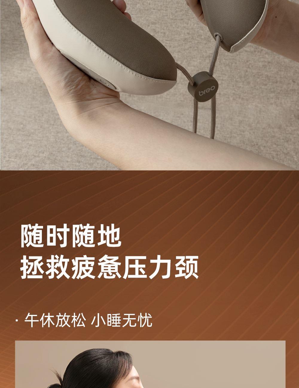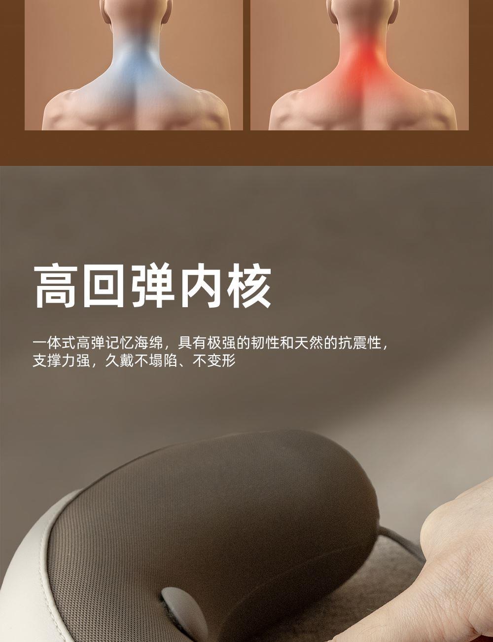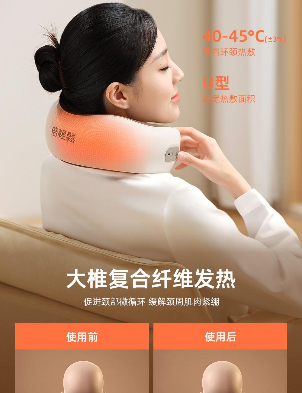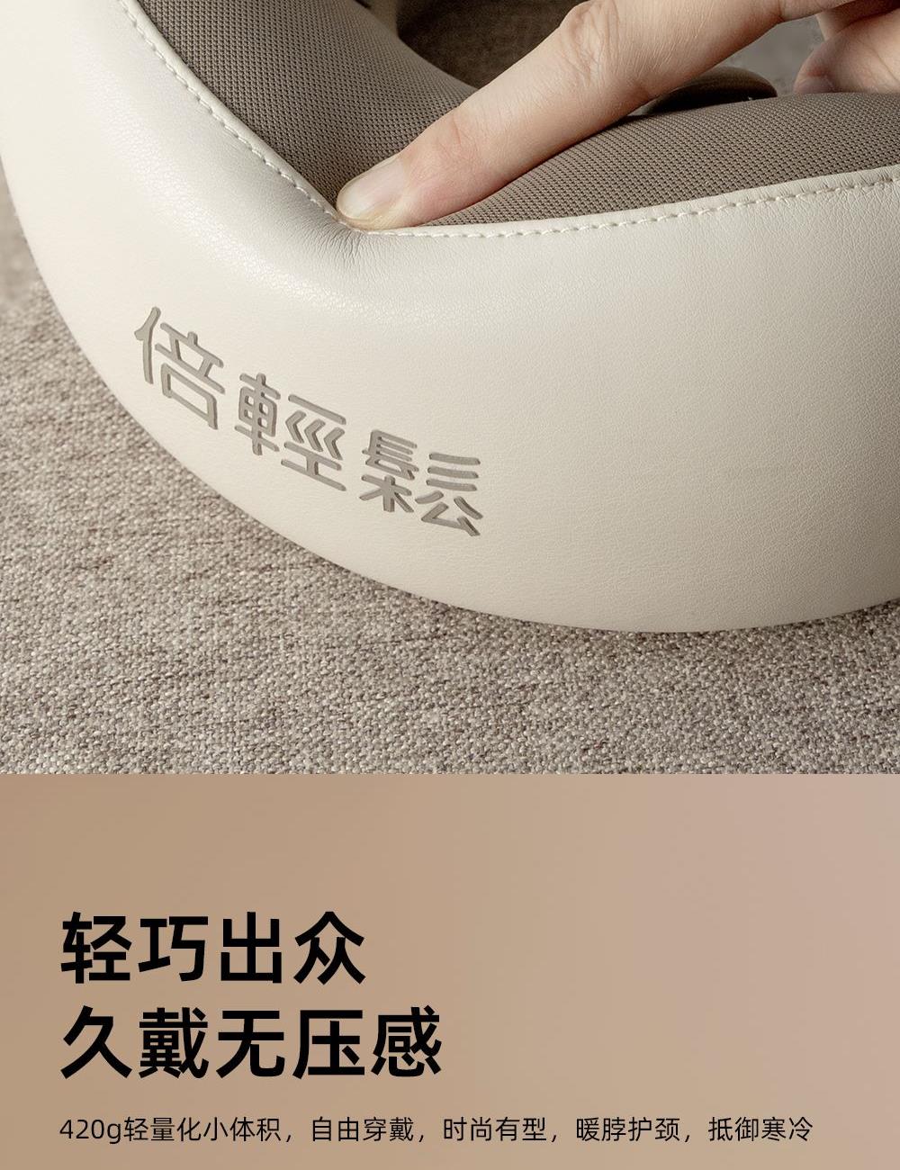 微震轻巧点按,畅享舒适按摩 360°环颈承托,多维稳固承托 42-48°C两档环颈热敷,U型超宽热敷面积,舒缓疲劳 外置帽衫式锁扣,轻轻一拉轻松调节松紧度 一体式高弹记忆海绵,高回弹内核,柔软舒适,温柔亲肤 40dB低噪体验,静享舒适小憩时光