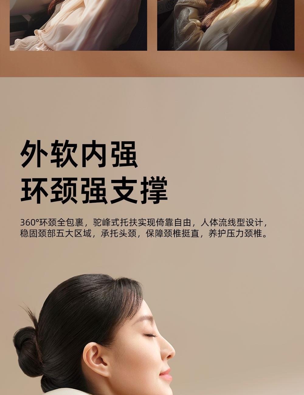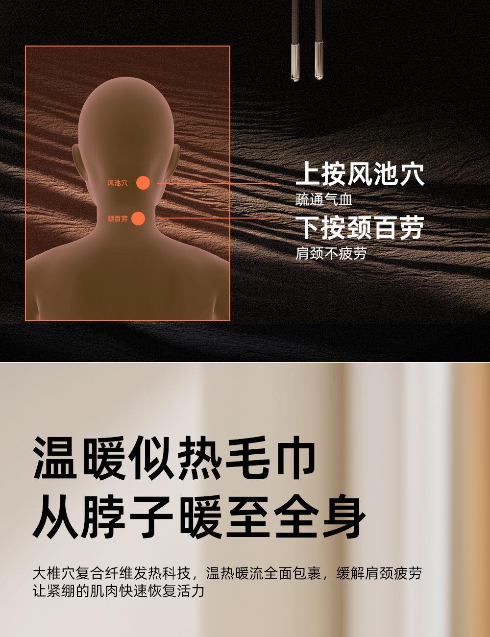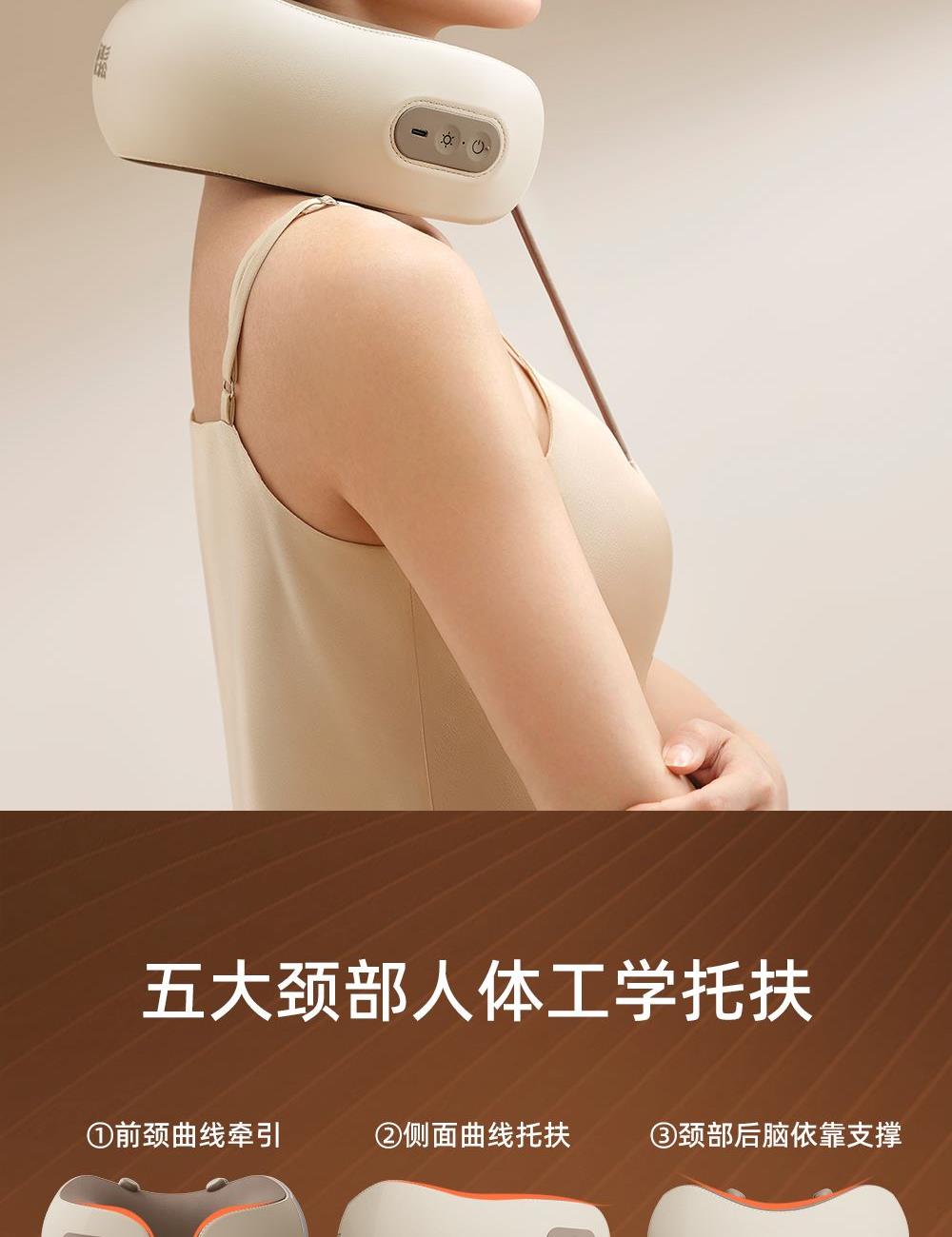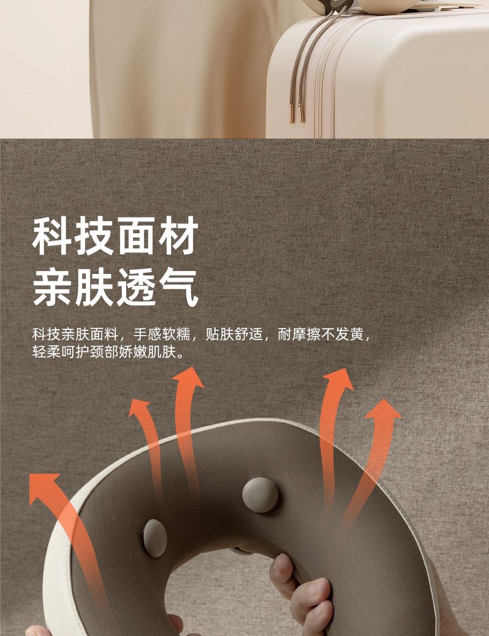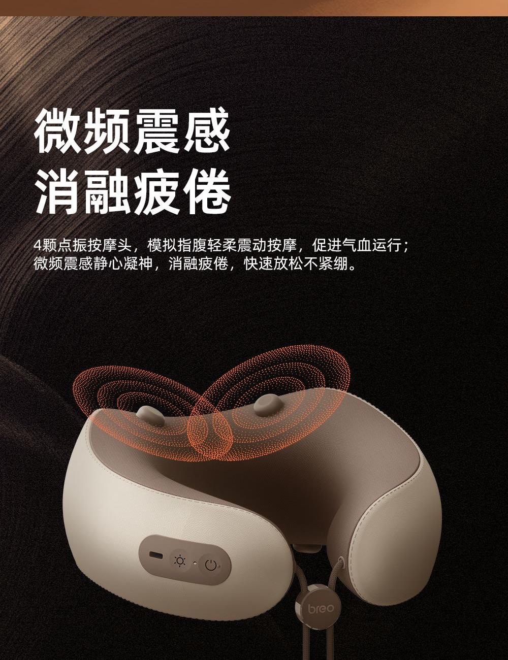 微震轻巧点按,畅享舒适按摩 360°环颈承托,多维稳固承托 42-48°C两档环颈热敷,U型超宽热敷面积,舒缓疲劳 外置帽衫式锁扣,轻轻一拉轻松调节松紧度 一体式高弹记忆海绵,高回弹内核,柔软舒适,温柔亲肤 40dB低噪体验,静享舒适小憩时光