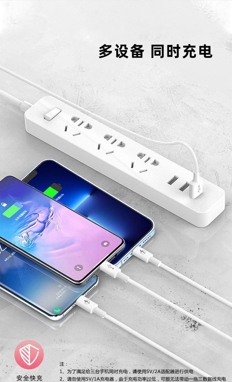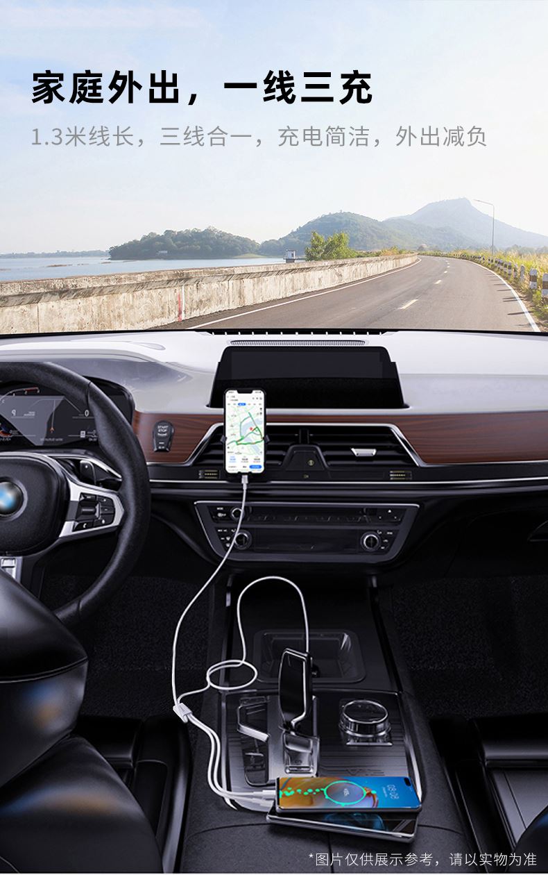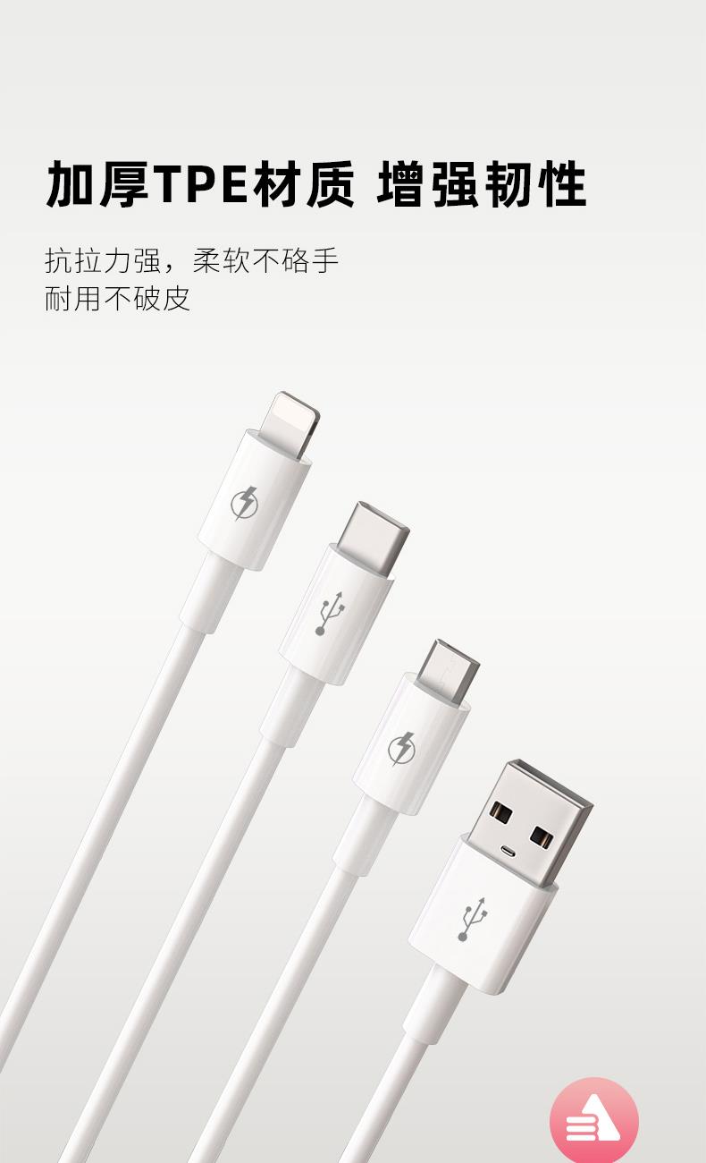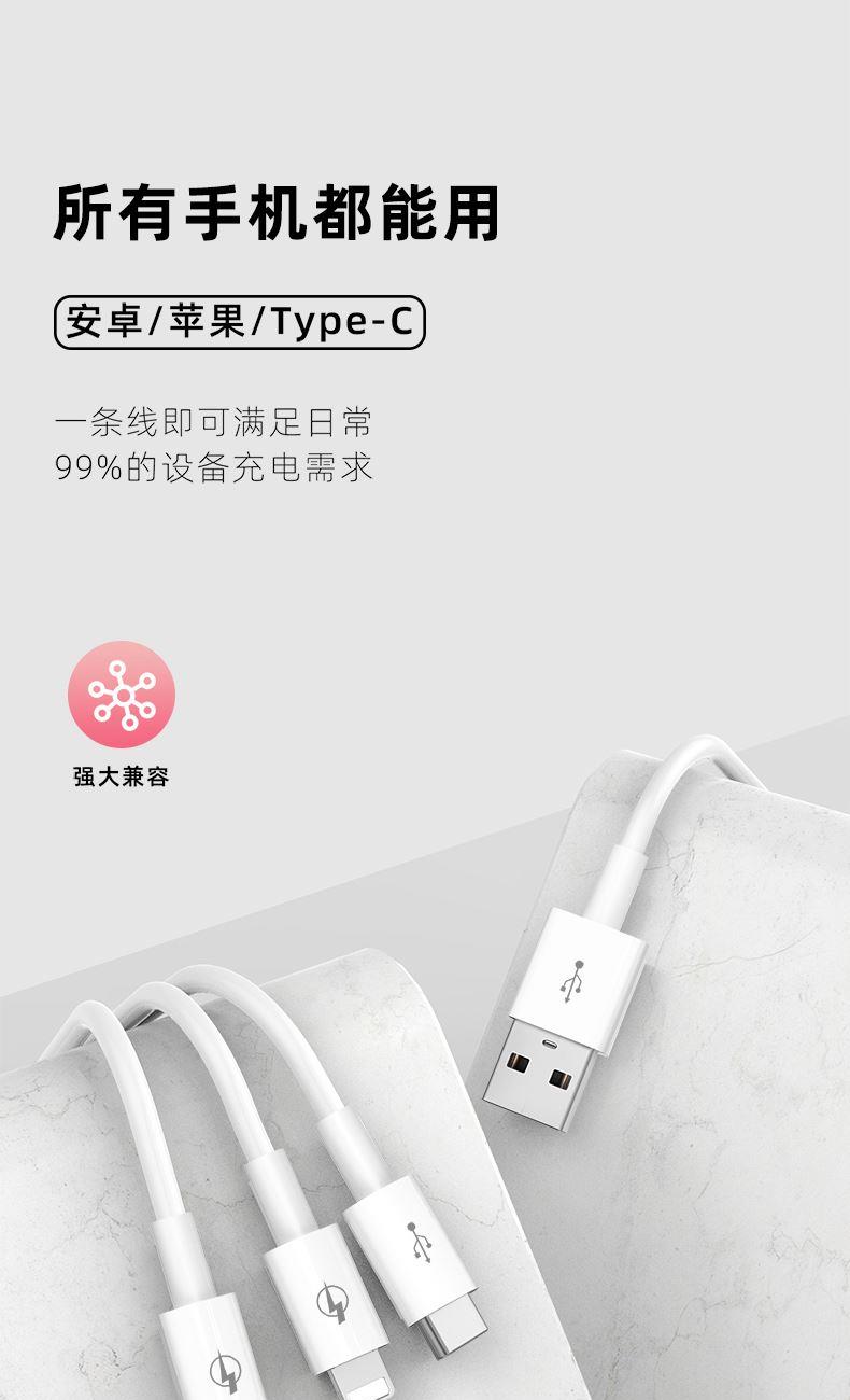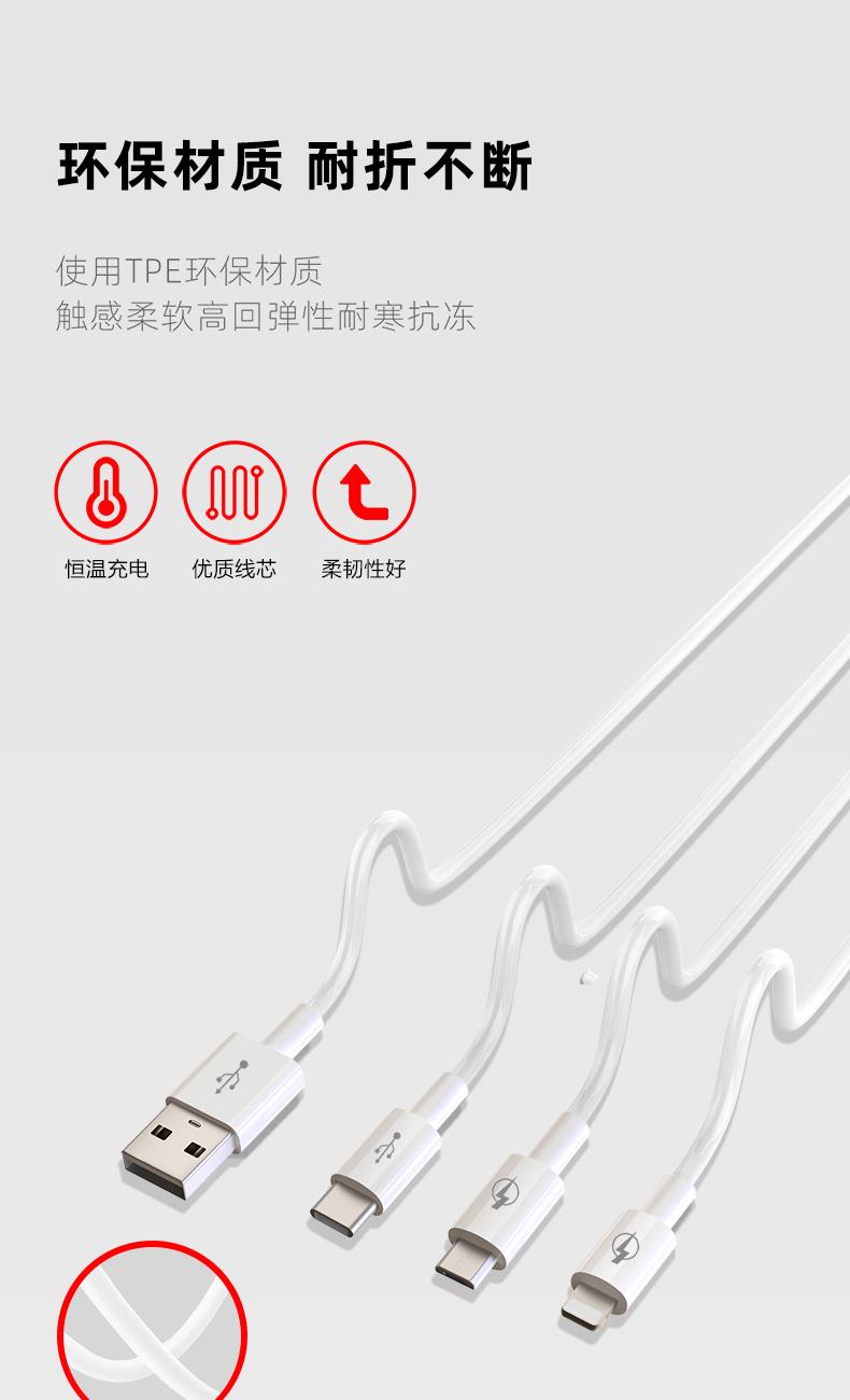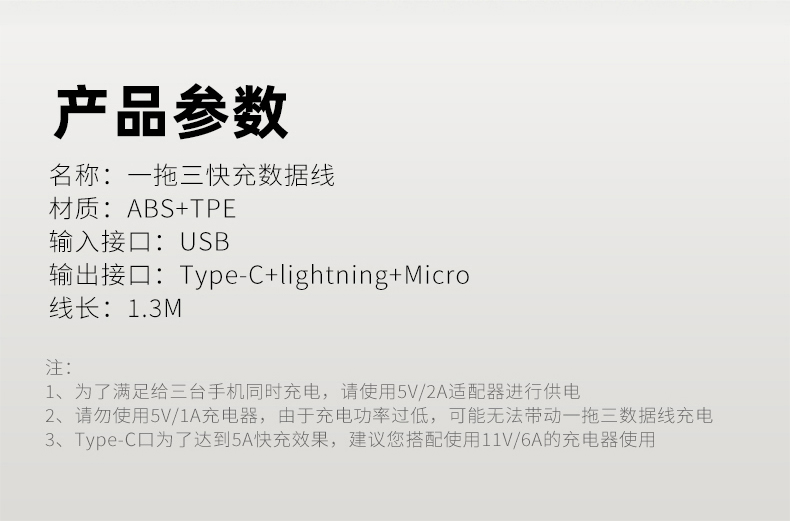 材质:ABS+TPE 输入接口:USB 线长:1.2M 输出接口:Type-C+Lightning+Micro 1、一拖三快充数据线,三合一接口,多台设备充电,兼容广泛,苹果安卓手机,平板充电,Type-C口支持数据传输 2、一线三充,桌面简洁/出门减负,一线替代micro+lightning+Type-C三线,释放拥挤桌面空间,出门不用带多根线,充电一线够用 温馨提示∶5A输出,适用于50W快充,Type-C口单独使用支持5A输出,建议您搭配11V/6A的充电器使用,Lightning/Micro接口单独使用提供5V/2A充电