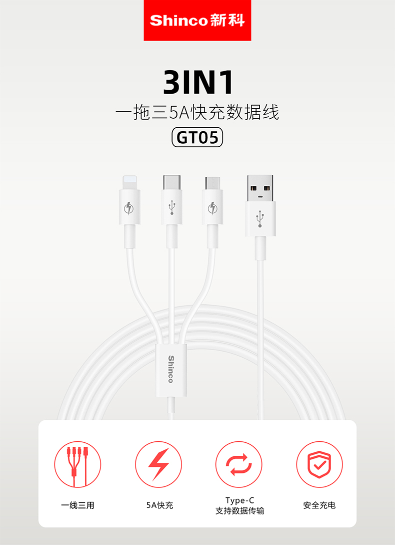 • Shinco新科一拖三5A快充数据线GT05