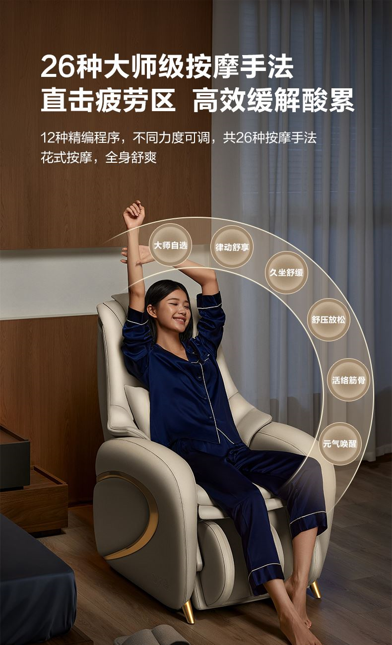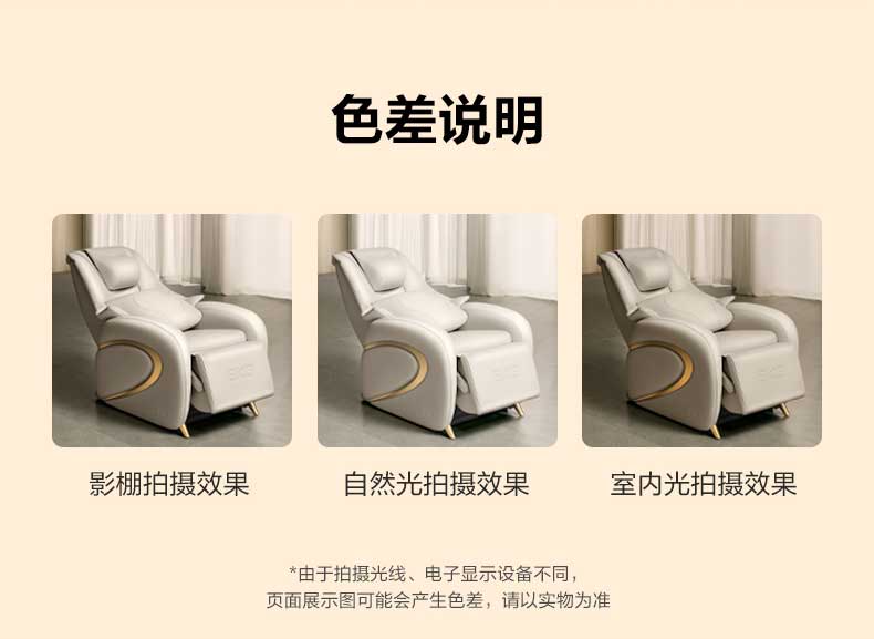 沙发按摩椅 安利5年皮革+接触面真牛皮 坐垫太空棉+扶手记忆棉 163º悬浮躺倒 人体工学导轨游走揉捏 4D柔感按摩 智能形态探测传感-自适应 26种按摩手法 科学承托 腰部双侧热敷 耳部两侧高保真蓝牙音响 产品参数: 机身材质:安利5年皮革+接触面真牛皮+太空棉+记忆棉 电源电压:220V/80W 充电接口:插电用 控制方式:APP+遥控器+NFC 语音播报:有 电池容量:/ 按摩模式:26种 座宽:448mm 座深:485mm 坐高:476mm 单台毛重/净重:70/52.5kg 中箱尺寸:1618*845*670mm