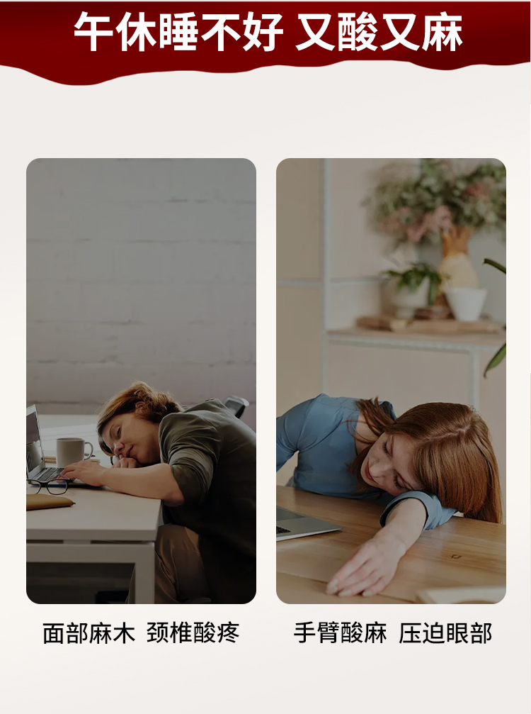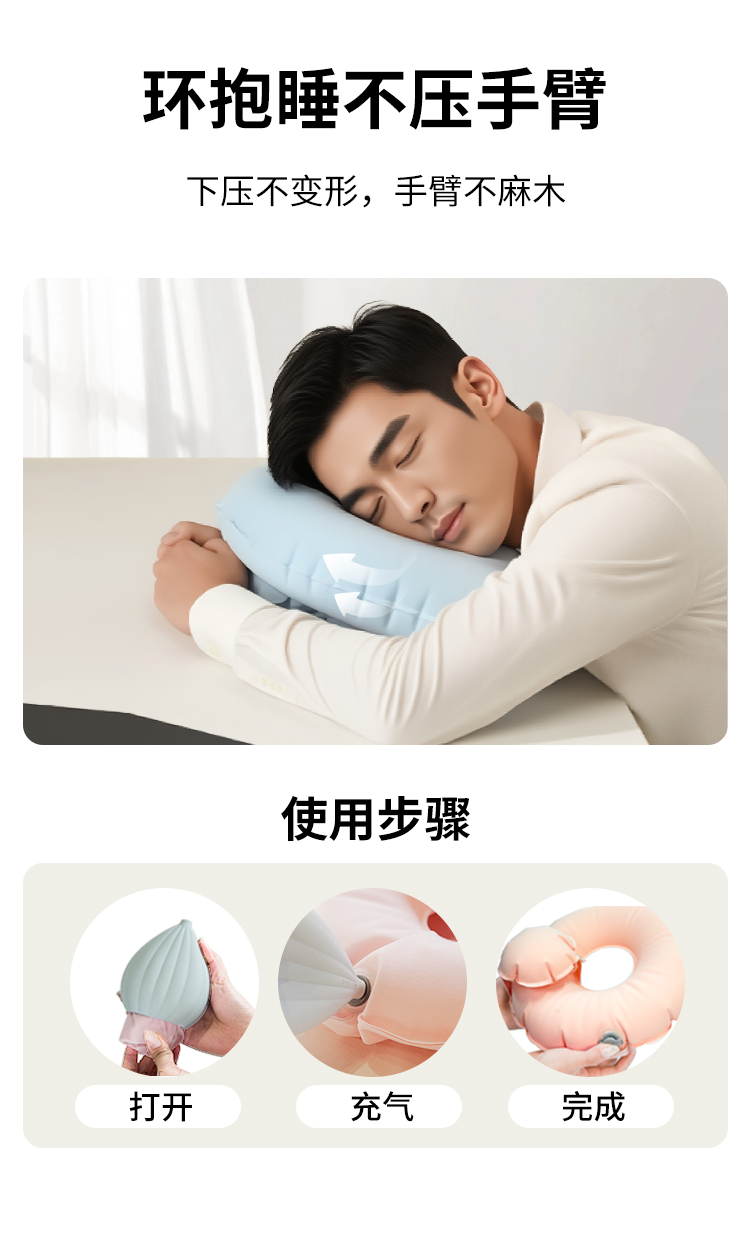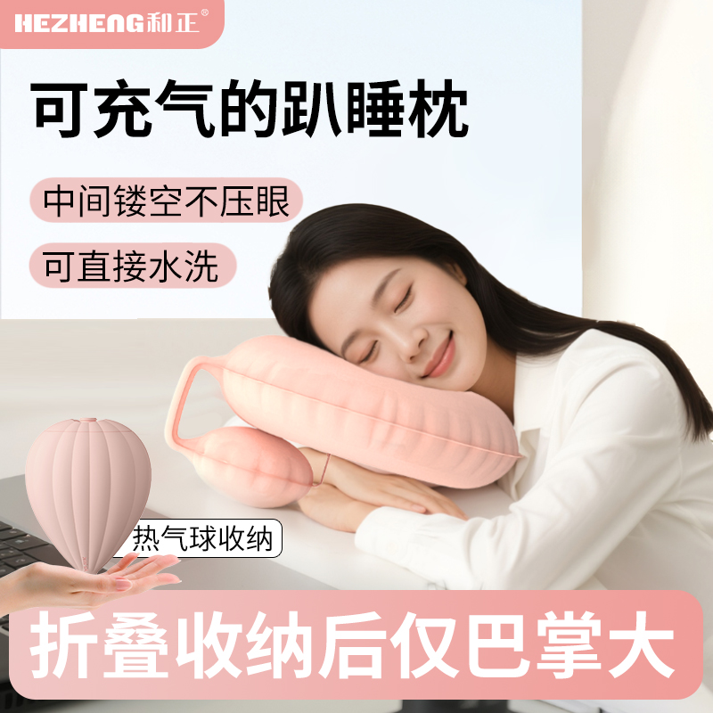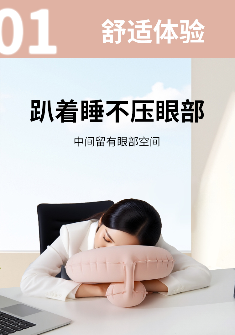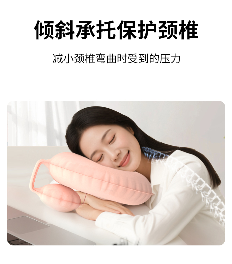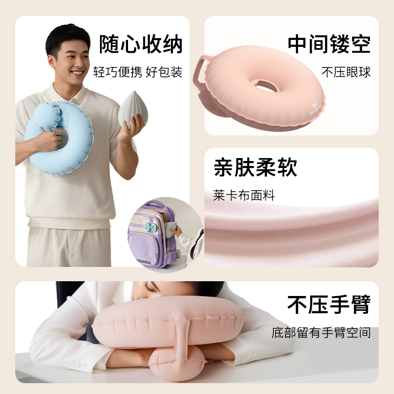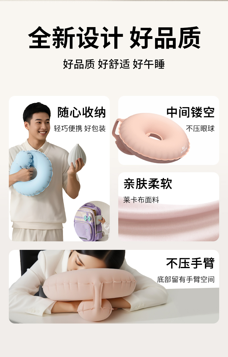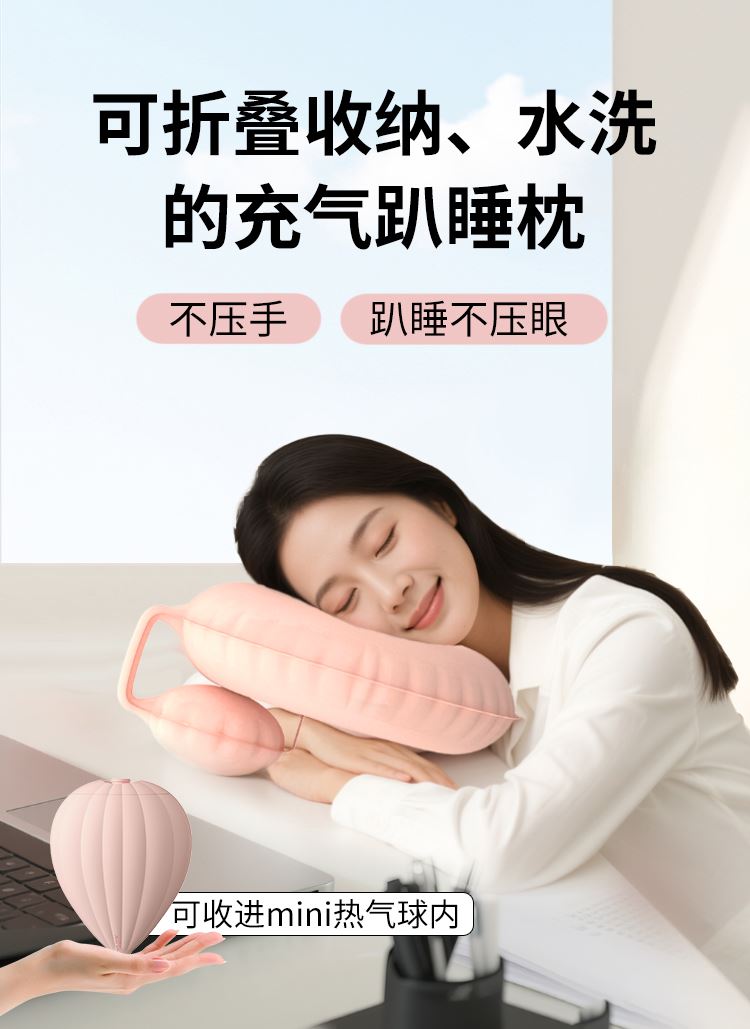 1、学生午睡专用枕,老师推荐,保护脊柱 ,舒适,轻巧,便携,不压手; 2 、超薄一片,折叠好收纳,热气球收纳盒,装口袋,装包里,去哪都方便; 3、中学生也可以使用,枕面适合,下压不变形; 4、亲肤柔软,清爽洁净,甜甜圈设计,新颖舒适; 5、中间镂空设计,不压眼球,保护好视力; 6、无拉链设计,避免划伤面部、手臂、眼睛。