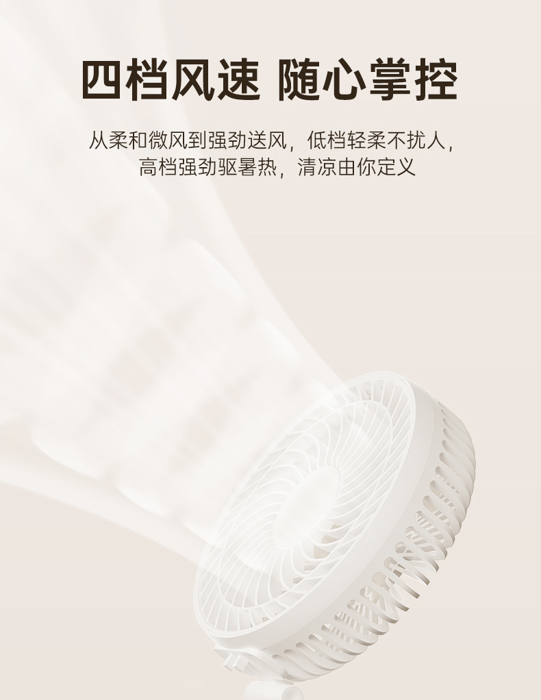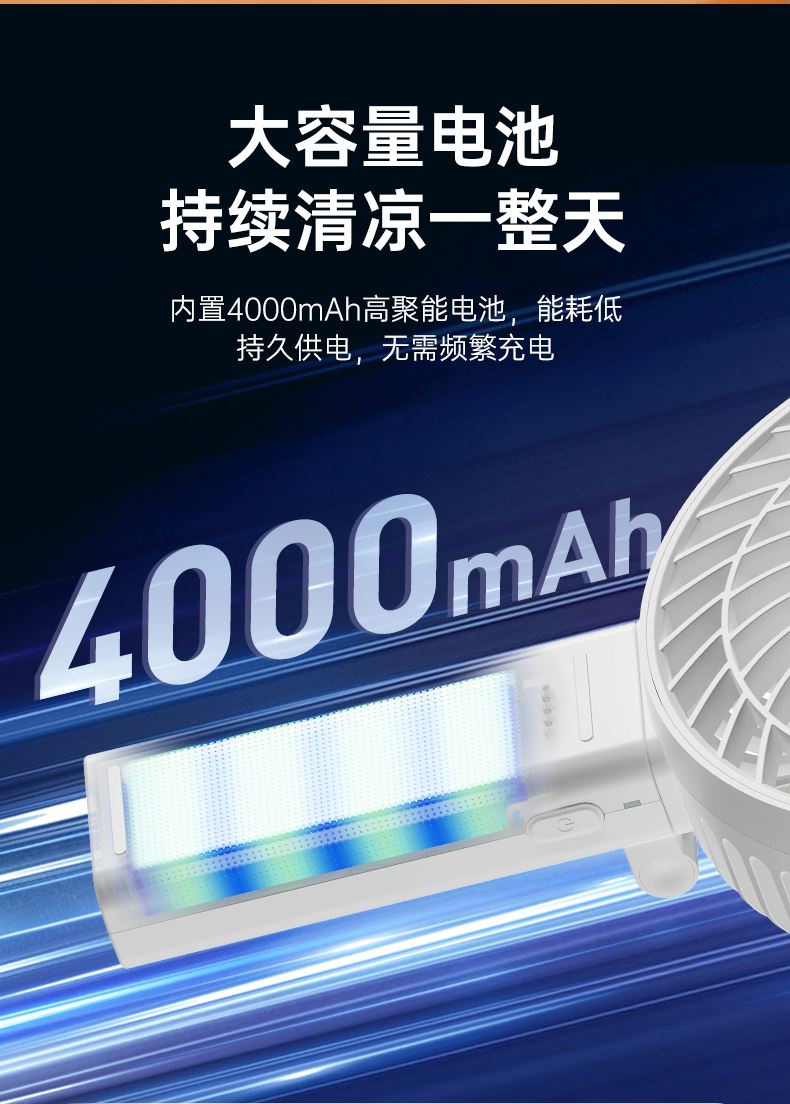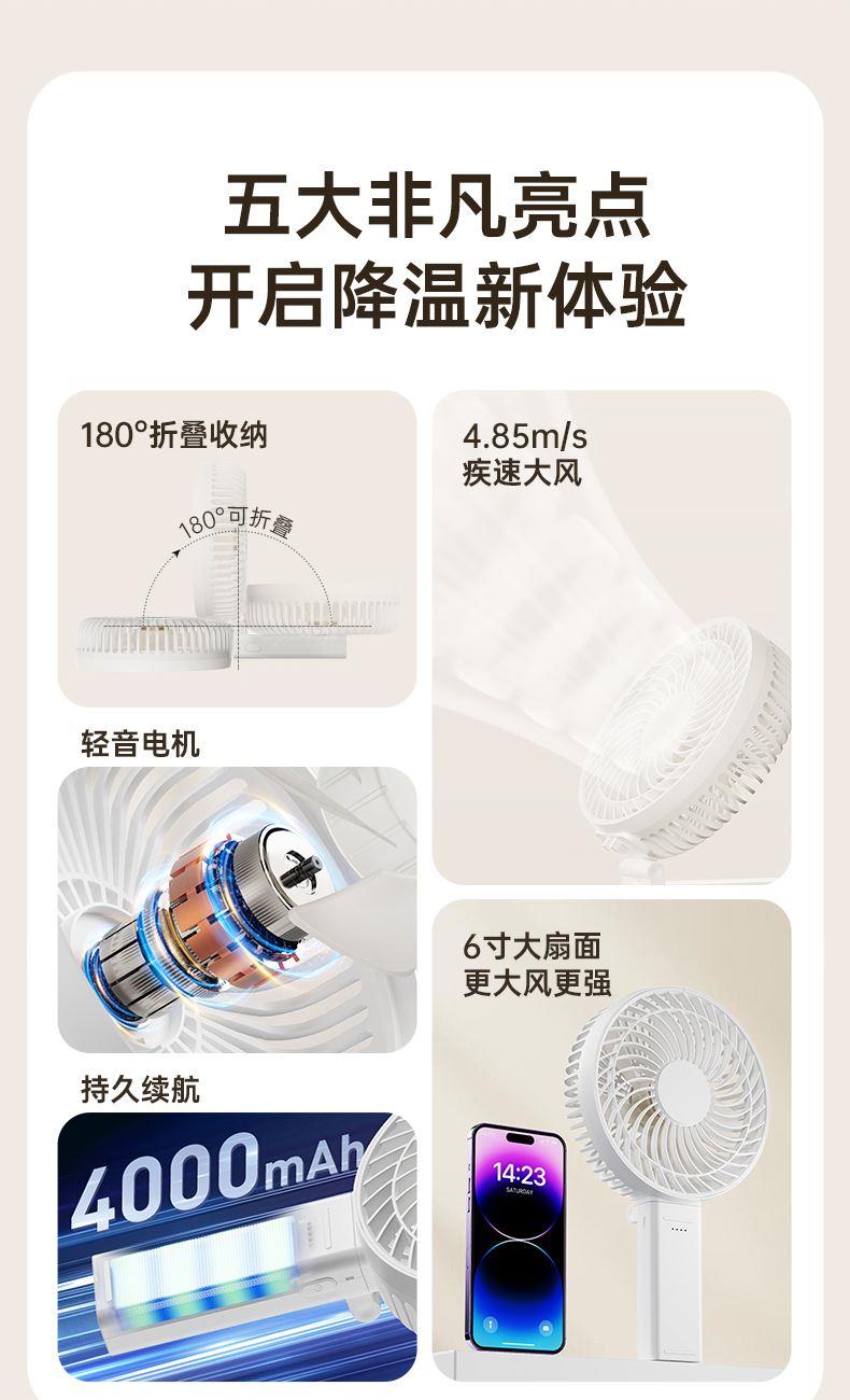 *6寸大扇面,吹风范围更广,风更大 *可180°折叠收纳,4档风速调节,4000mAh *多种模式,可桌面,手持,面罩可拆卸清洗 *颜色:白色/灰色 *材质:ABS *产品尺寸:164*50.5*280mm *彩盒尺寸:183*87*203mm *外箱尺寸:54.7*38*42.5 cm *单个净重/毛重:372g / 520.8g *整箱净重/毛重:12.5kg / 13.3kg *电池容量:4000mAh