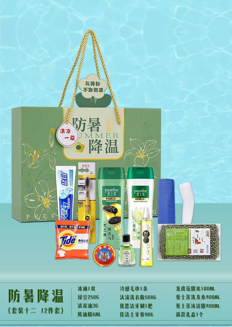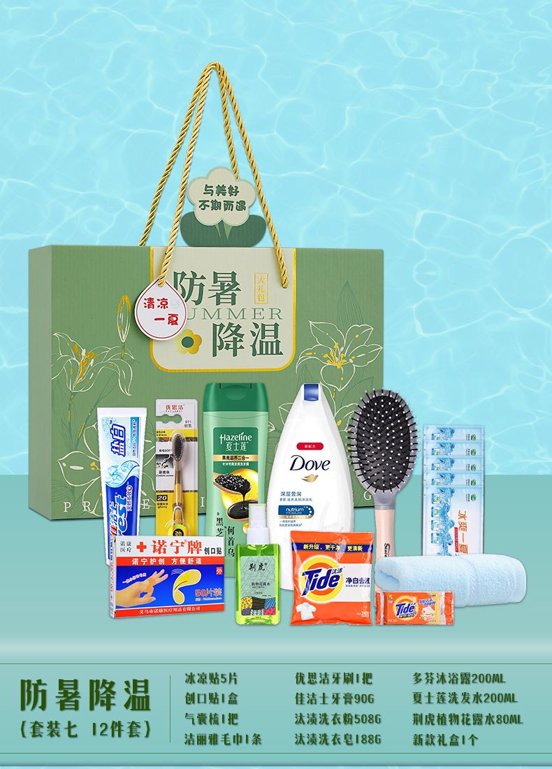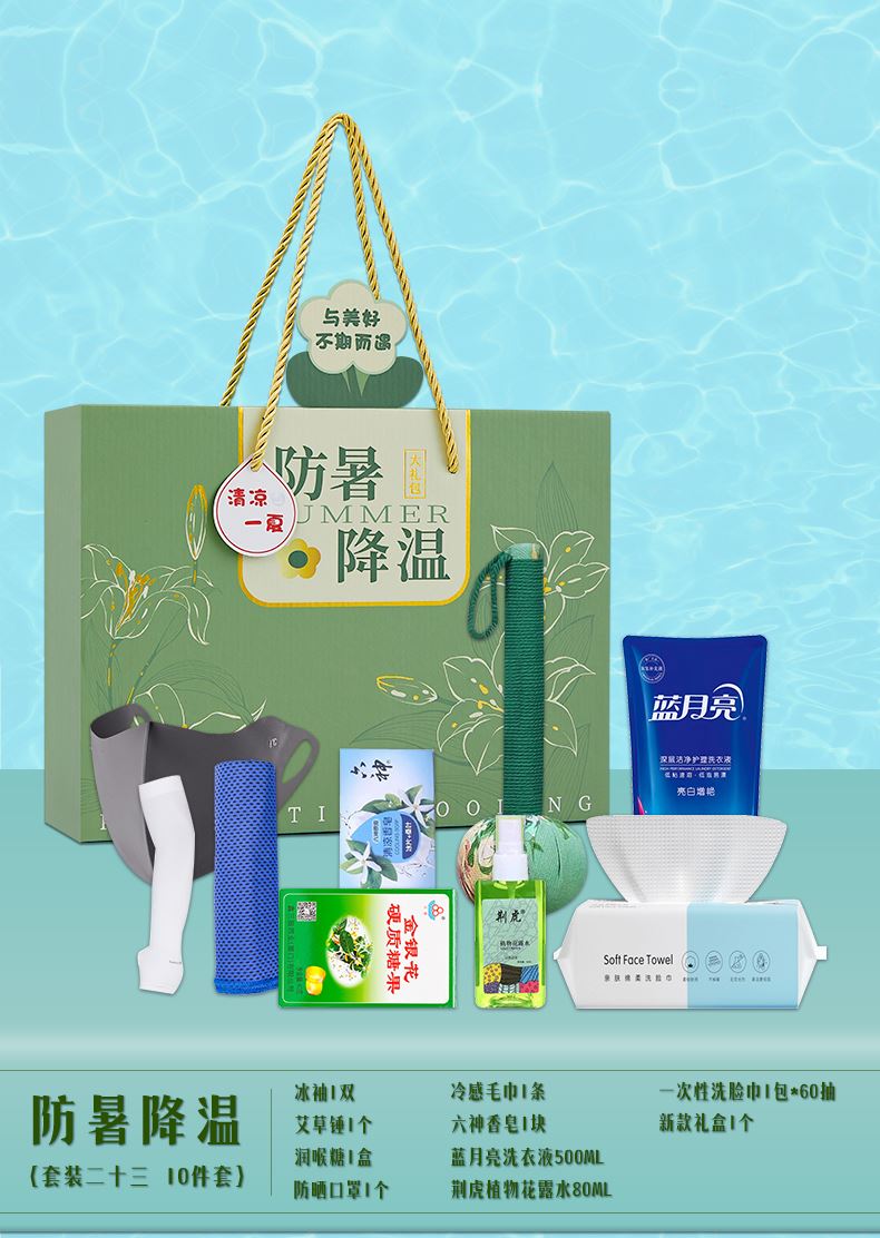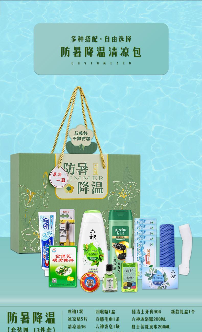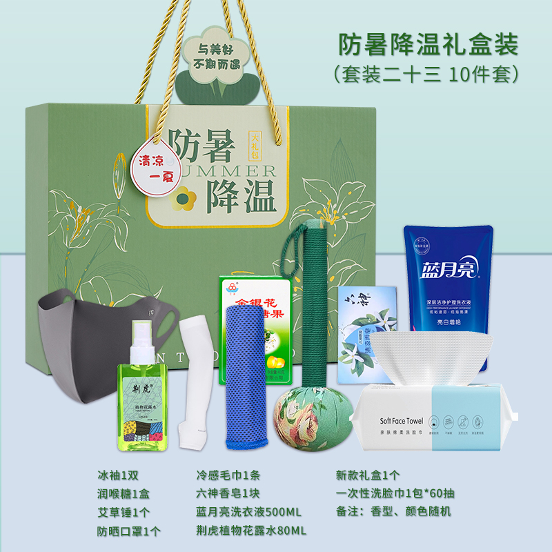1.注:商城报价对应首张主图款式! 其他套装参考细节图,费用另计! 2. 咨询下单请备注好产品信息! 3.首图款式产品明细:防暑降温礼盒装(套装二十 10件套):冰凉贴5片,绿豆250ML,冷感毛巾1条,新款礼盒1个,荆虎植物花露水80ML,清凉油3G,优思洁牙刷1把,润喉糖1盒,风油精6ML,佳洁士牙膏90G
