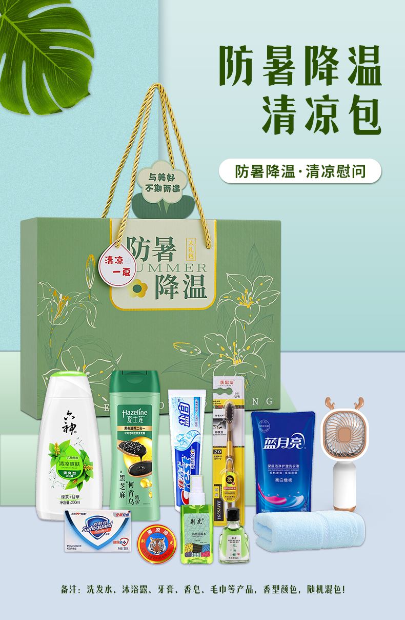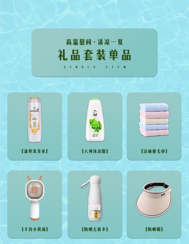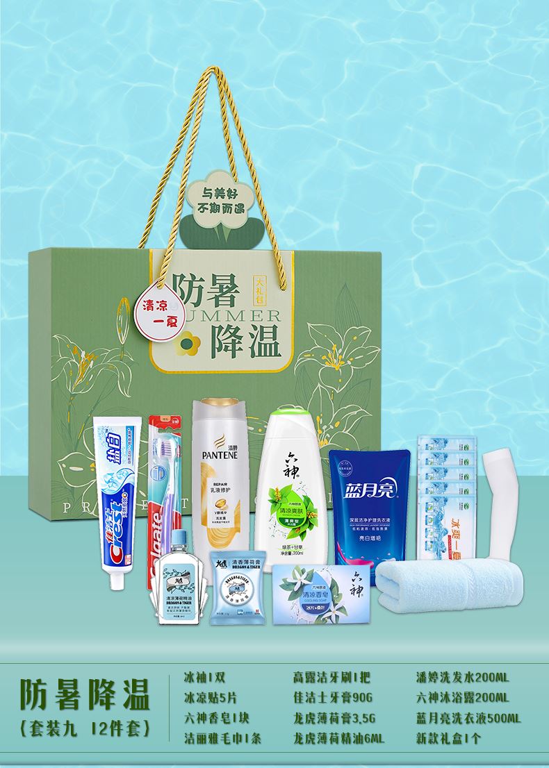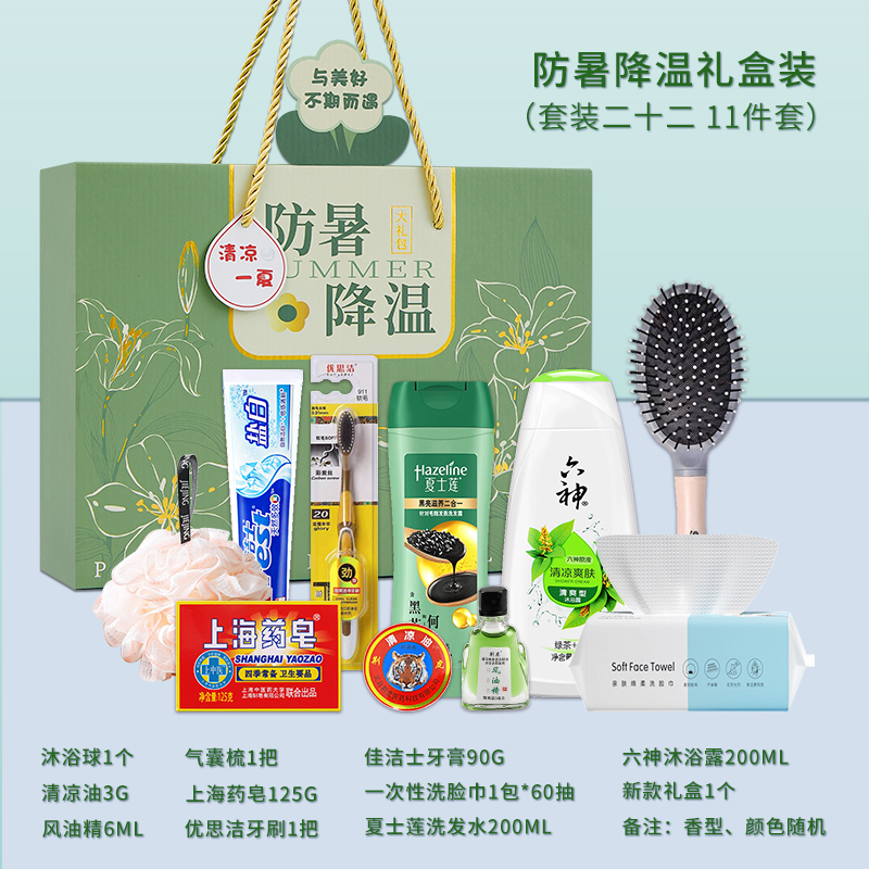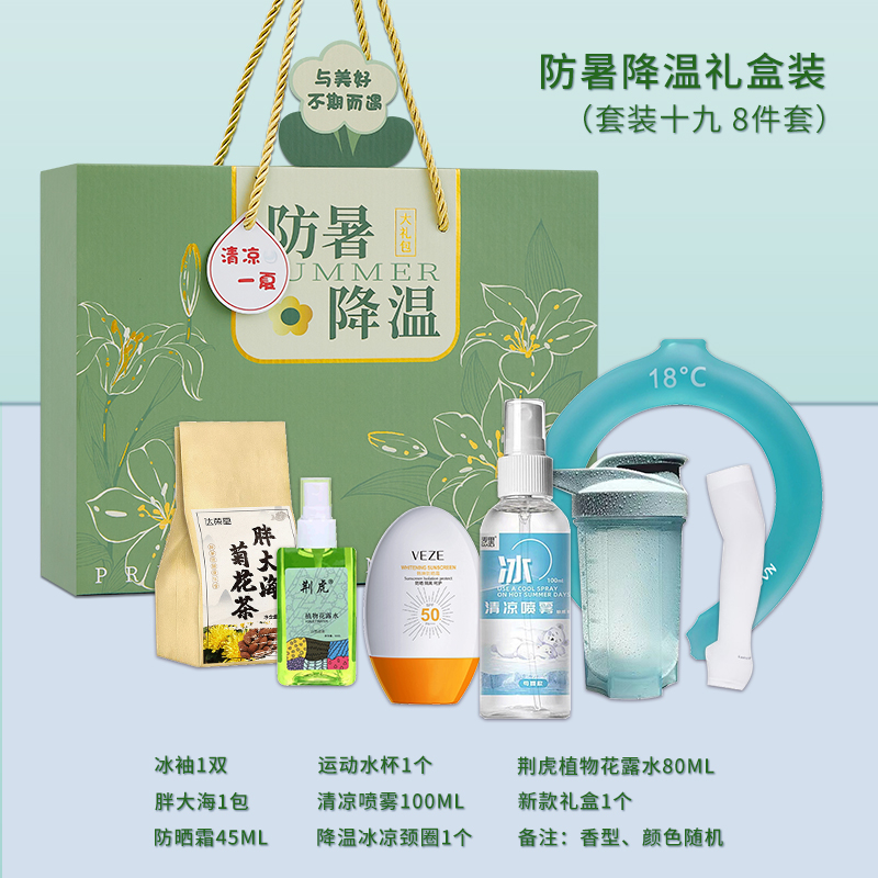 1.注:商城报价对应首张主图款式! 其他套装参考细节图,费用另计! 2. 咨询下单请备注好产品信息! 3.首图款式产品明细:防暑降温礼盒装(套装二十 10件套):冰凉贴5片,绿豆250ML,冷感毛巾1条,新款礼盒1个,荆虎植物花露水80ML,清凉油3G,优思洁牙刷1把,润喉糖1盒,风油精6ML,佳洁士牙膏90G