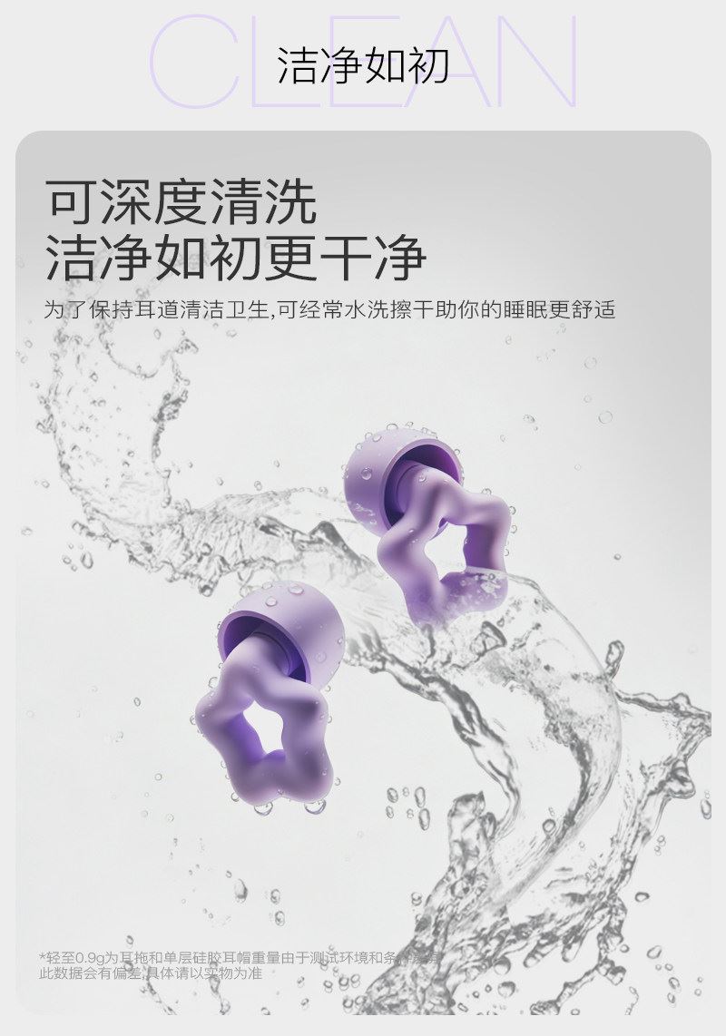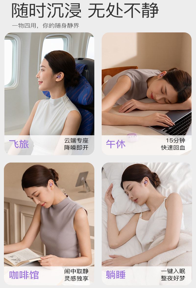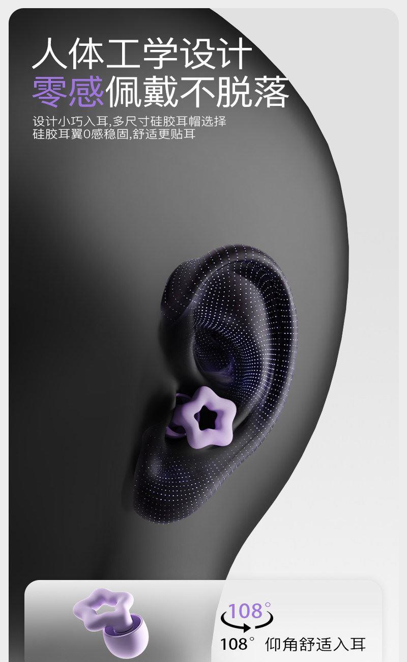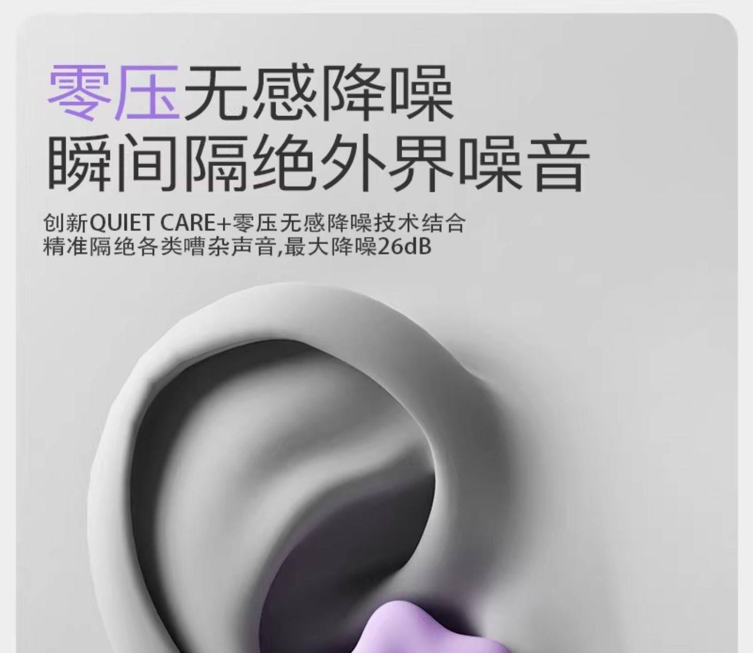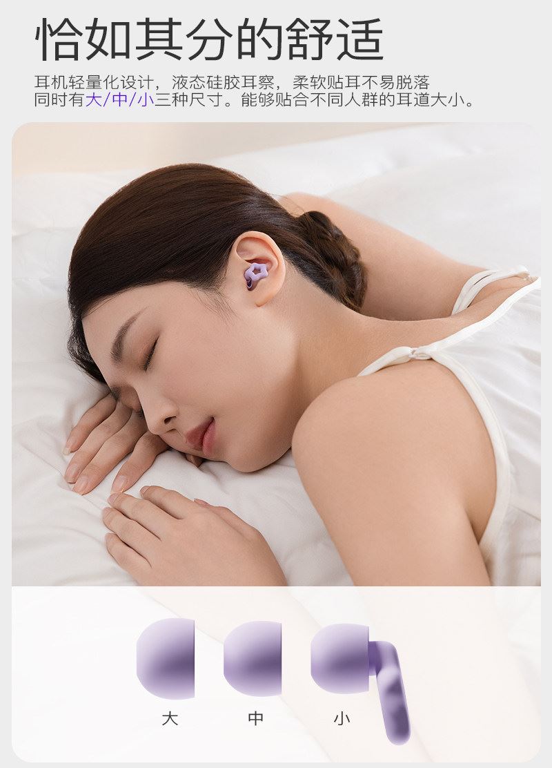 可选颜色: 星璇紫、暗夜黑、皎月白、樱花粉 功能特点: 无感佩戴,无惧侧躺,亲肤硅胶,柔软0压感 360°全场景降噪,消除噪音,自适应识别场景隔绝噪音 支持水洗,洁净如初 轻量化设计,兼顾舒适轻巧与降噪的平衡 单只耳塞轻至0.9g,轻盈无负担 隔绝各类嘈杂声音,大降噪26dB 久戴不涨耳,深睡到天亮 人体工学设计,零感佩戴,柔软贴耳不易脱落 同色小巧精致收纳盒,出门随身携带