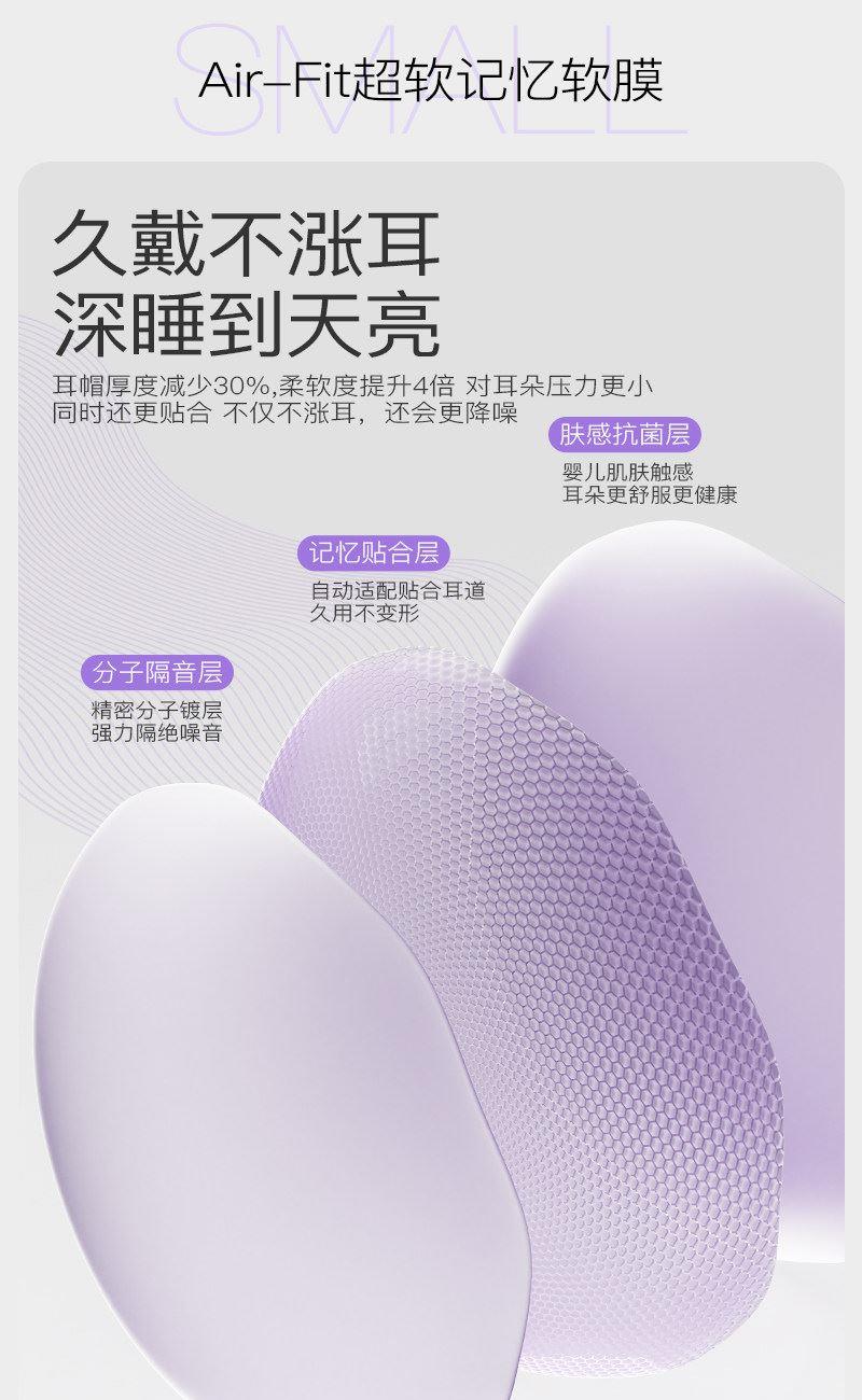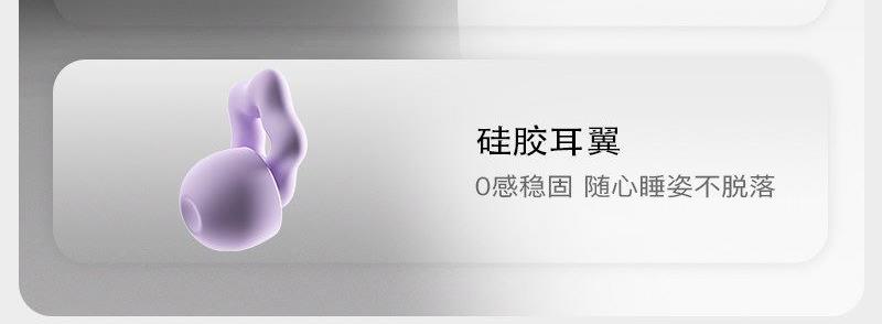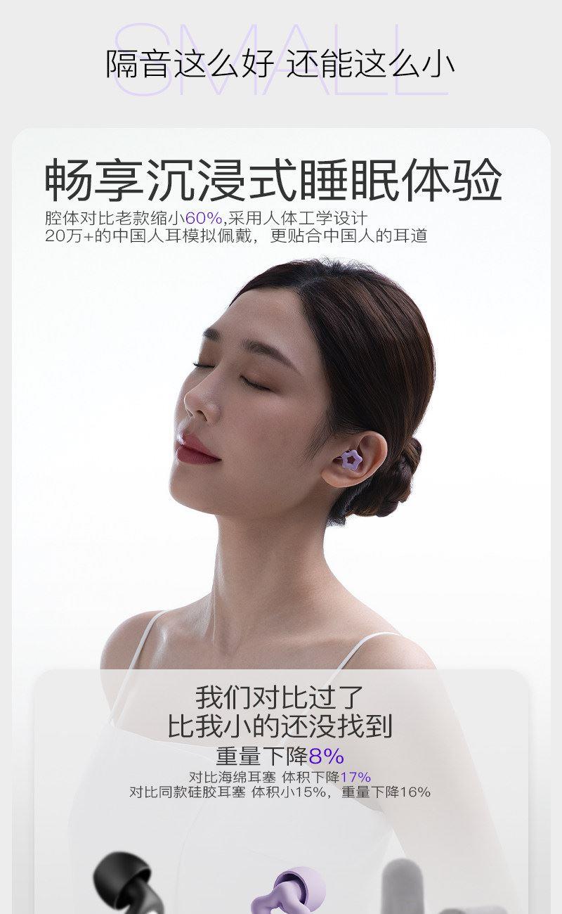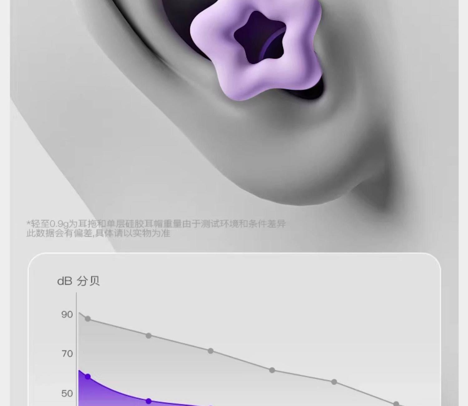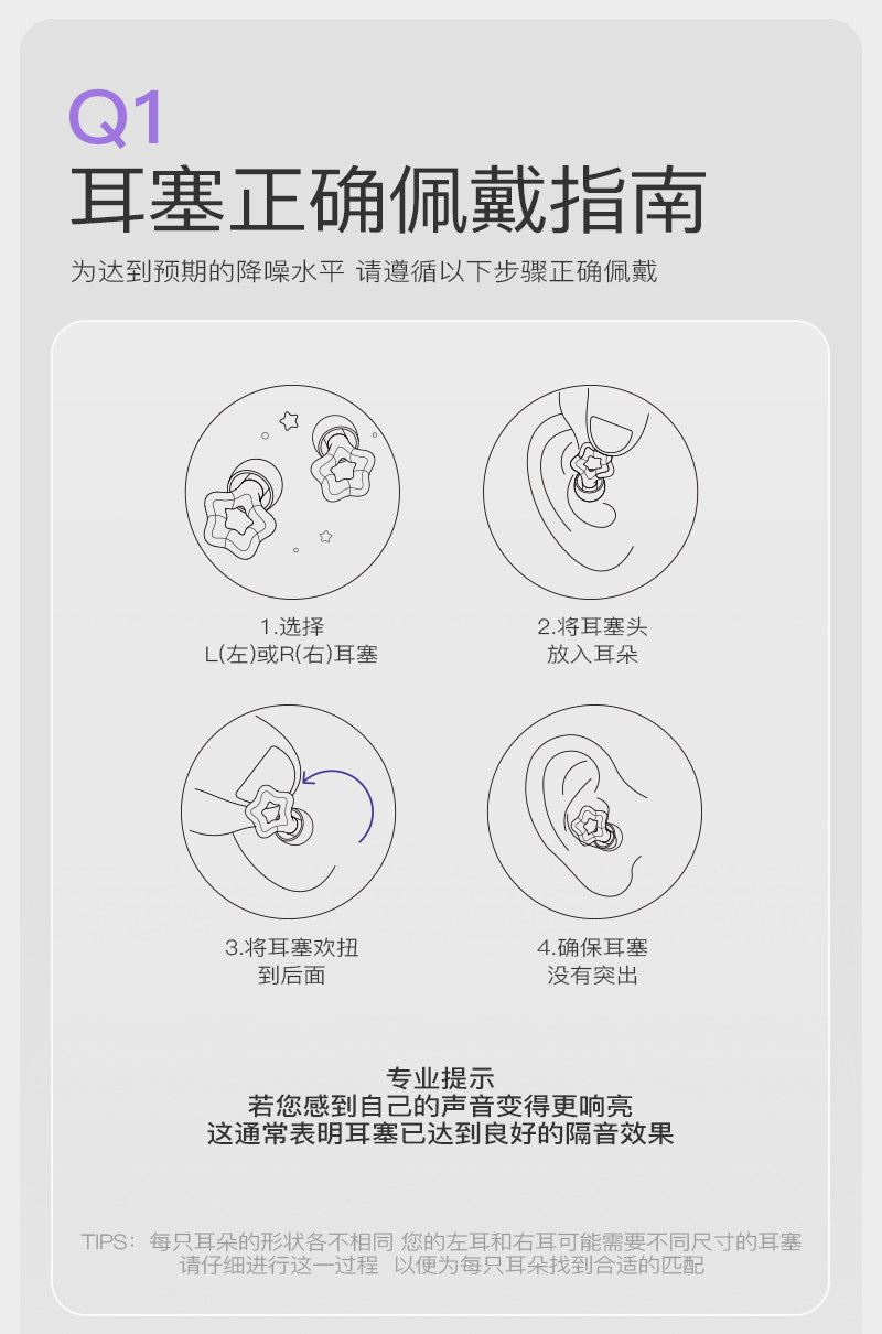 可选颜色: 星璇紫、暗夜黑、皎月白、樱花粉 功能特点: 无感佩戴,无惧侧躺,亲肤硅胶,柔软0压感 360°全场景降噪,消除噪音,自适应识别场景隔绝噪音 支持水洗,洁净如初 轻量化设计,兼顾舒适轻巧与降噪的平衡 单只耳塞轻至0.9g,轻盈无负担 隔绝各类嘈杂声音,大降噪26dB 久戴不涨耳,深睡到天亮 人体工学设计,零感佩戴,柔软贴耳不易脱落 同色小巧精致收纳盒,出门随身携带