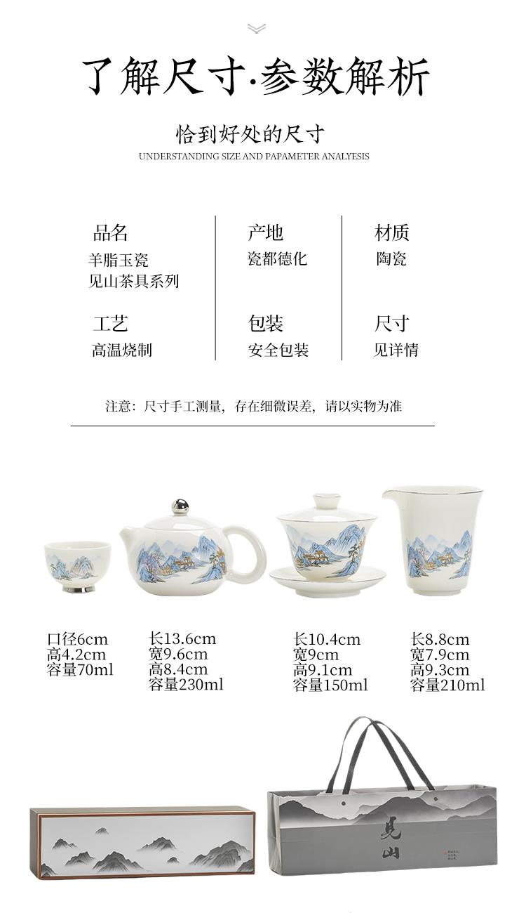 配置:品茗杯*4 陶瓷公道杯*1 盖碗*1 礼盒*1 腰封*1 材质:羊脂玉 礼盒尺寸:宽12.1cm/高12.6cm/长42cm 产品容量:盖碗:145ml 品茗杯:60ml 公道杯:230ml