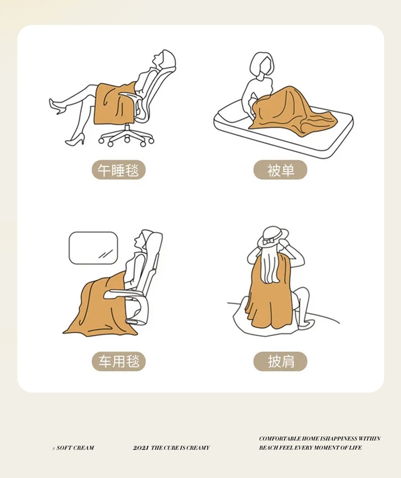 规格:110*130cm 面料:聚酯纤维 重量:1200g 执行标准:GB/T22843-2009 安全类别:GB18401-2010 B类 1.触感顺滑柔软,吸湿透气,贴身舒适不闷汗。面料紧实耐磨,不易起球、不易褪色、不易变形,居家午休、沙发休闲、空调房盖毯都适用,好洗快干,实用耐造。 2.软糯亲肤,垂感好,轻盈不压身。简约百搭,提升居家质感,四季皆宜,省心好打理。