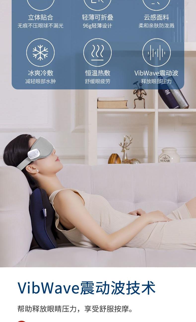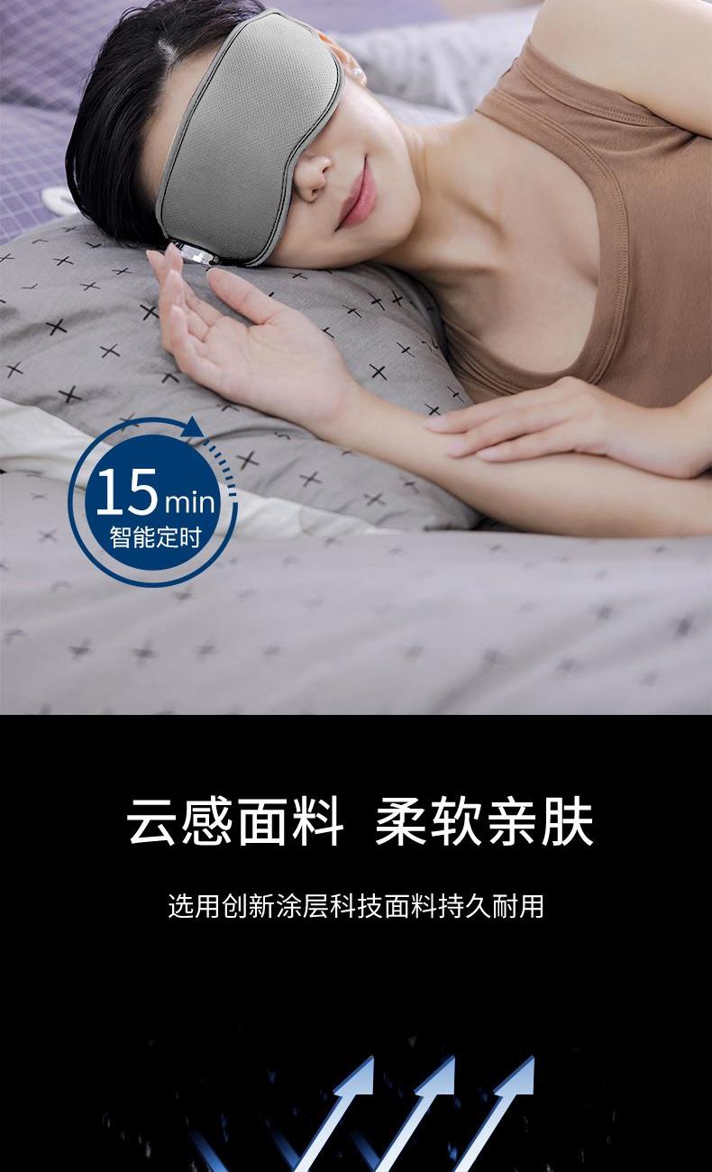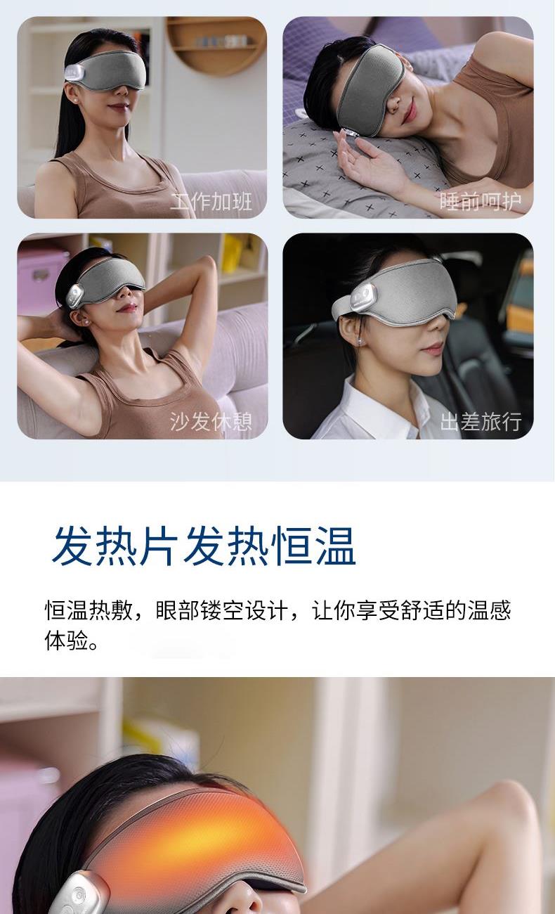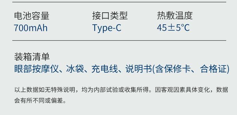 型号 MR7067 产地 浙江温州 净重 51.4g 毛重 450g 包装尺寸 30X12.2X8cm 大箱尺寸 62.6x31.7x22cm 续航:≈180min 充电时间:1小时±0.5小时 充电电压:5V1A 额定功率:3w 工作电压:5V 充电接口:Type-C 电池容量:700毫安 执行标准:GB4706.1-2005/GB4706.10-2008 配件 眼罩主机,冰敷袋,充电线,说明书 卖点: 轻薄设计,180℃可折叠收纳携带 亲肤面料,柔和透气,久戴舒适 3D弧形设计,无痕贴合,不压眼球不漏光 震动按摩,轻柔舒缓眼周,缓解疲劳 温感热敷模式,温热渗透,放松舒缓 冰霜冷敷模式,冷感按摩,减轻疲劳肿胀感