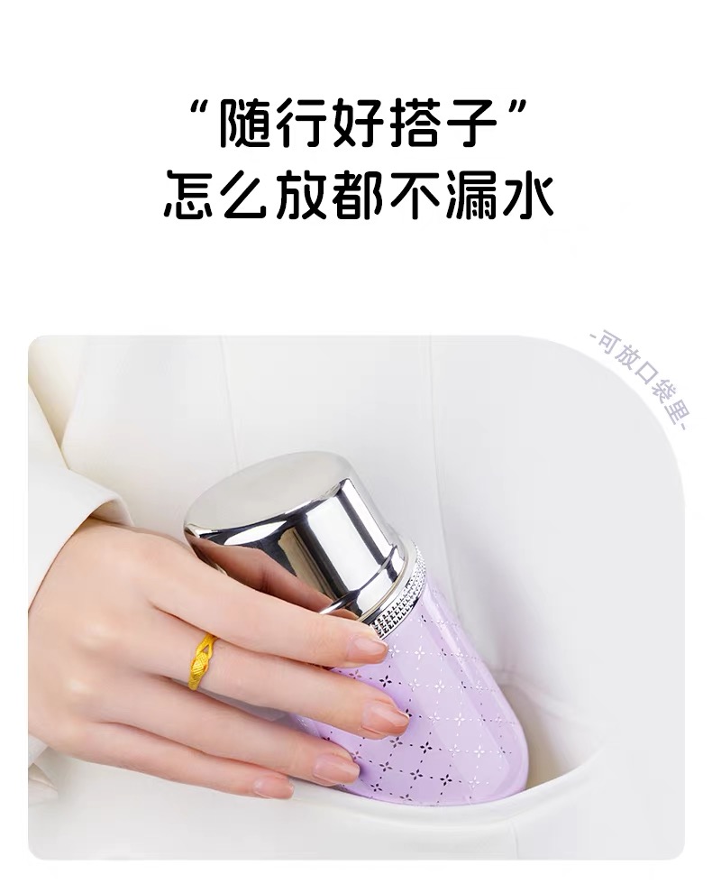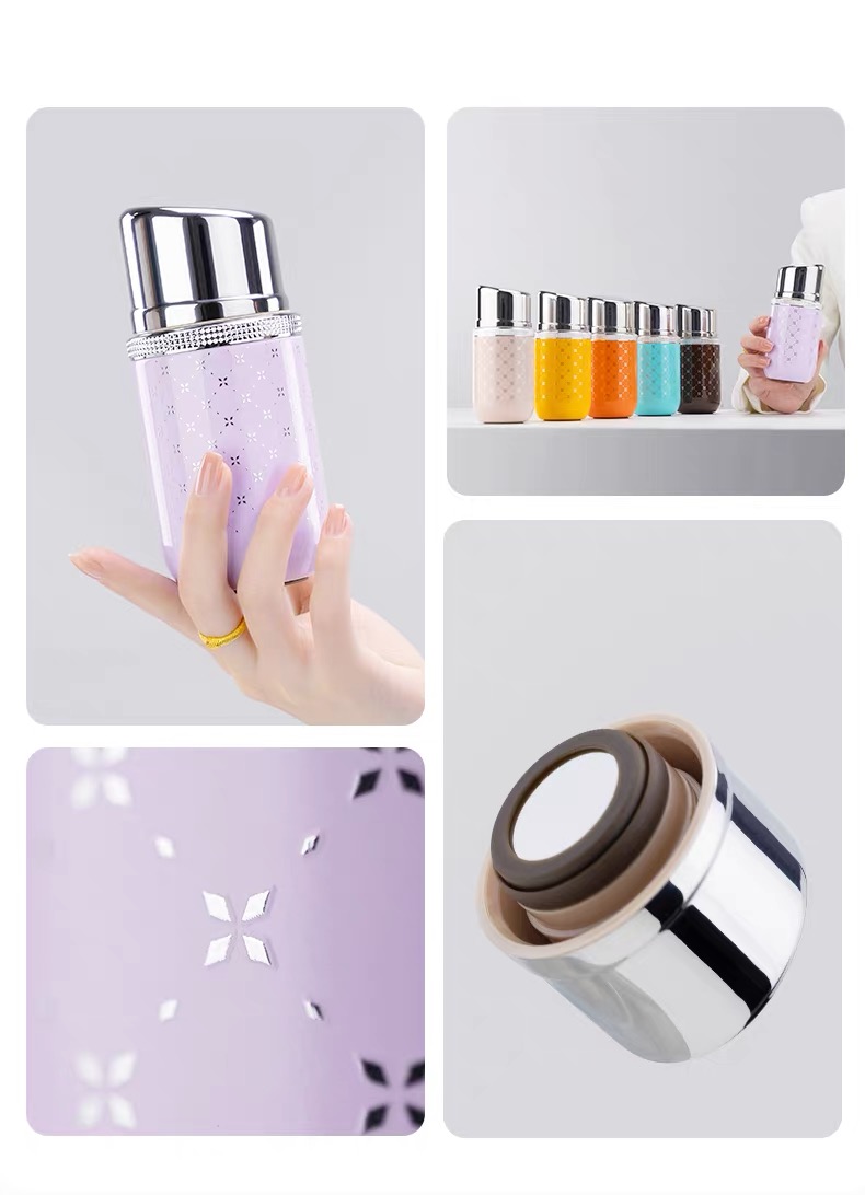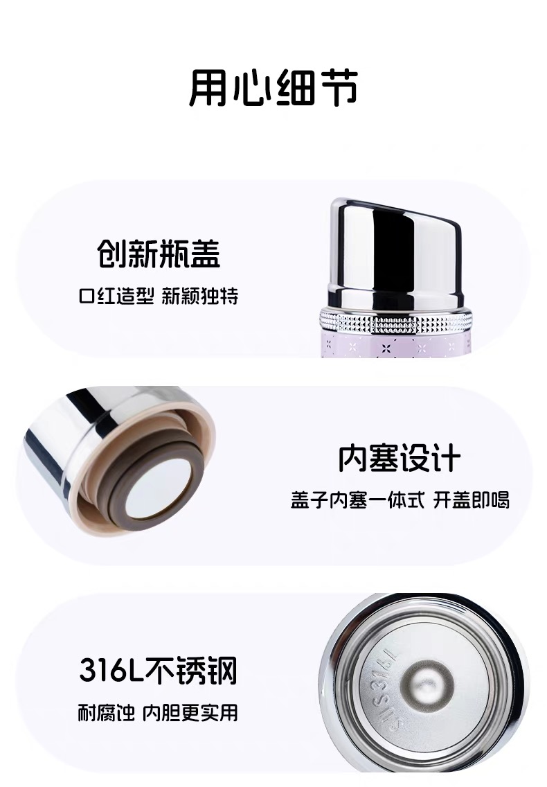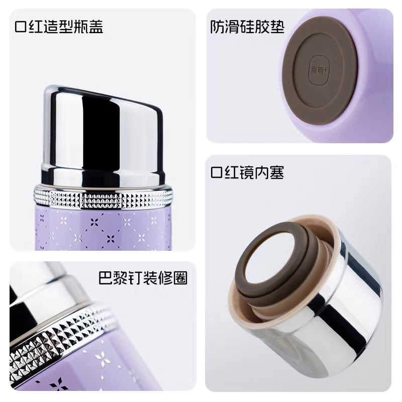 女神zui爱! 时尚口红造型,巴黎钉装饰圈, 内置口红境:内置不锈钢镜,口红随shi补 六色可选,随心搭配 容量160mL,轻量小体积, 轻巧便携, 316L不锈钢内胆,耐腐蚀更耐用, 五层锁温,保温保冷, 防滑硅胶垫, 精美彩盒包装,送人自用皆宜。