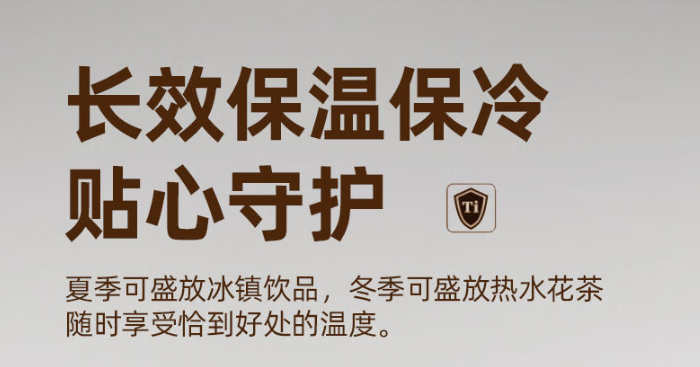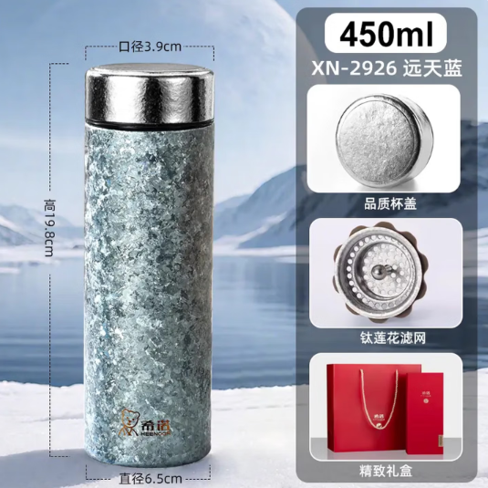 产品规格: 容量:XN-T2926/450ml 规格:XN-T2926/19.8*6.5*口径3.9cm 颜色:银月白、远天蓝、云海雾凇 杯体:TA1纯钛 杯盖:TA1纯钛+PP 滤网:TA1+硅橡胶 产品卖点: 1.方便携带,轻巧材质,随行随饮 2.纯钛杯身,y菌耐酸碱 3.夏季可盛放冰镇饮品,冬季可盛放热水花茶享受恰到好处的温度。 4.纯钛内胆具有保鲜效果,使用过程中无重金属析出,且不产生任何异味