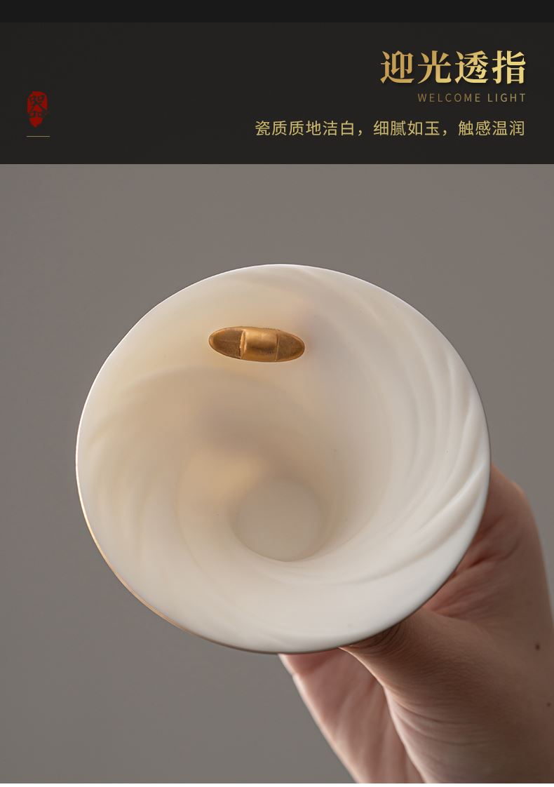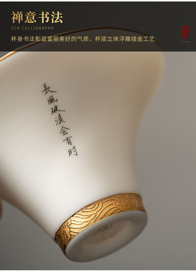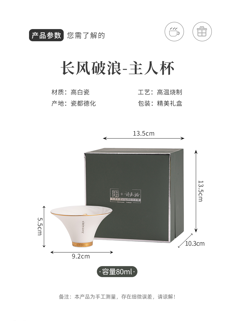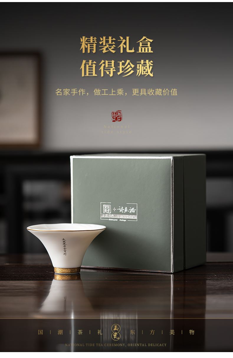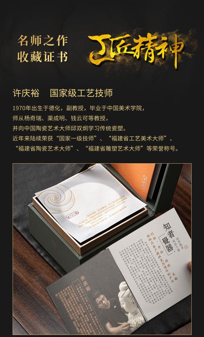 《大师汇-许庆裕大师“长风破浪”杯》 许庆裕-大师介绍:1970年出生于德化,副教授,毕业于中国美术学院,师从杨奇瑞、渠成明、钱云可等教授。并向中国陶瓷艺术大师邱双炯学习传统雕塑。作品注重文化内涵吸取德化民间传统瓷塑精华融入现代艺术元素,推陈出新、精益求精,达到传统与现代实用与审美、物质与精神、技能与创造的精湛统一。 ★guojia一级技师 ★福建省工艺美术大师 ★福建省陶瓷艺术大师 ★福建省雕塑艺术大师 材质:羊脂玉瓷素烧 单杯尺寸:7.5cm*4.6cm 礼盒尺寸:13.6cm*13.6cm*10.6cm 手提袋尺寸:14.5*15.5*11.6cm