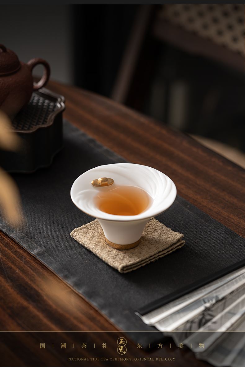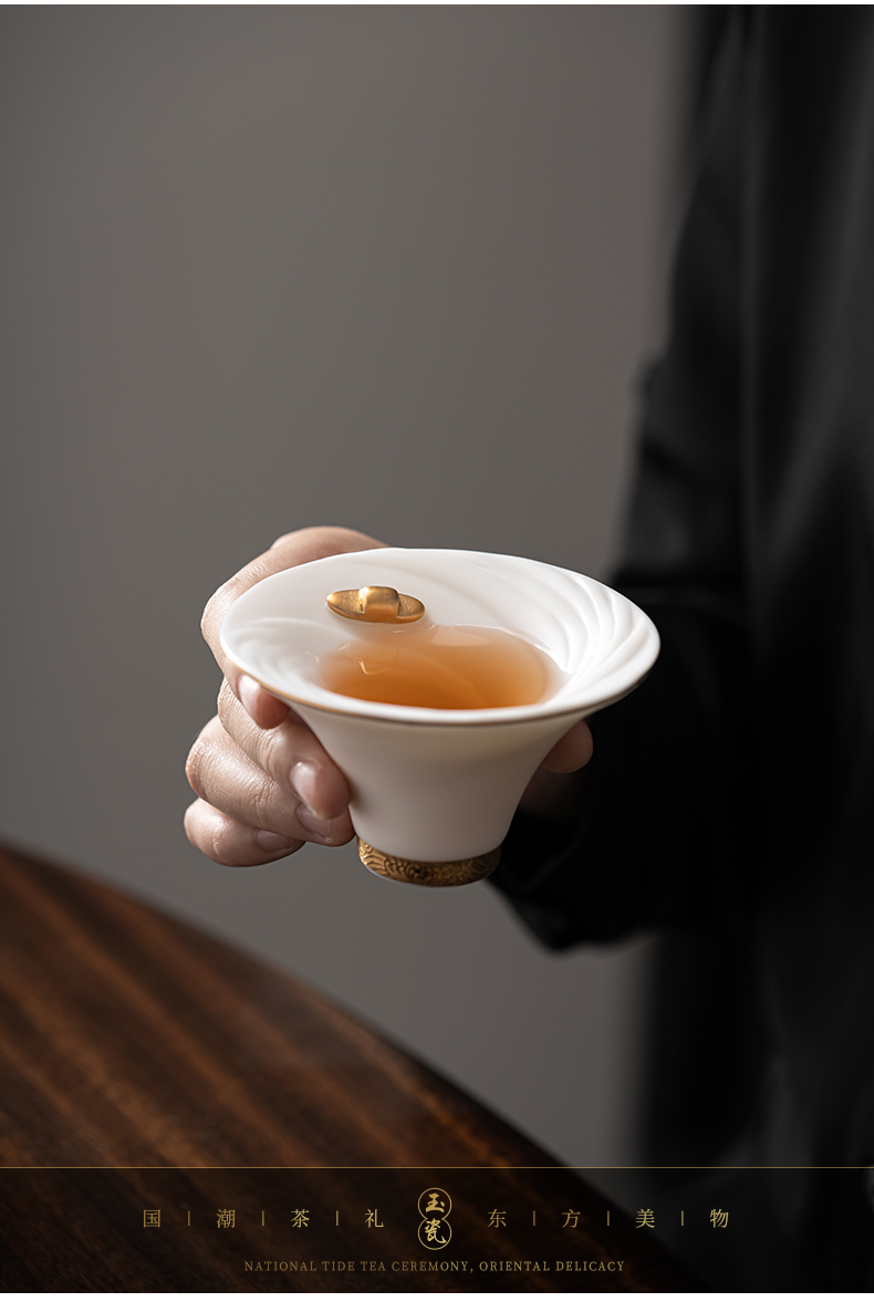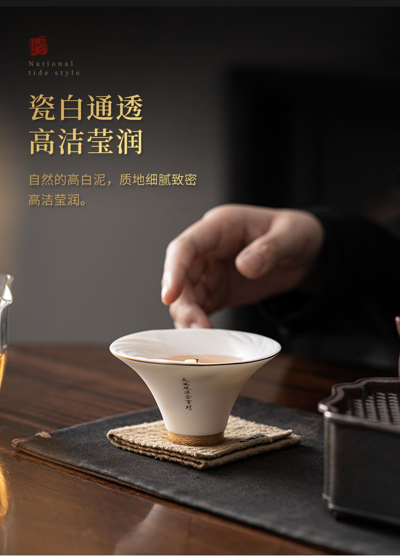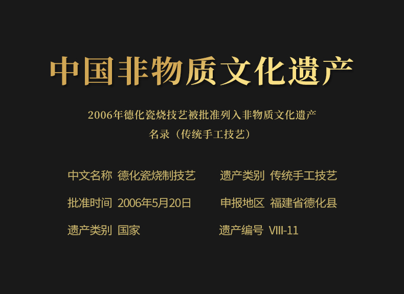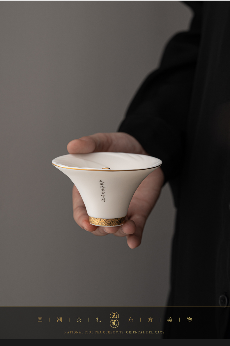 《大师汇-许庆裕大师“长风破浪”杯》 许庆裕-大师介绍:1970年出生于德化,副教授,毕业于中国美术学院,师从杨奇瑞、渠成明、钱云可等教授。并向中国陶瓷艺术大师邱双炯学习传统雕塑。作品注重文化内涵吸取德化民间传统瓷塑精华融入现代艺术元素,推陈出新、精益求精,达到传统与现代实用与审美、物质与精神、技能与创造的精湛统一。 ★guojia一级技师 ★福建省工艺美术大师 ★福建省陶瓷艺术大师 ★福建省雕塑艺术大师 材质:羊脂玉瓷素烧 单杯尺寸:7.5cm*4.6cm 礼盒尺寸:13.6cm*13.6cm*10.6cm 手提袋尺寸:14.5*15.5*11.6cm