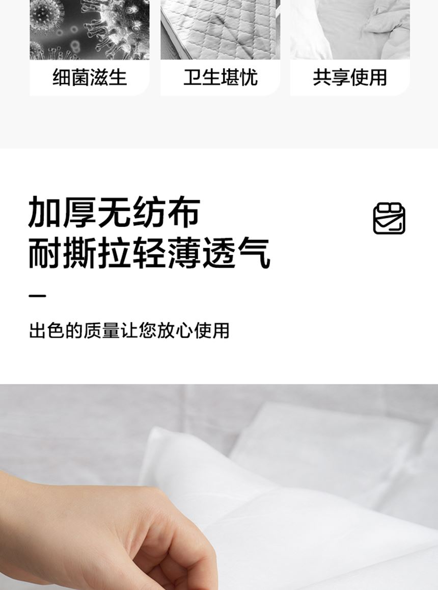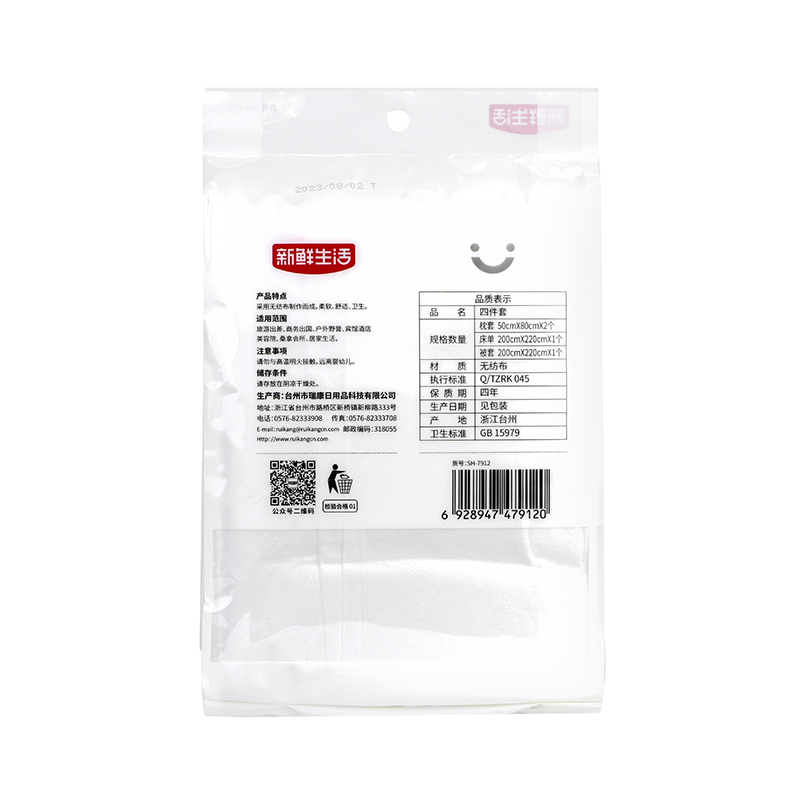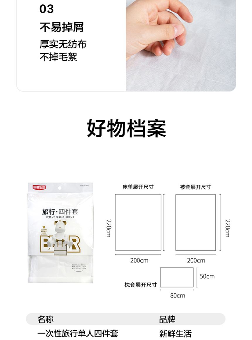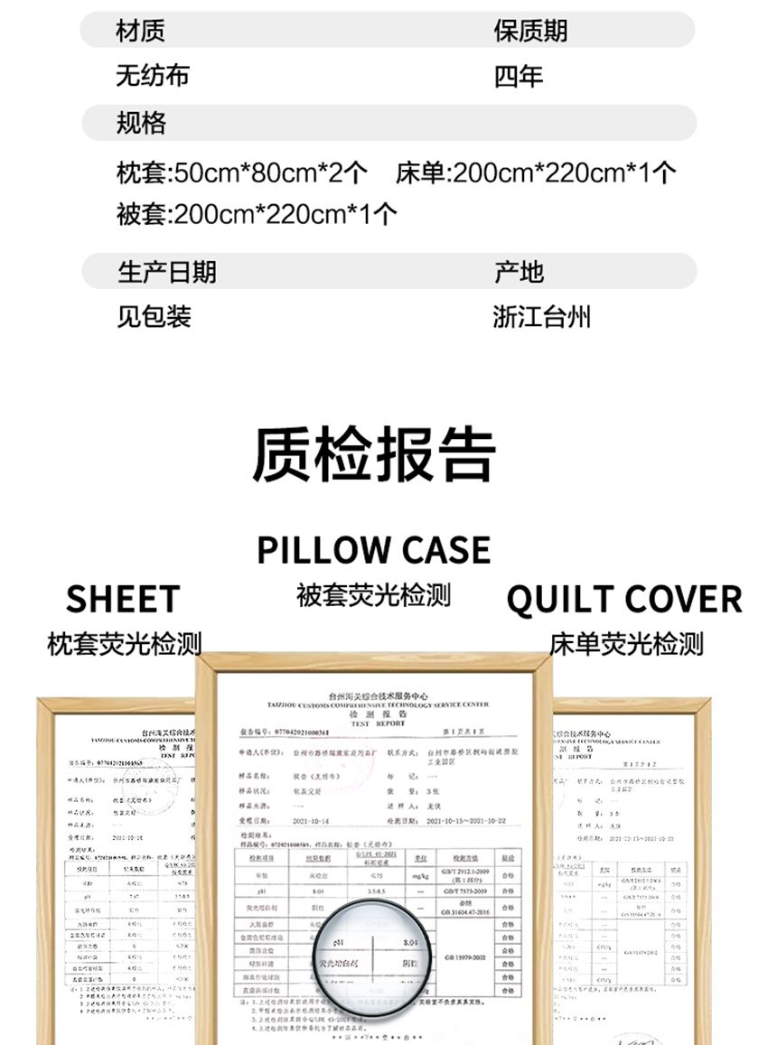 执行标准:Q/TZRK 045 规格:枕套:50cm*80cm*2个 床单:200cm*220cm*1个 被套:200cm*220cm*1个 材质:无纺布
