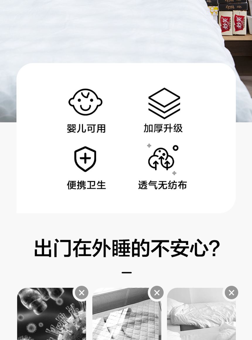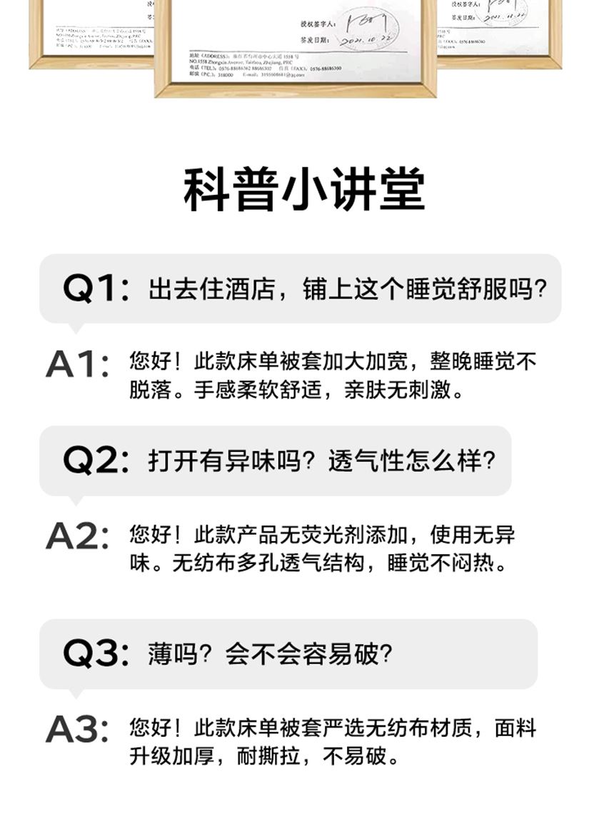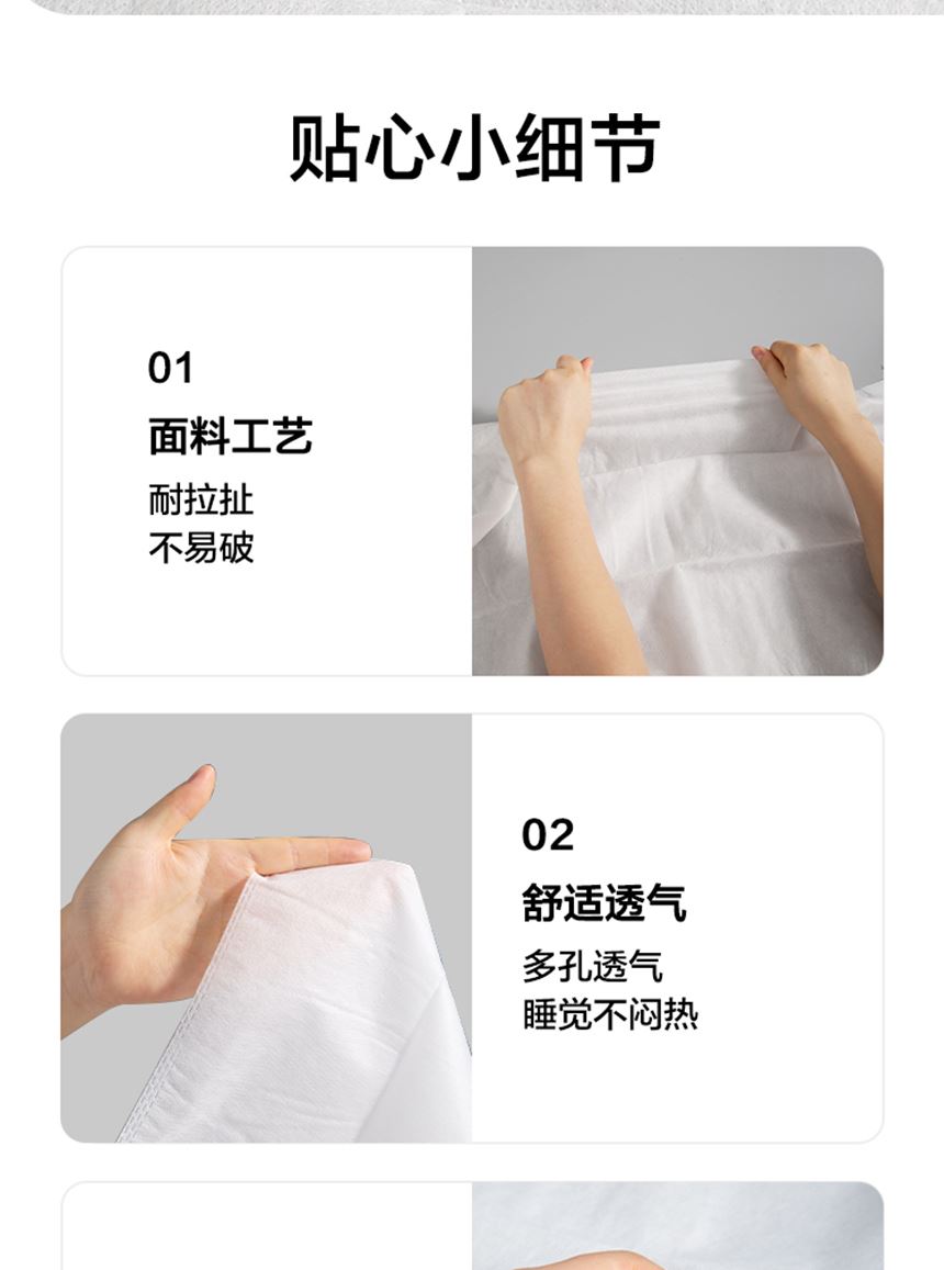 执行标准:Q/TZRK 045 规格:枕套:50cm*80cm*2个 床单:200cm*220cm*1个 被套:200cm*220cm*1个 材质:无纺布