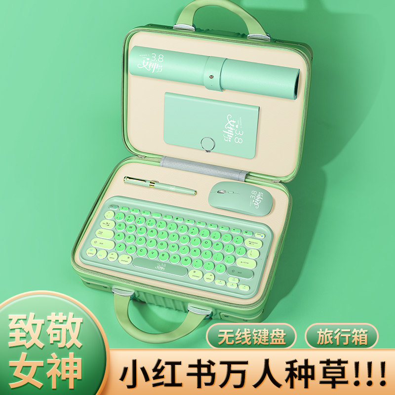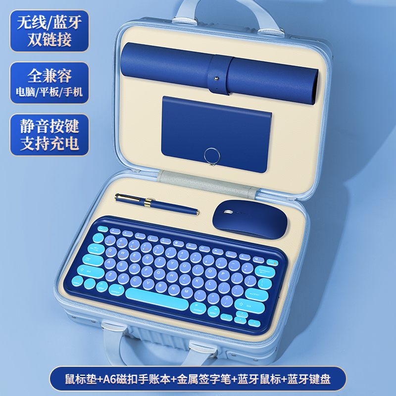 【产品配置】旅行箱5件套S5键盘+本+笔+鼠标+鼠标垫 【产品型号】LXX-01 【产品颜色】樱花粉,薄荷绿,宝石蓝 【定制工艺】印刷、雕刻 【包装尺寸】32*23.5*16cm