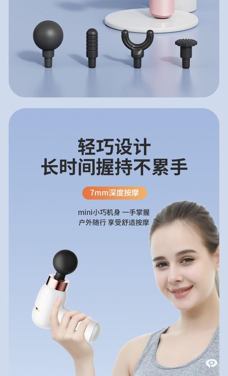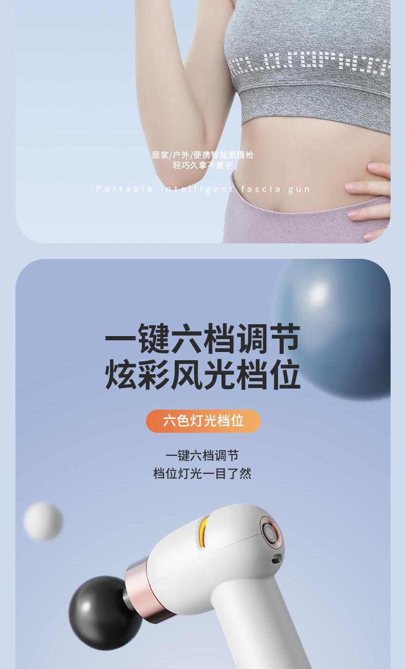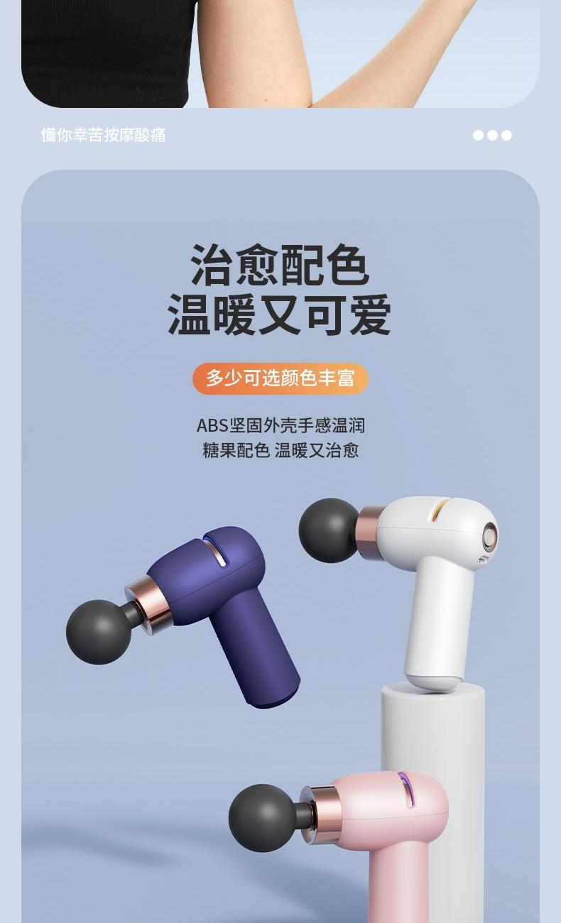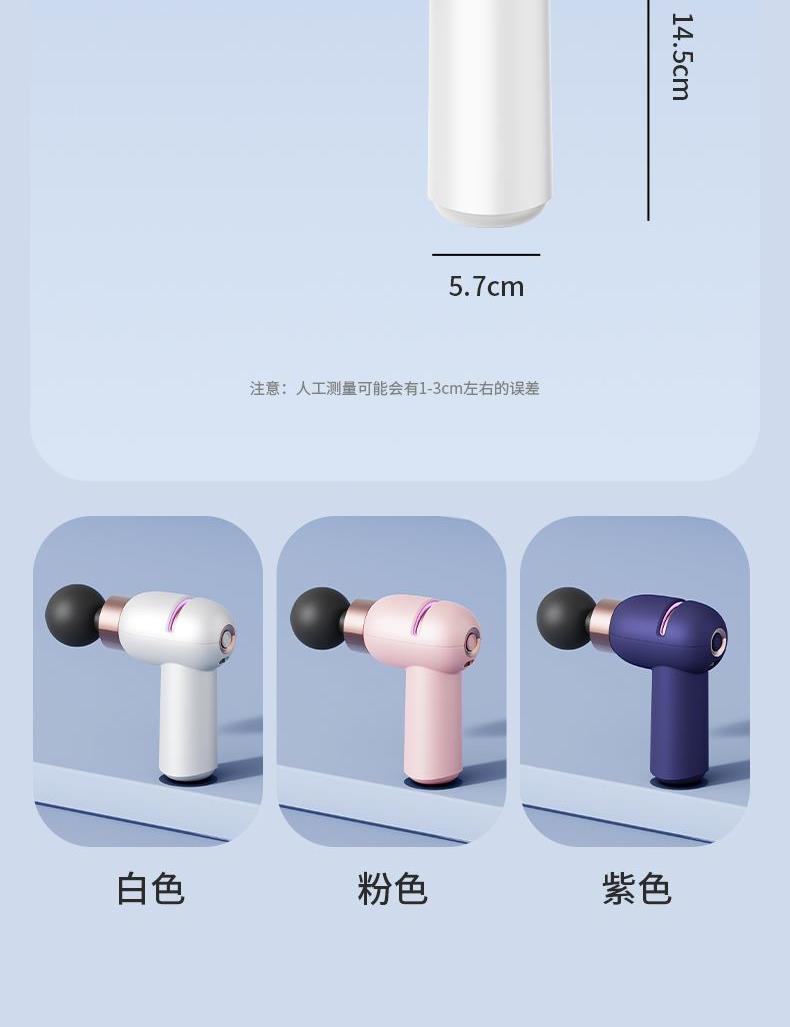 电机功率:30W 充电方式:Type-C充电 档位:6档调节 输入电压:5V 额定电压:7.4V 主材料:ABS塑料 颜色:白色、粉色、紫色 • 小巧便携,随身随行:巴掌大小,放包就走,随地给身体来个 “急救放松”。 • 持久续航,不用频繁找插座:一次充电,多天使用,出差、旅行、办公都能稳稳在线。 • 性能大跃升,力量更足更过瘾:全新升级动力系统,按下去的瞬间就能感受到 “力道到位”。 • 五档调速,想轻想重随你掌控:从轻柔唤醒到深度放松,一台搞定不同场景、不同人群。 • 低噪音运行,安静不打扰:办公室、卧室都能用,安静得像在 “悄悄变强”。 • 炫彩灯光,科技感拉满:灯光随档位变化,用起来更有仪式感,也更酷更好看。 • 强劲电机,力量输出稳定不衰减:动力澎湃、持续稳定,越用越顺手,越按越舒服。 • 7mm 深层按摩,不止于 “肤浅”:真正按到肌肉深处,缓解紧绷、酸胀,让放松更 “到位”。