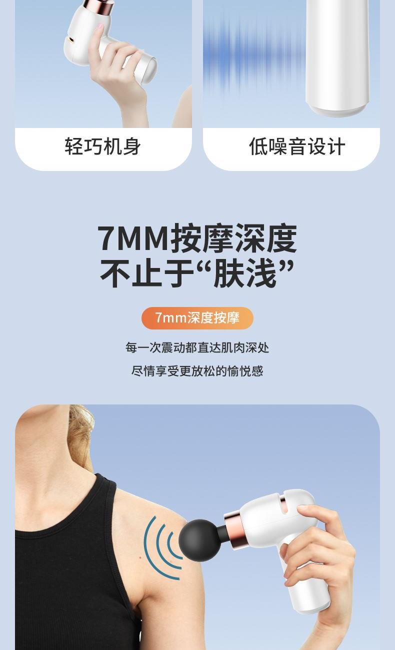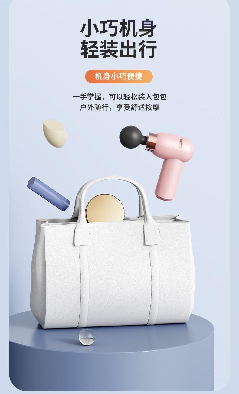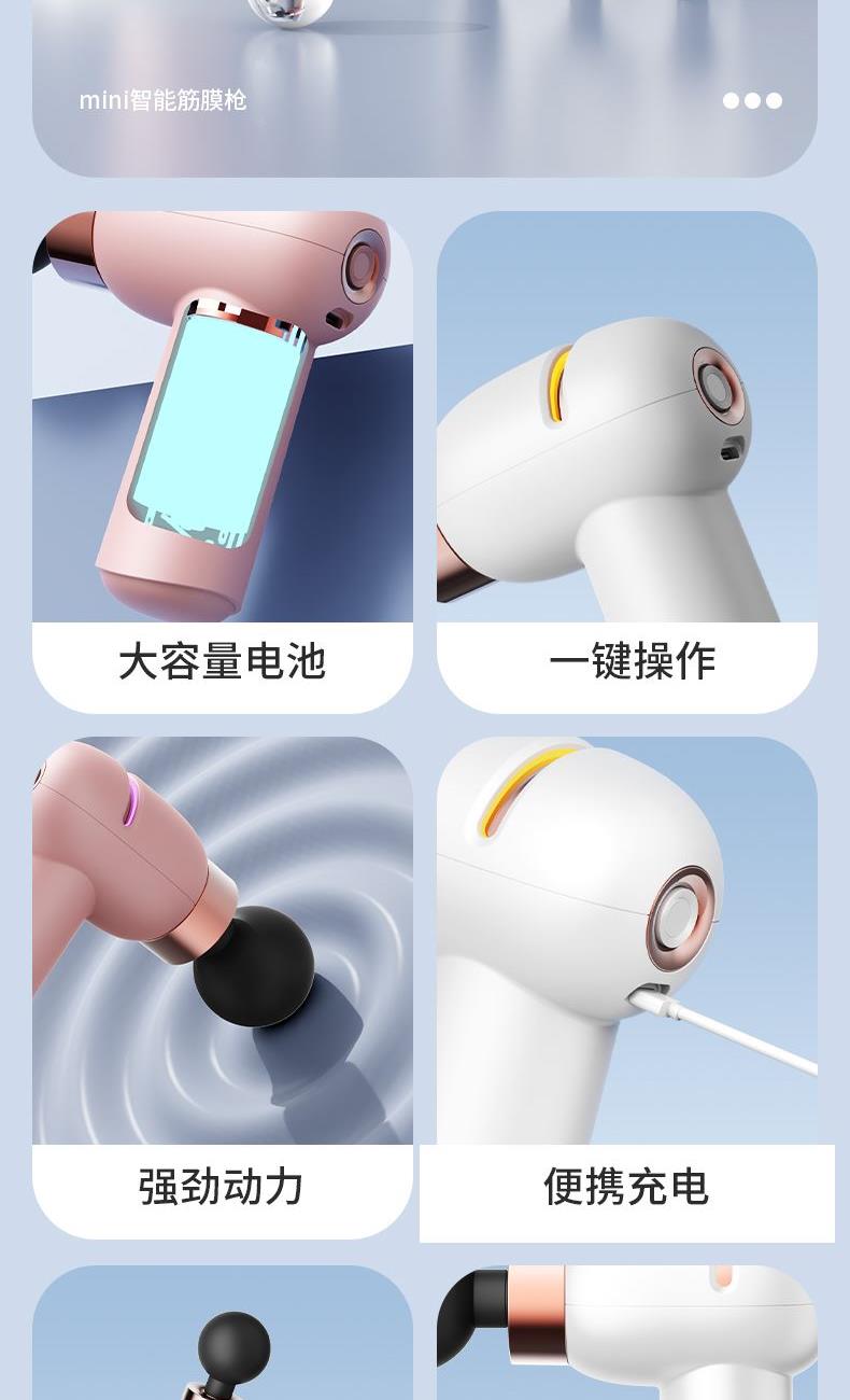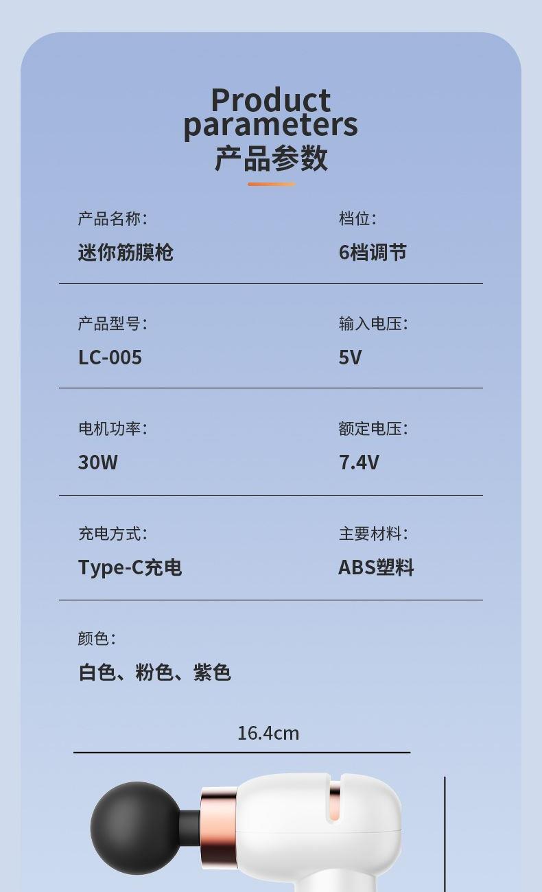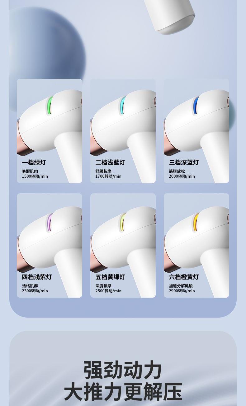 电机功率:30W 充电方式:Type-C充电 档位:6档调节 输入电压:5V 额定电压:7.4V 主材料:ABS塑料 颜色:白色、粉色、紫色 • 小巧便携,随身随行:巴掌大小,放包就走,随地给身体来个 “急救放松”。 • 持久续航,不用频繁找插座:一次充电,多天使用,出差、旅行、办公都能稳稳在线。 • 性能大跃升,力量更足更过瘾:全新升级动力系统,按下去的瞬间就能感受到 “力道到位”。 • 五档调速,想轻想重随你掌控:从轻柔唤醒到深度放松,一台搞定不同场景、不同人群。 • 低噪音运行,安静不打扰:办公室、卧室都能用,安静得像在 “悄悄变强”。 • 炫彩灯光,科技感拉满:灯光随档位变化,用起来更有仪式感,也更酷更好看。 • 强劲电机,力量输出稳定不衰减:动力澎湃、持续稳定,越用越顺手,越按越舒服。 • 7mm 深层按摩,不止于 “肤浅”:真正按到肌肉深处,缓解紧绷、酸胀,让放松更 “到位”。