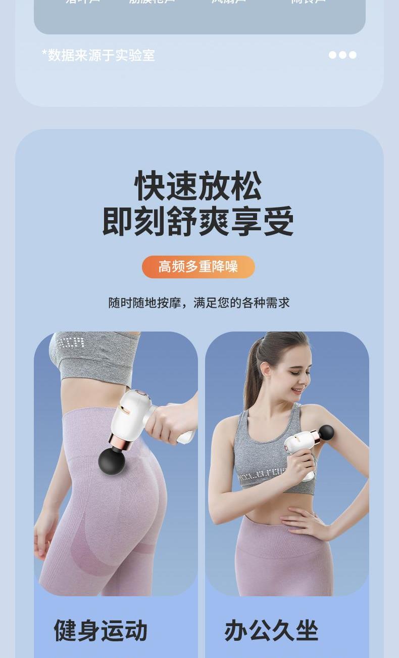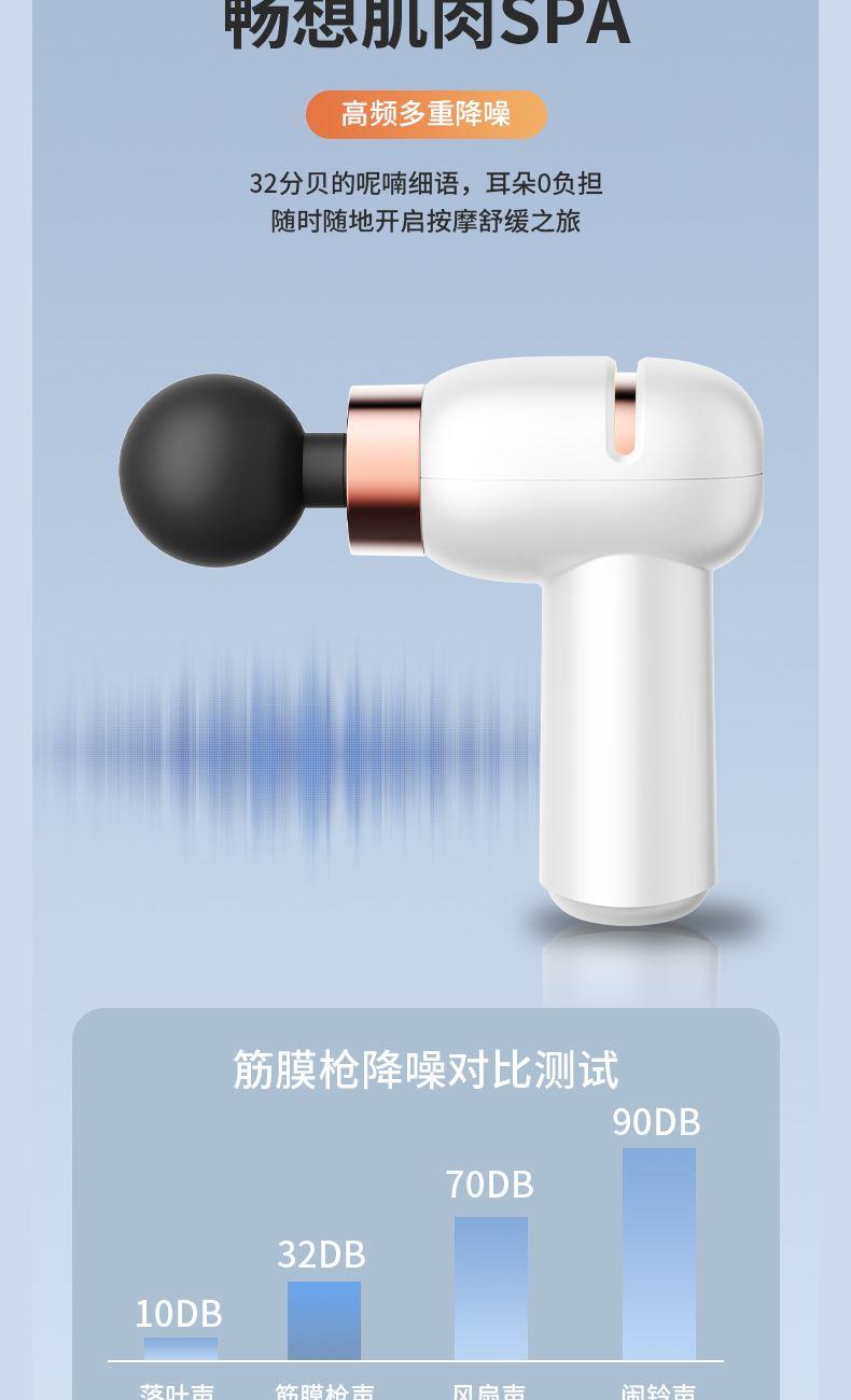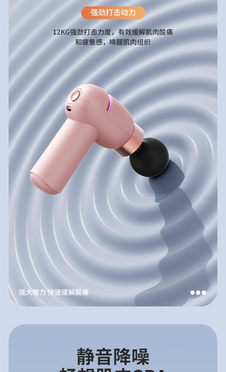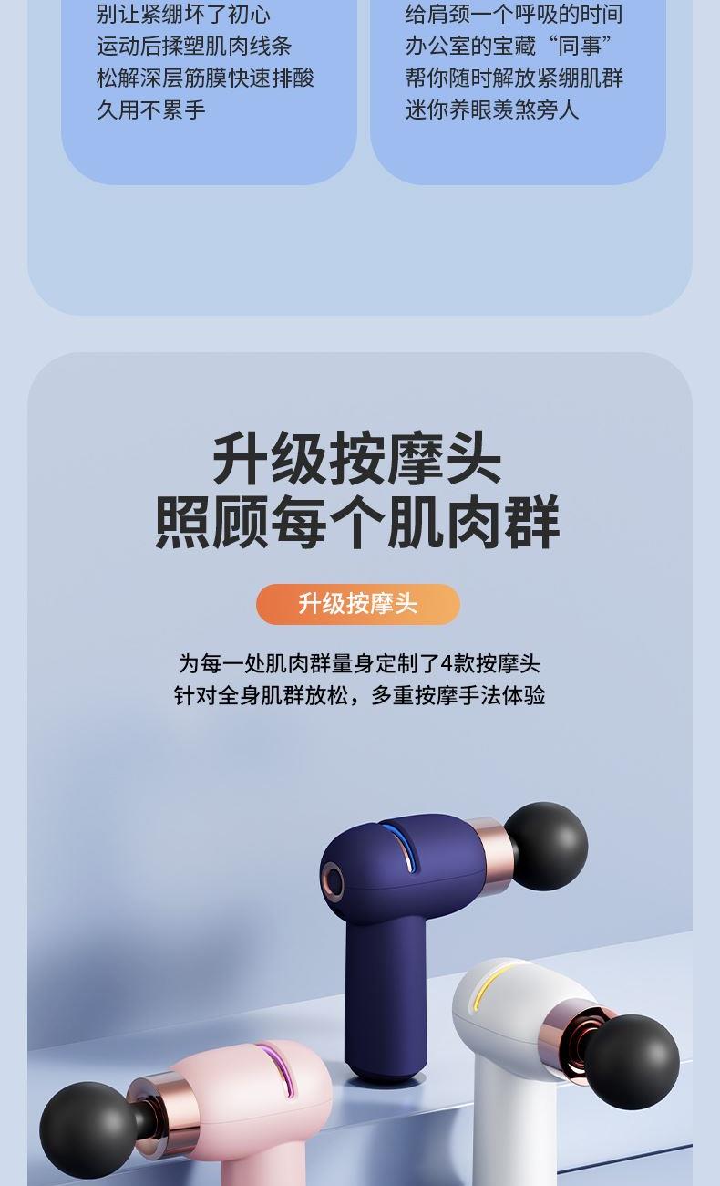 电机功率:30W 充电方式:Type-C充电 档位:6档调节 输入电压:5V 额定电压:7.4V 主材料:ABS塑料 颜色:白色、粉色、紫色 • 小巧便携,随身随行:巴掌大小,放包就走,随地给身体来个 “急救放松”。 • 持久续航,不用频繁找插座:一次充电,多天使用,出差、旅行、办公都能稳稳在线。 • 性能大跃升,力量更足更过瘾:全新升级动力系统,按下去的瞬间就能感受到 “力道到位”。 • 五档调速,想轻想重随你掌控:从轻柔唤醒到深度放松,一台搞定不同场景、不同人群。 • 低噪音运行,安静不打扰:办公室、卧室都能用,安静得像在 “悄悄变强”。 • 炫彩灯光,科技感拉满:灯光随档位变化,用起来更有仪式感,也更酷更好看。 • 强劲电机,力量输出稳定不衰减:动力澎湃、持续稳定,越用越顺手,越按越舒服。 • 7mm 深层按摩,不止于 “肤浅”:真正按到肌肉深处,缓解紧绷、酸胀,让放松更 “到位”。