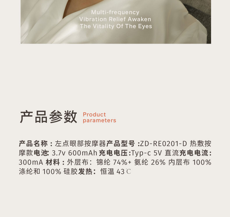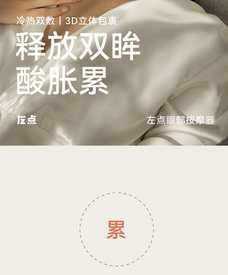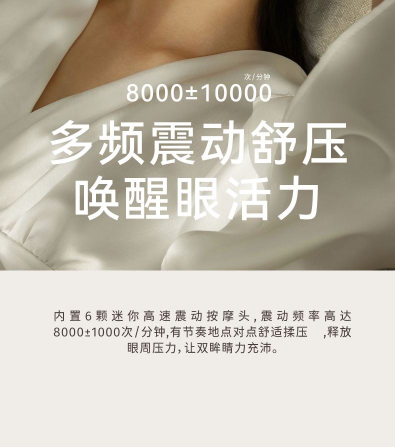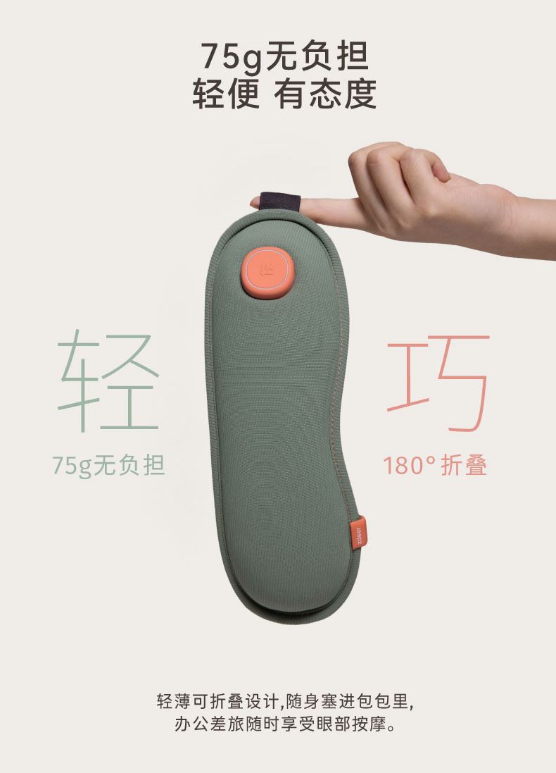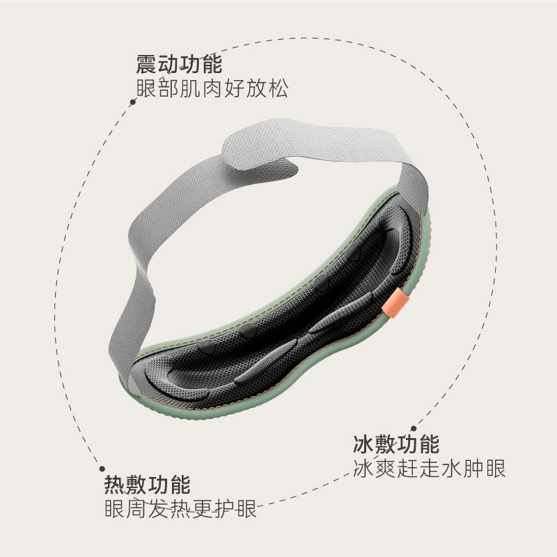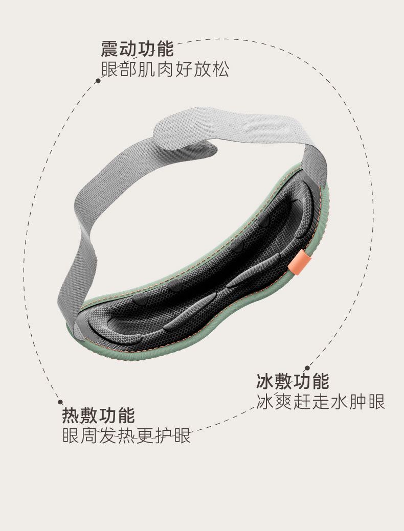 ● 支持43℃恒温热敷+冰爽冷敷功能,冷热双敷给您舒缓护目体验,更享震动按摩体验,一机多能,享受全面 ●眼部按摩器采用亲肤布料材质,柔软舒服更轻便哦,3D环绕、立体包裹,尽情释放双眼酸胀;同时,全机净重75g无负担,轻巧便携 ● 内置6颗迷你高速振动按摩头,振动频率高达8000±1000次/分钟,有节奏地对点舒缓揉压,力度适当地释放眼周压力,让双眼睛力充沛。
